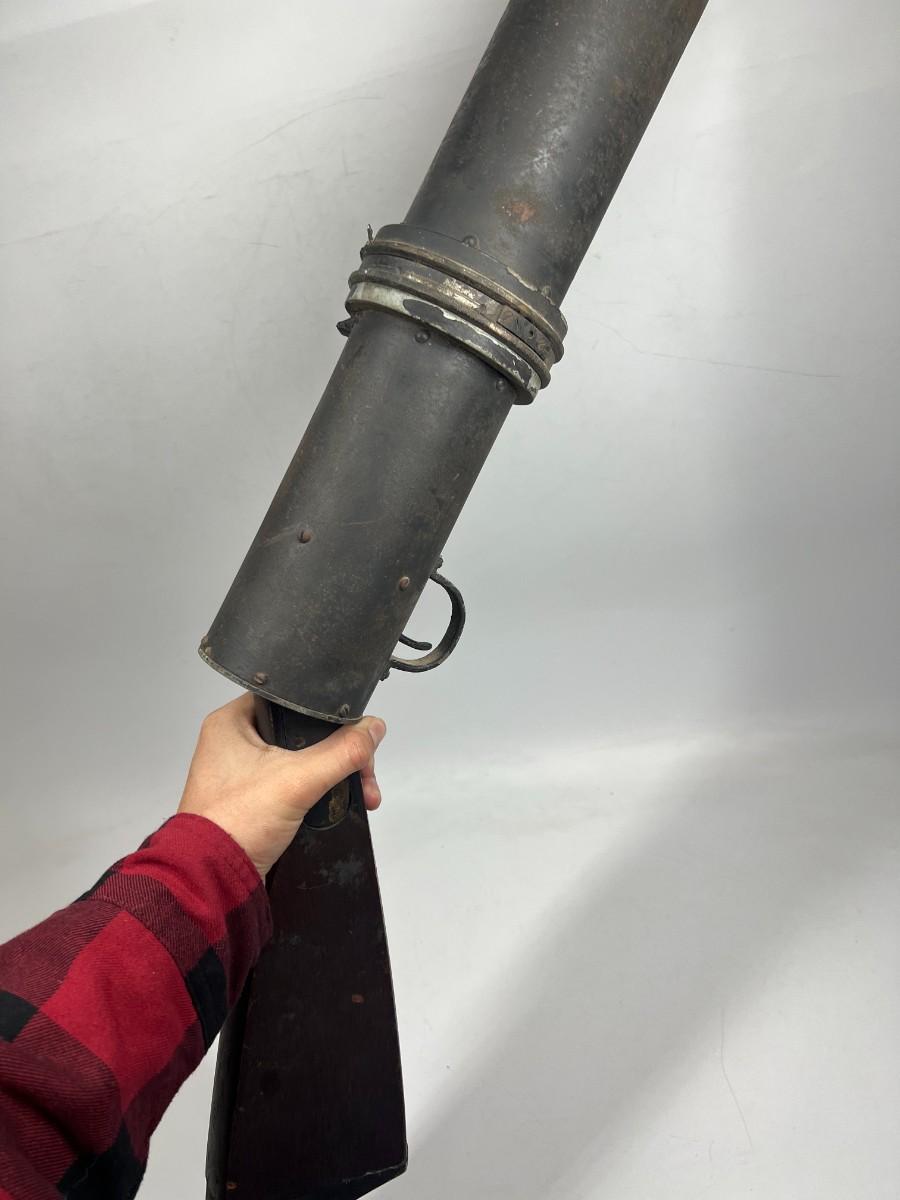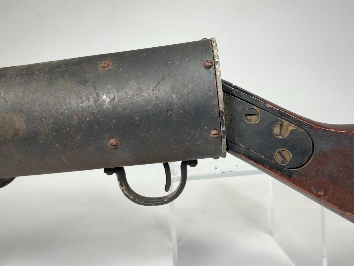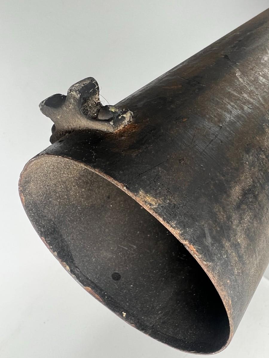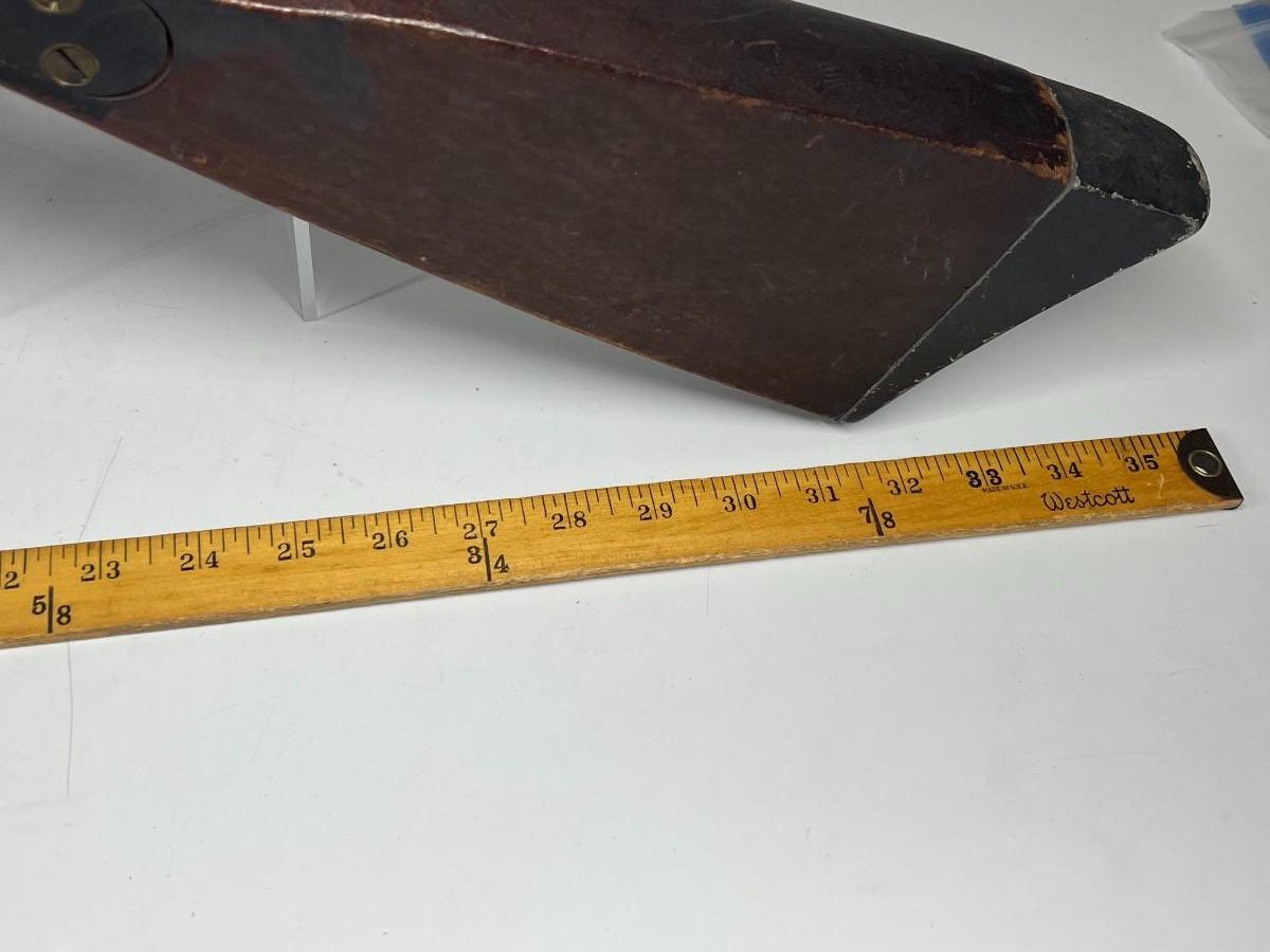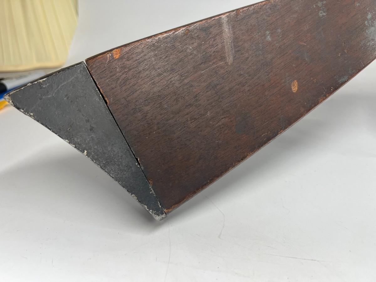 There is vintage wear to the metal & wood, but there is no significant damage and is in good displayable condition. The barrel can be unscrewed to get to the light bulb. The light bulb does not turn on, check pictures for more details and for sizing.