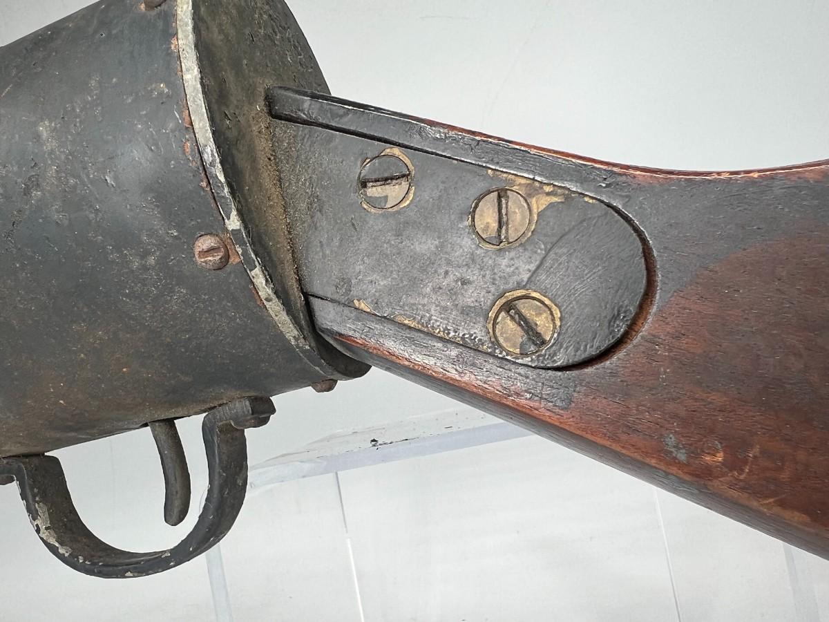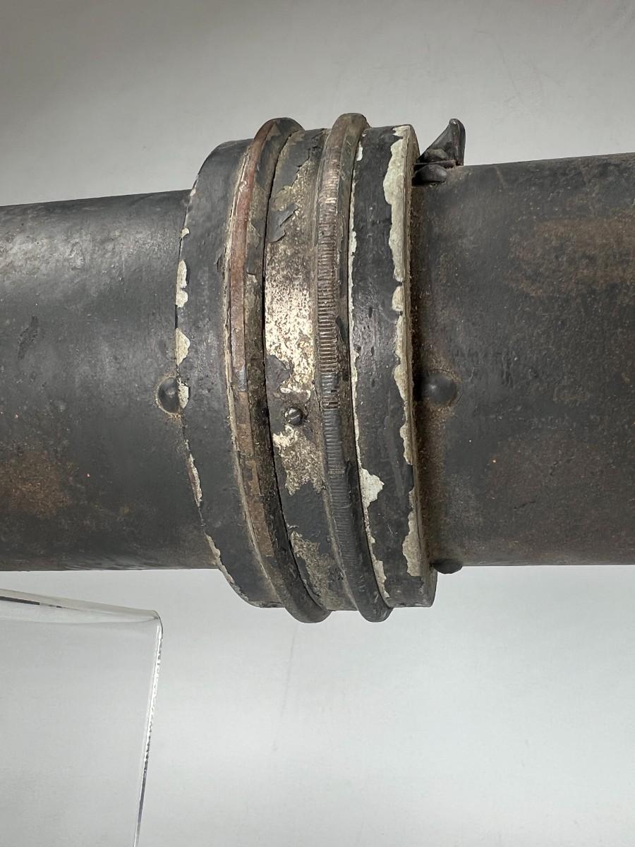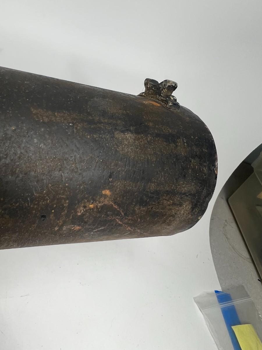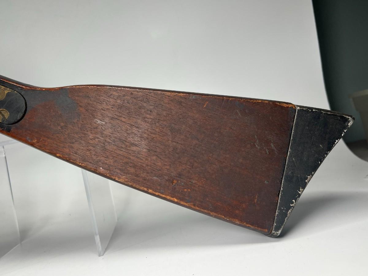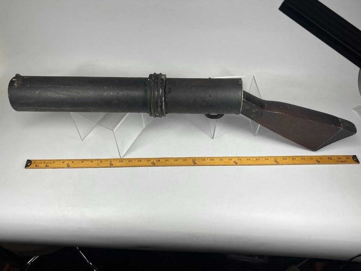 There is vintage wear to the metal & wood, but there is no significant damage and is in good displayable condition. The barrel can be unscrewed to get to the light bulb. The light bulb does not turn on, check pictures for more details and for sizing.