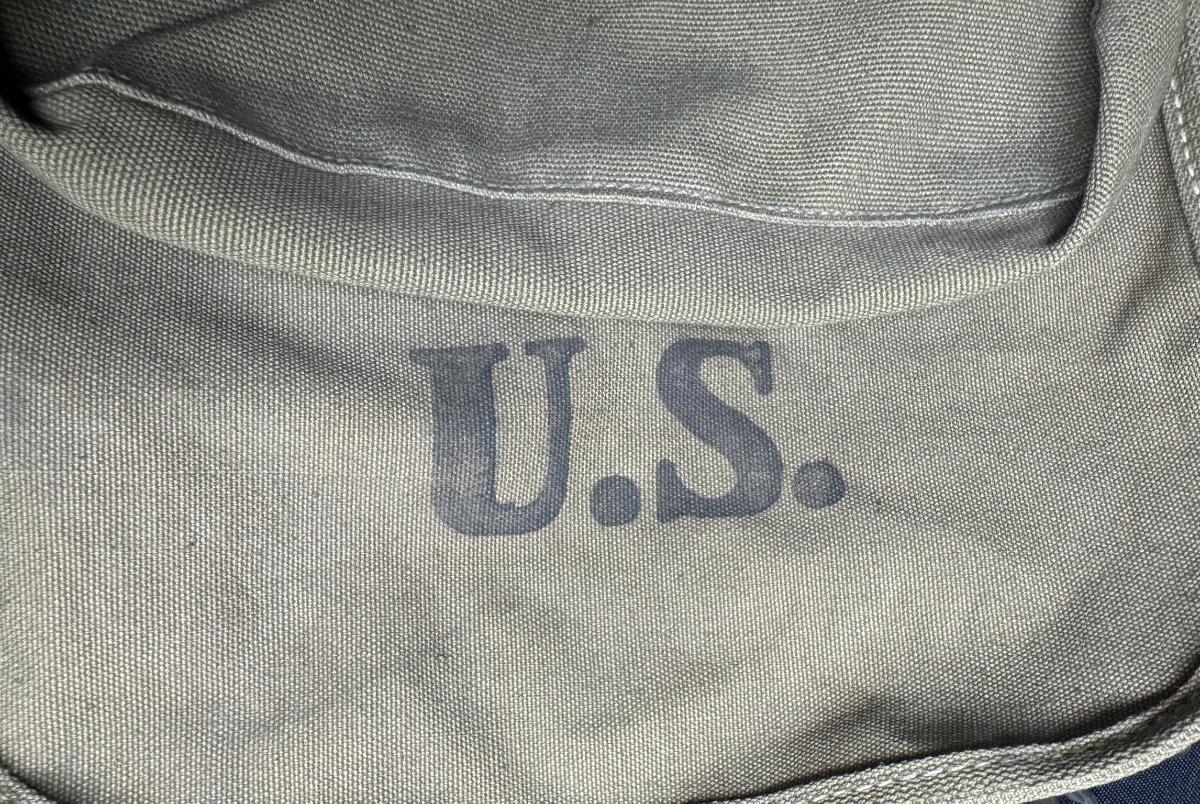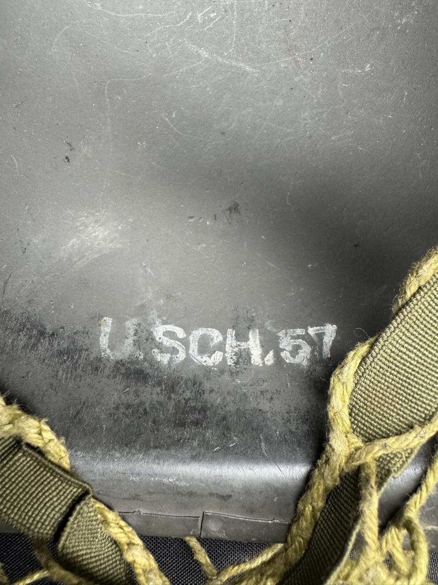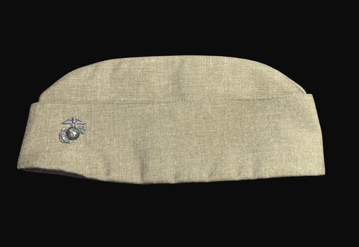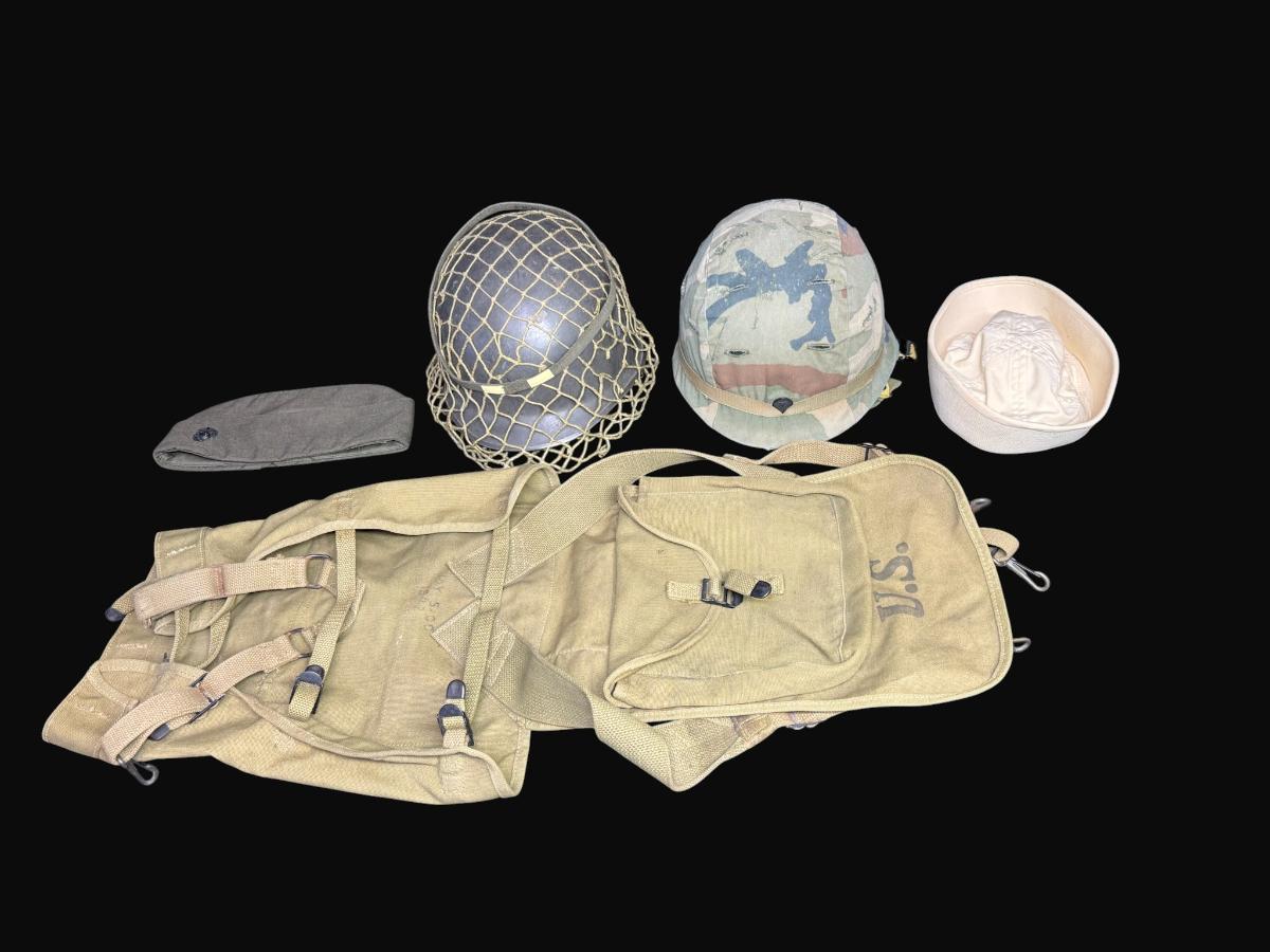 Includes two Korean/Vietnam Era helmets with liners, a USMC flight cap, a USN "Dixie Cup" hat, and a WWII Era Haversack. Total of five pieces. Age related wear. [JP]