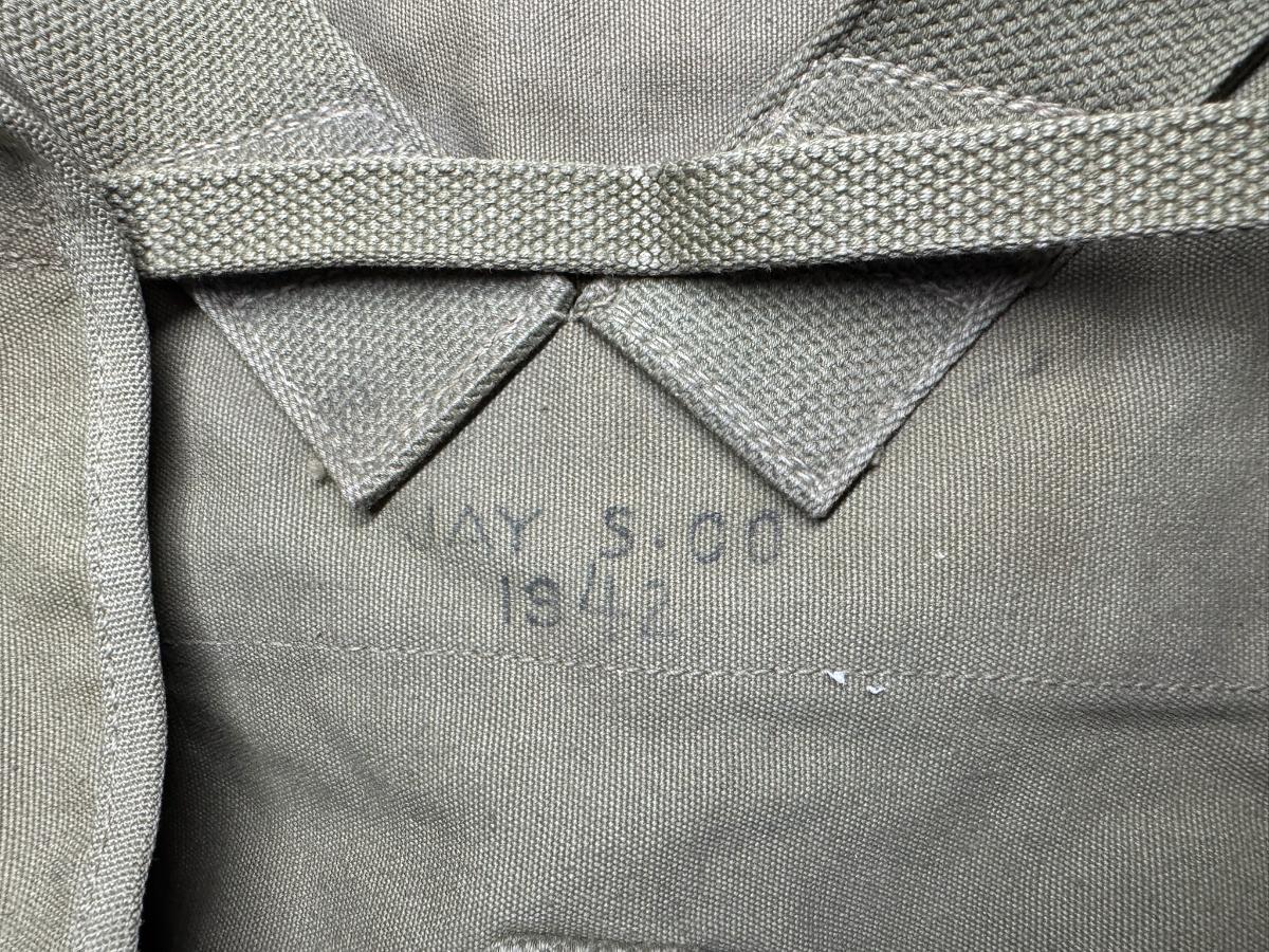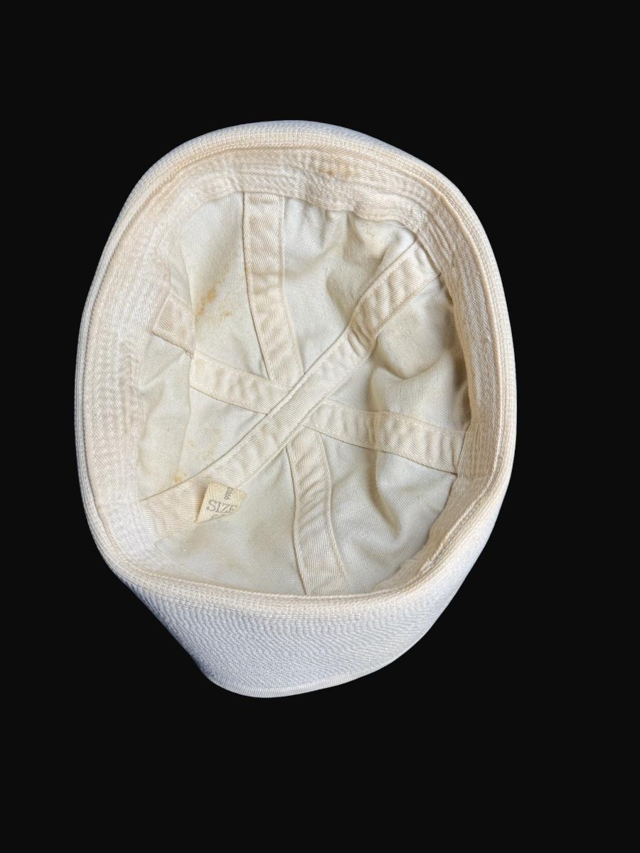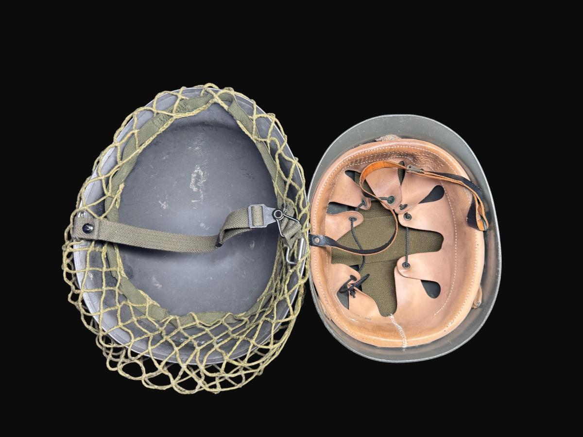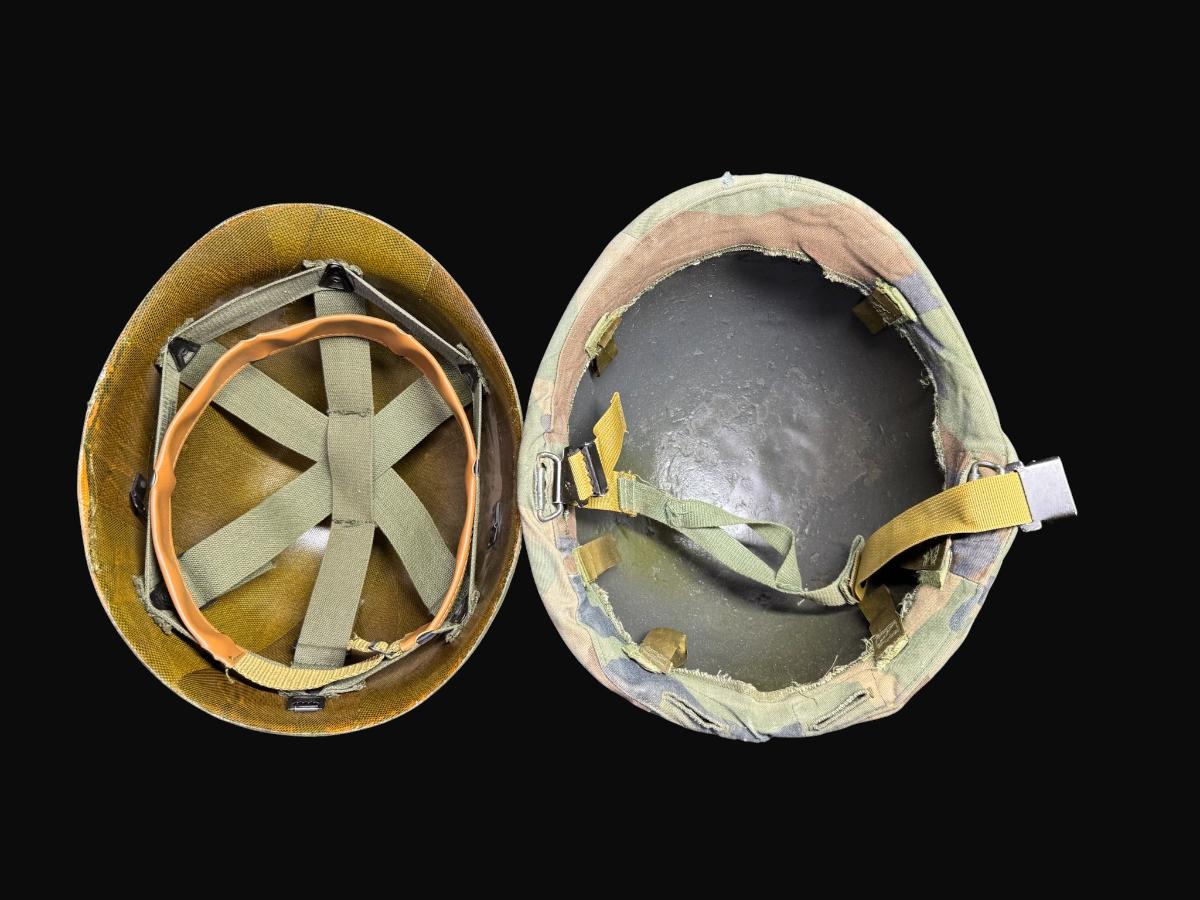 Includes two Korean/Vietnam Era helmets with liners, a USMC flight cap, a USN "Dixie Cup" hat, and a WWII Era Haversack. Total of five pieces. Age related wear. [JP]