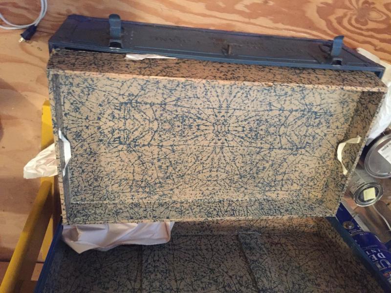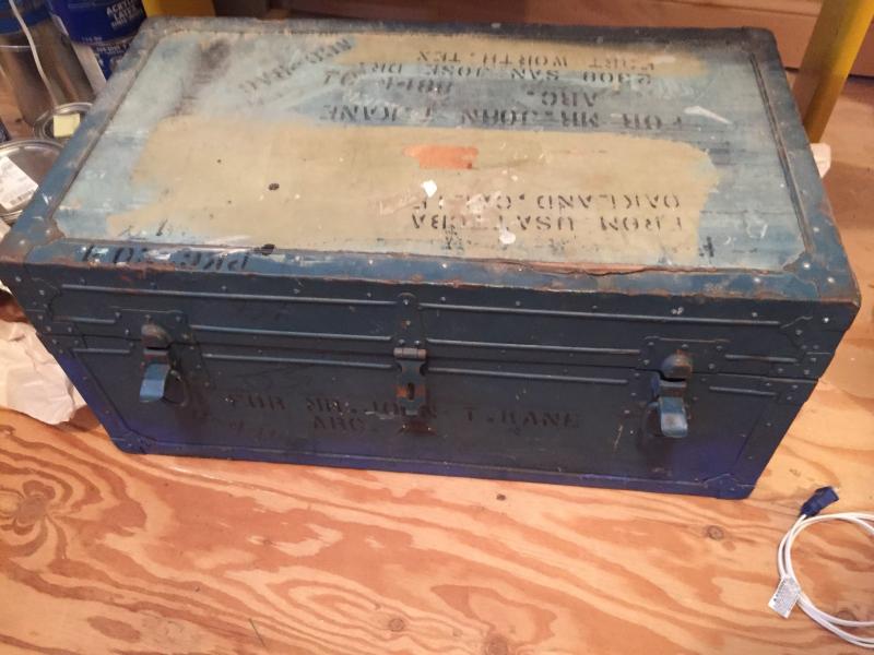 Very nice military trunk painted blue with stenciled labeling on the top. Interior tray. 17" x 30" x 13 1/2"H