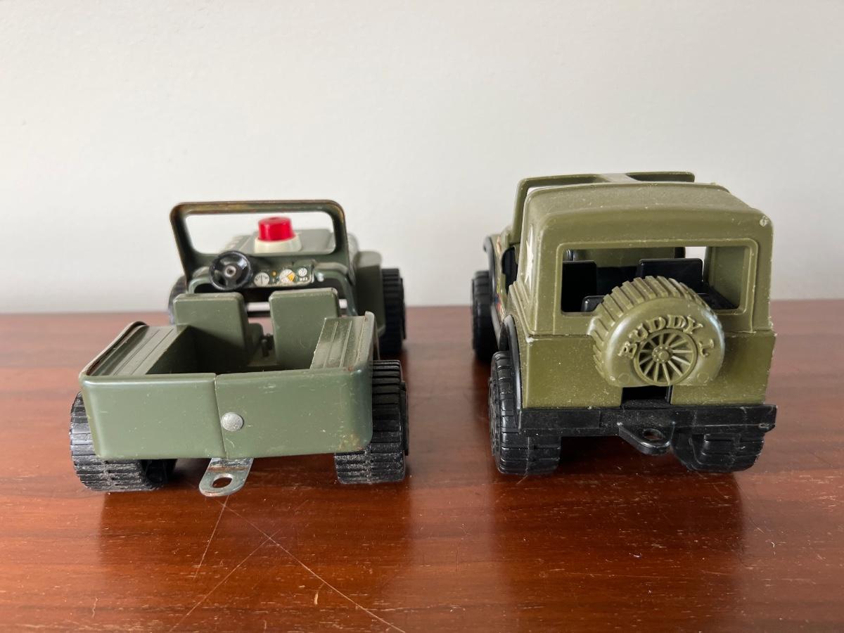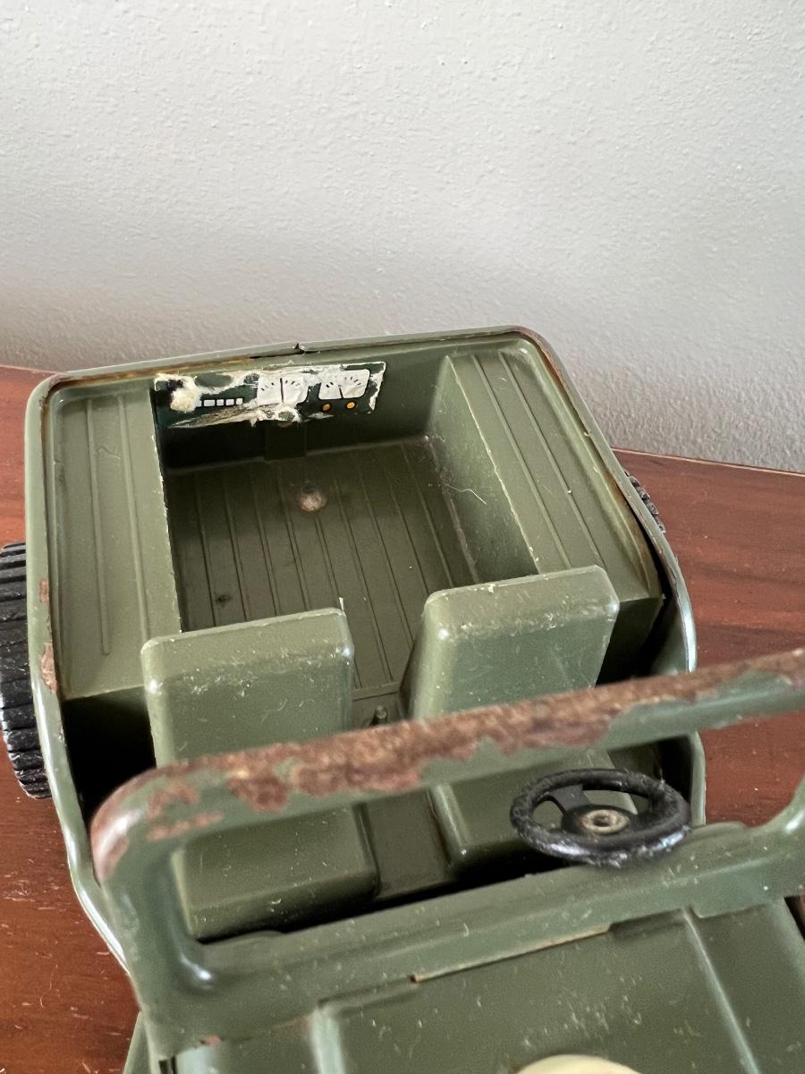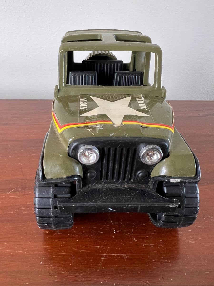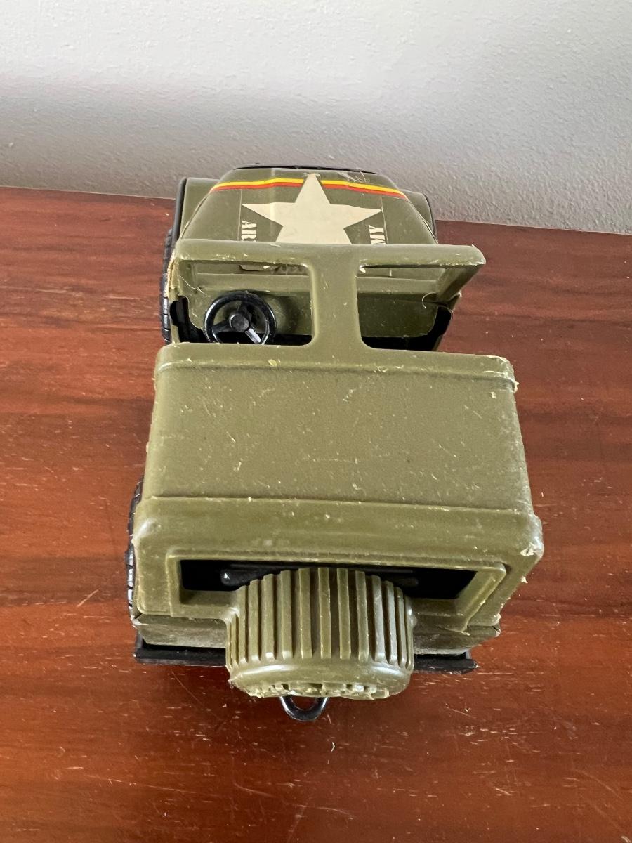 MILITARY VEHICLE TIN TOY measures 3 inches tall 6 1/2 inches deep 4 inches wide. Vintage Buddy L Army T-5278 Toy Truck Jeep, 1970s heavy duty plastic. Measure 6 inches deep 3 1/2 wide 4 inches tall.
