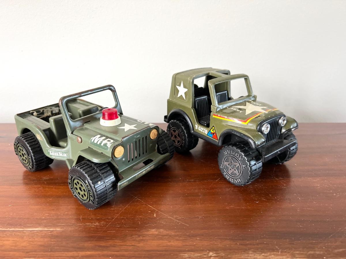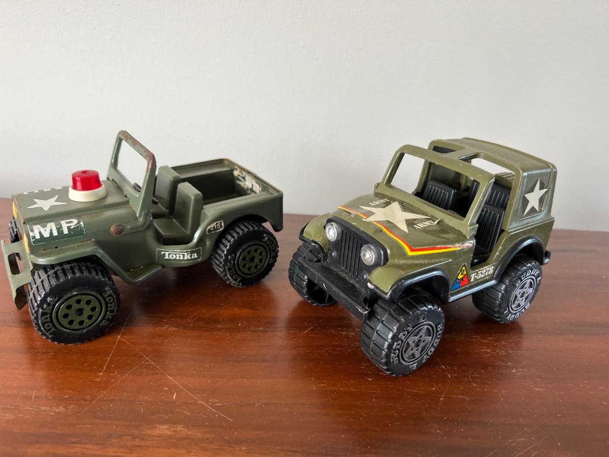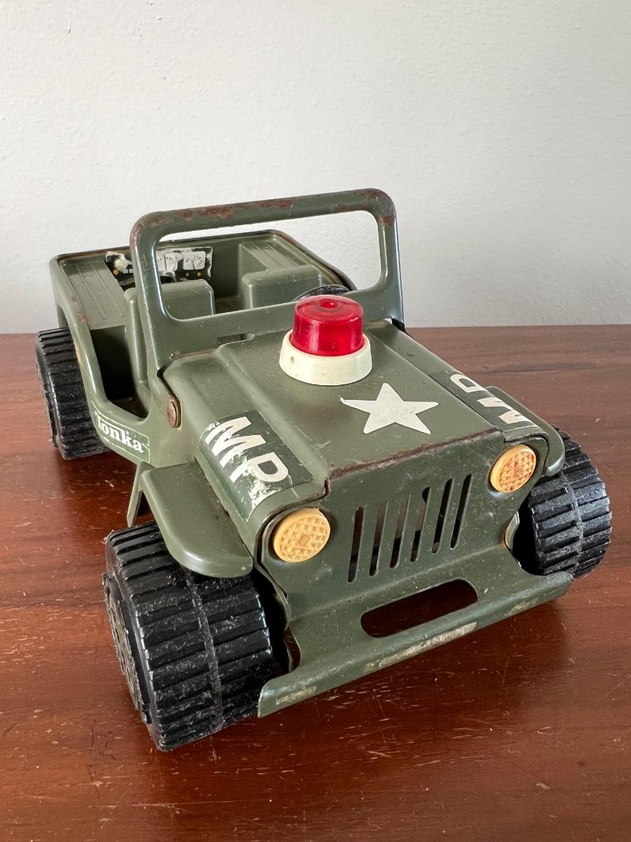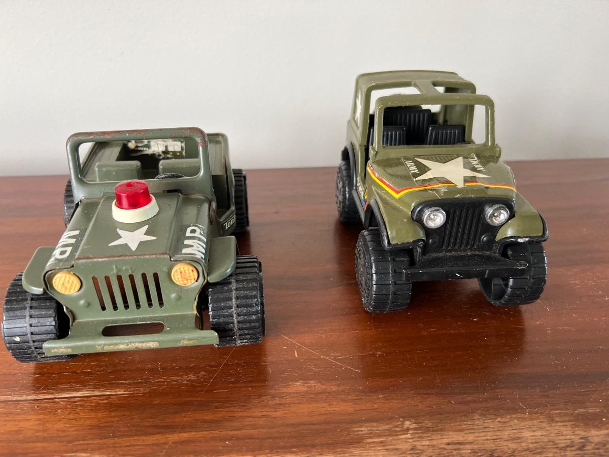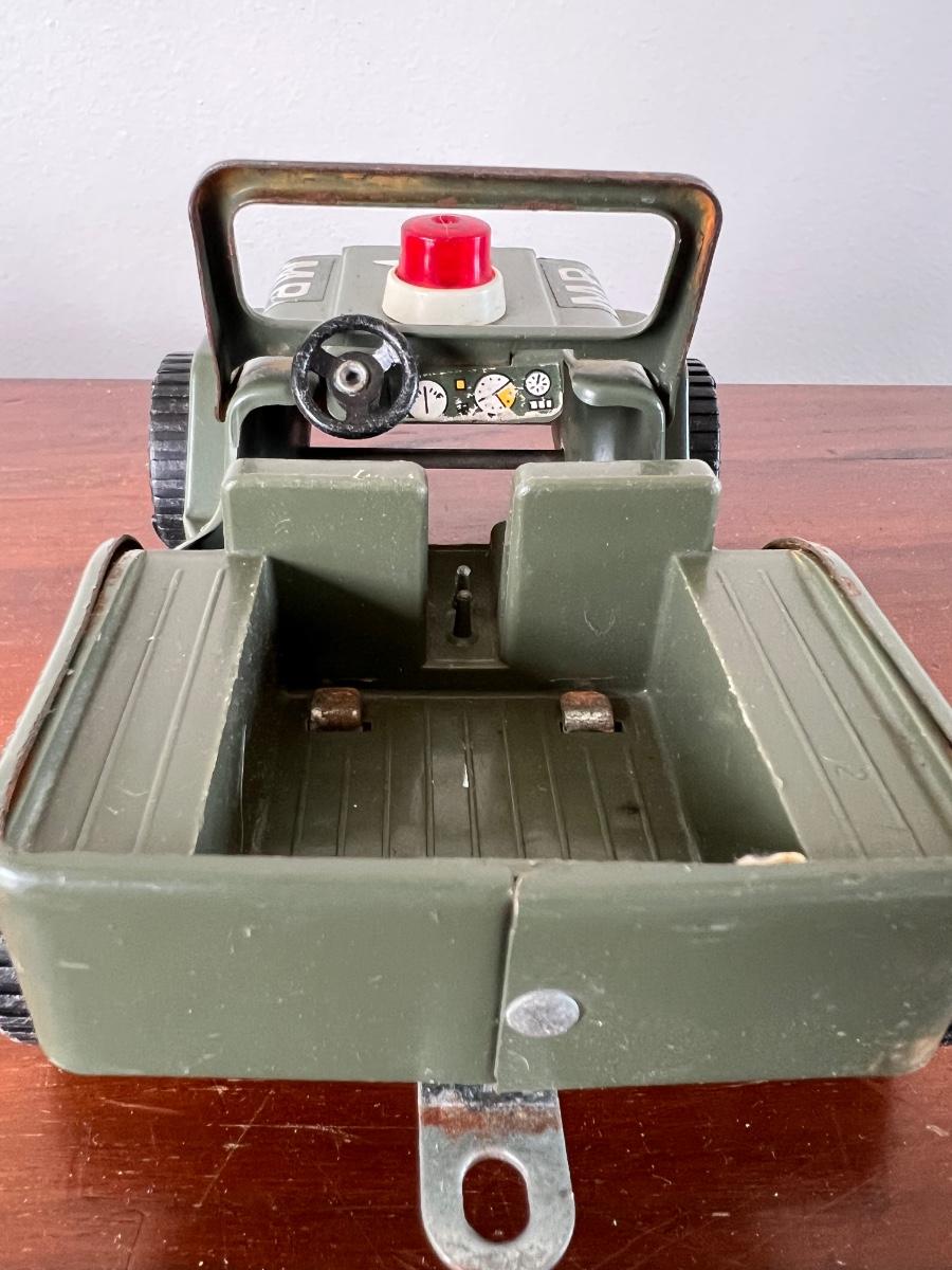 MILITARY VEHICLE TIN TOY measures 3 inches tall 6 1/2 inches deep 4 inches wide. Vintage Buddy L Army T-5278 Toy Truck Jeep, 1970s heavy duty plastic. Measure 6 inches deep 3 1/2 wide 4 inches tall.