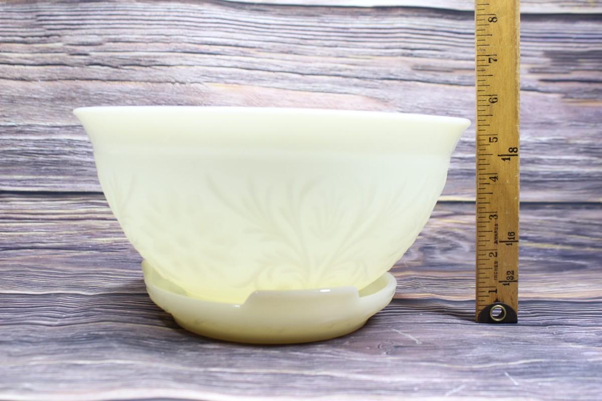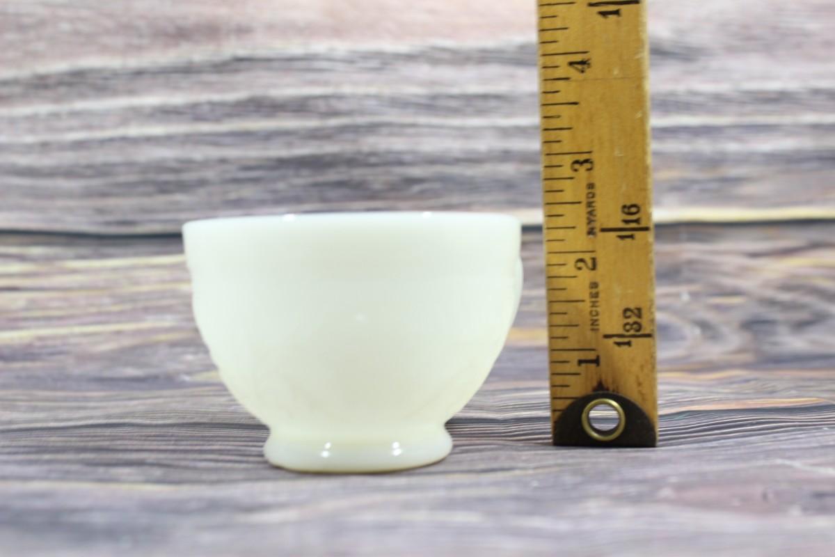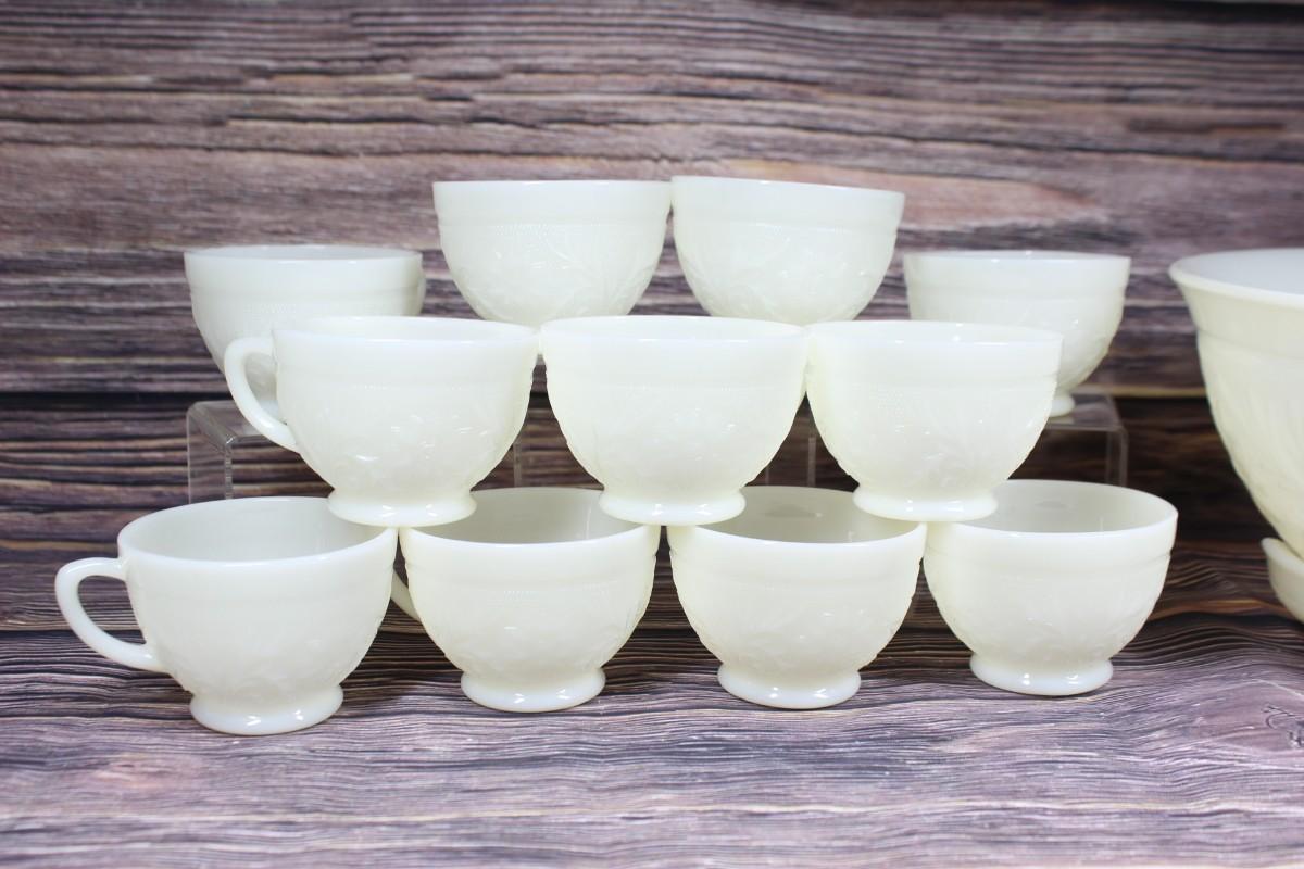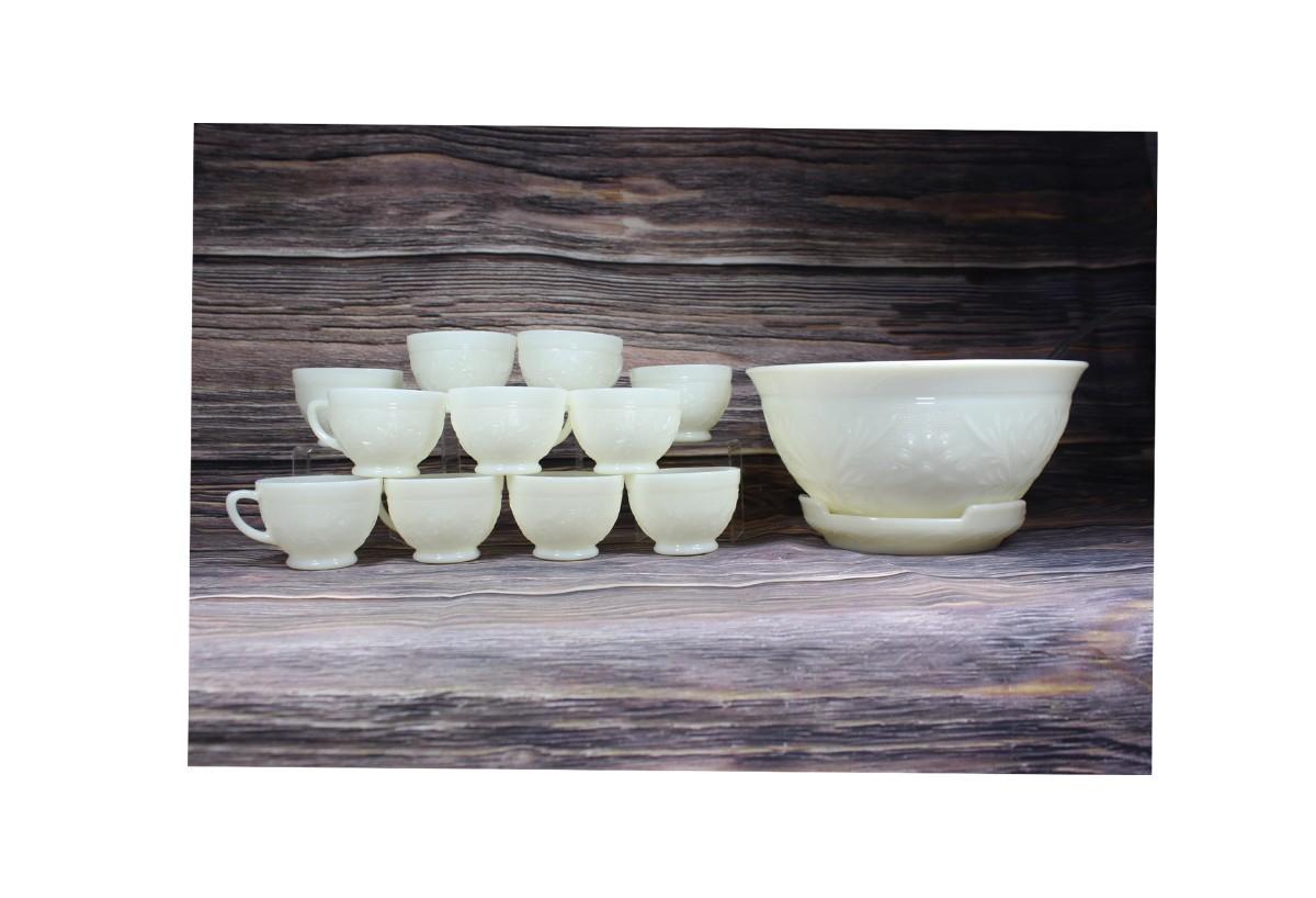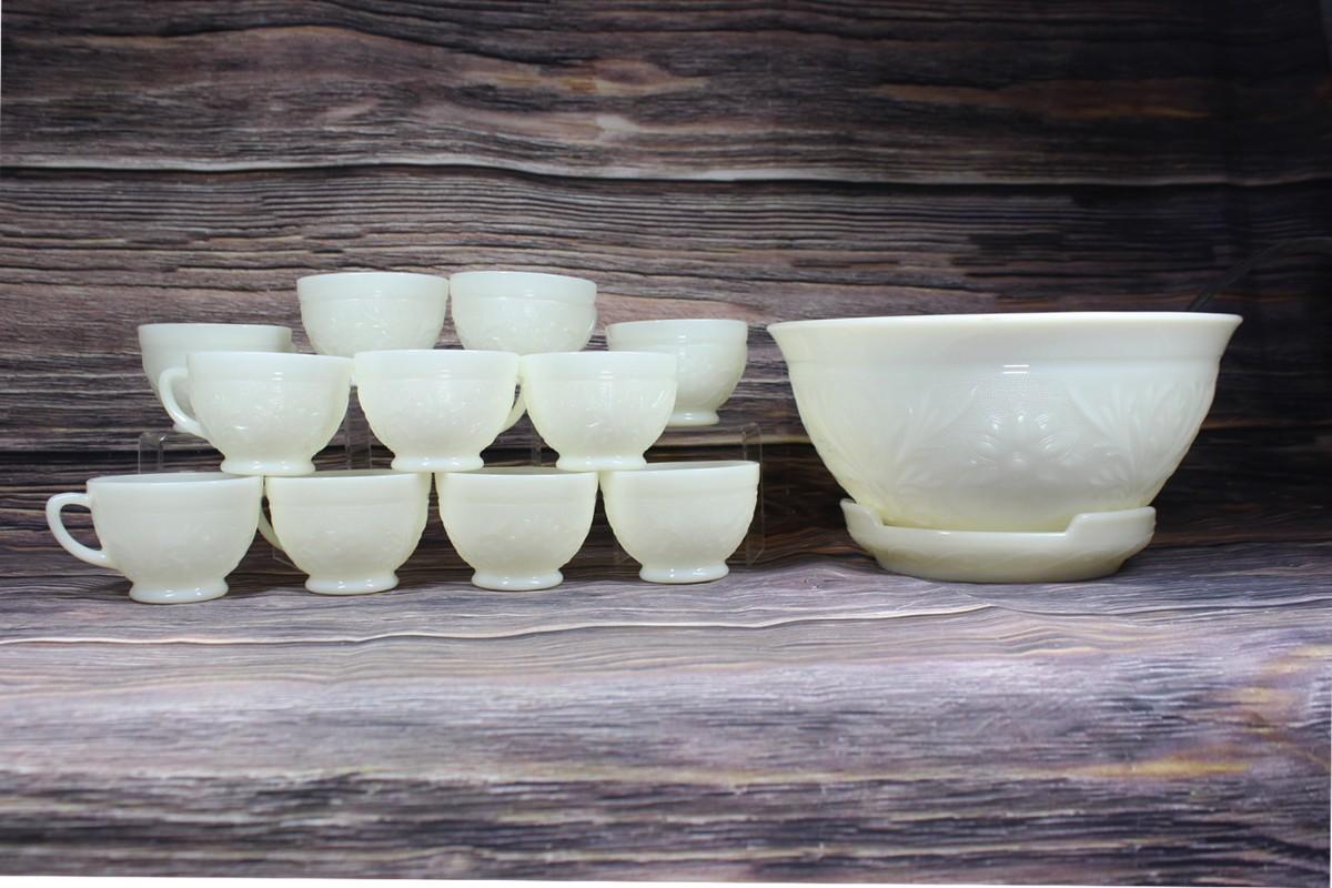 Vintage Milk Glass Flower Design Punch Bowl and Cups Set, there are no significant cracks or chips to the milk glass set and is in good condition. Check pictures for more details and for sizing. The set includes 1 milk glass punch bowl, 11 milk glass cups, a plastic serving ladle, and a milk glass plate.