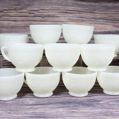 Vintage Milk Glass Flower Design Punch Bowl and Cups Set, there are no significant cracks or chips to the milk glass set and is in good condition. Check pictures for more details and for sizing. The set includes 1 milk glass punch bowl, 11 milk glass cups, a plastic serving ladle, and a milk glass plate.