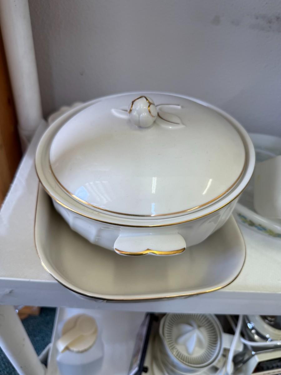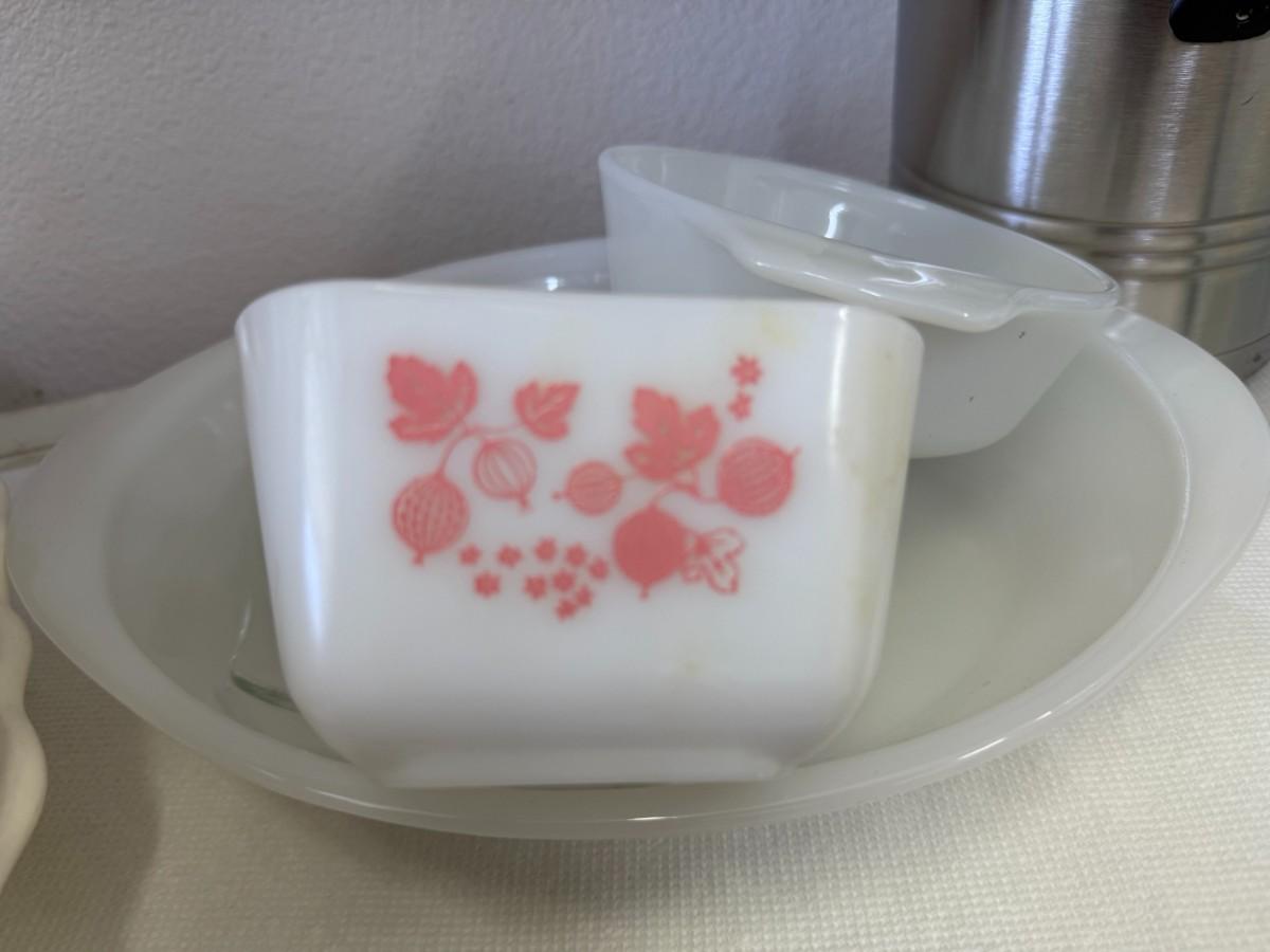 A delightful vintage milk glass Glasbake casserole dish with a lovely blueberry pattern, paired with a Gooseberry Pyrex piece, perfect for baking and serving