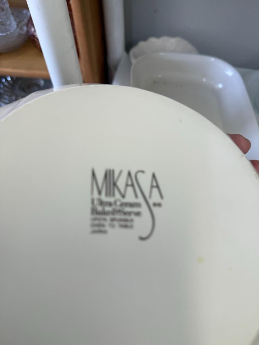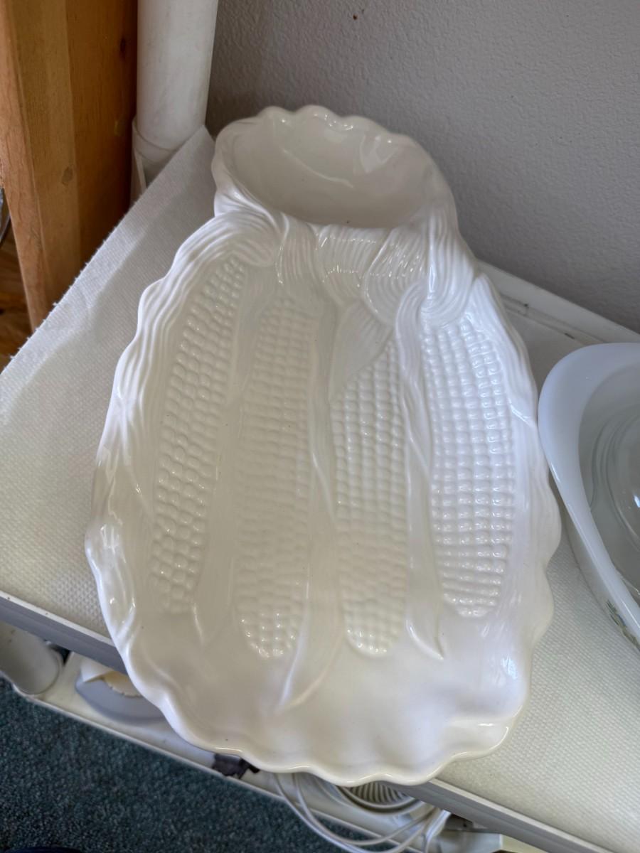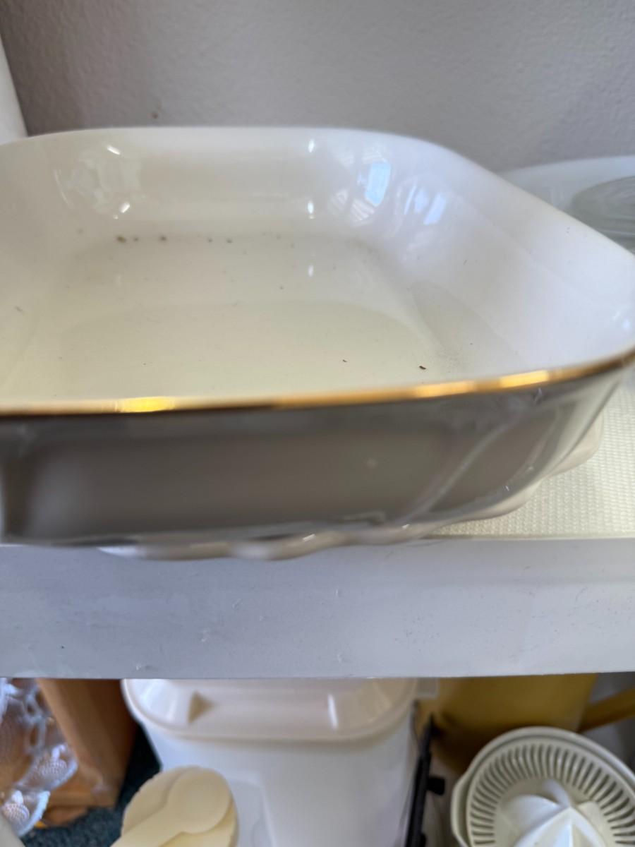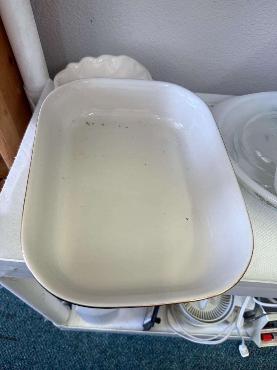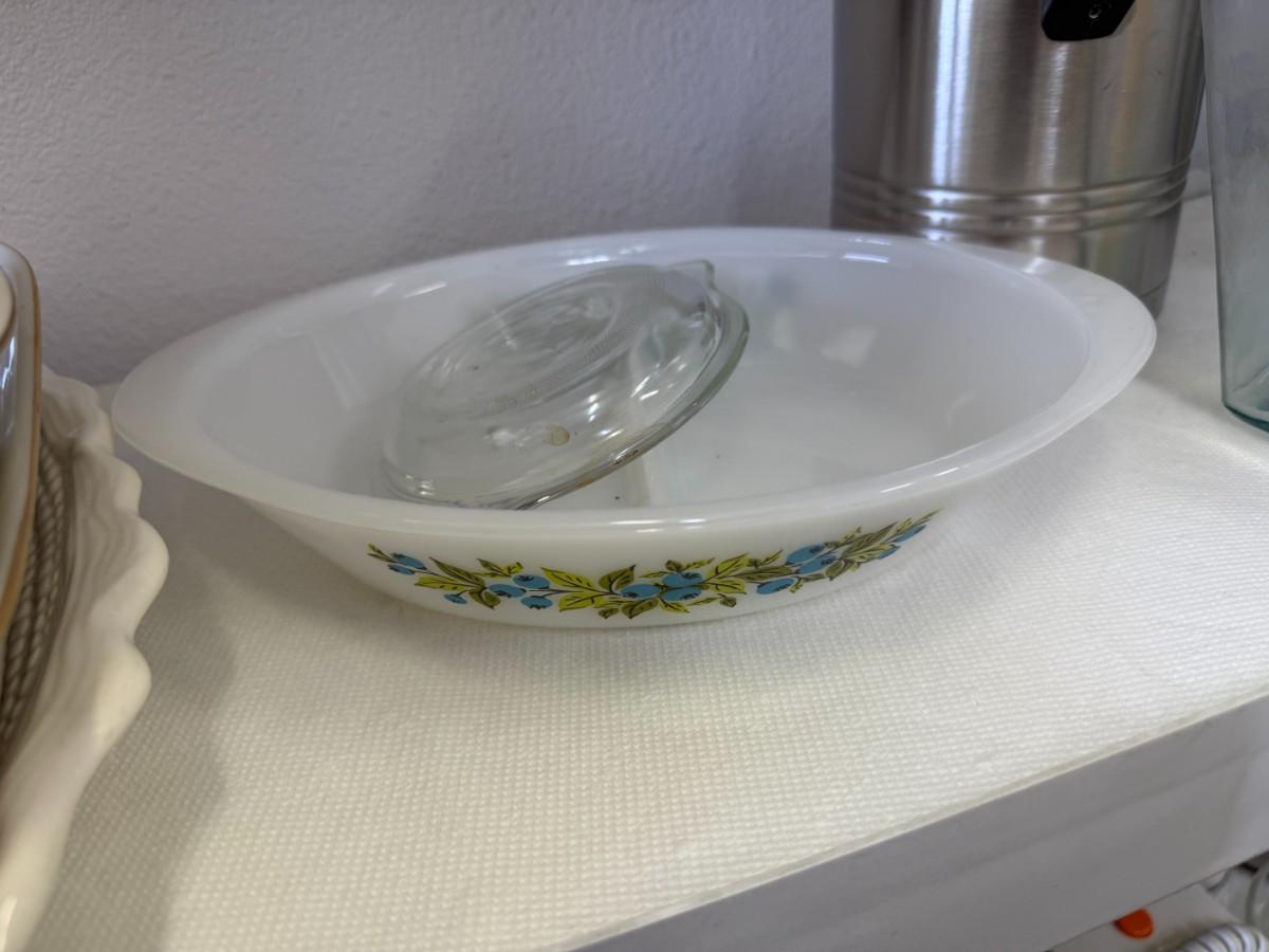 Vintage Milk Glass GLASBAKE J235 Casserole 2 quart oval Blueberry Pattern USA and Vintage Gooseberry Pyrex