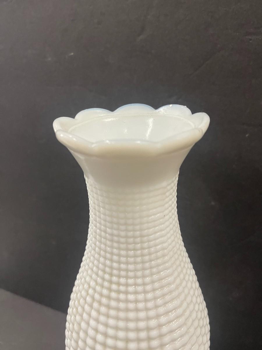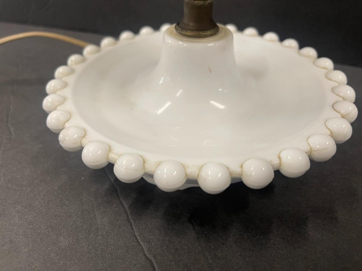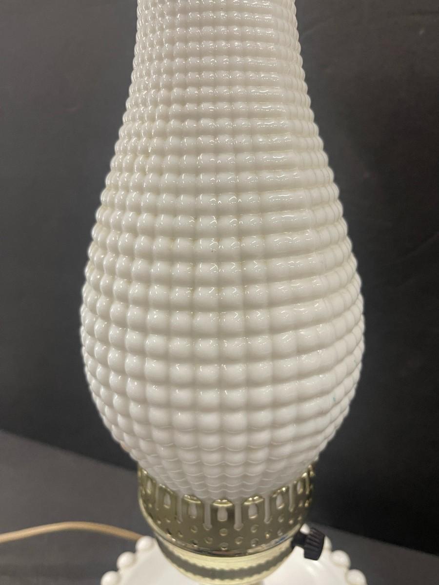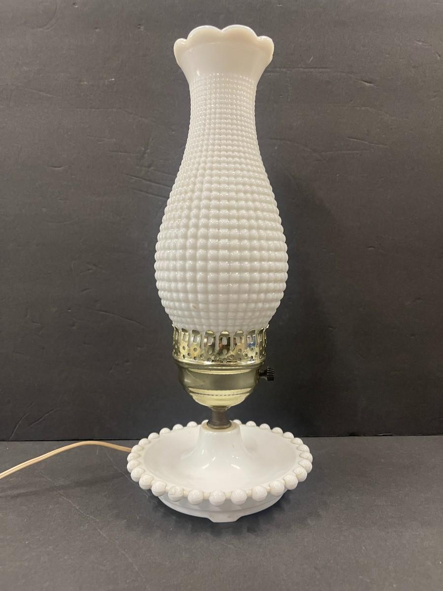 Vintage milk glass lamp. Glass is all in excellent shape with no chips, cracks or repairs. Untested. 14 1/4" x 6" wide at the base.