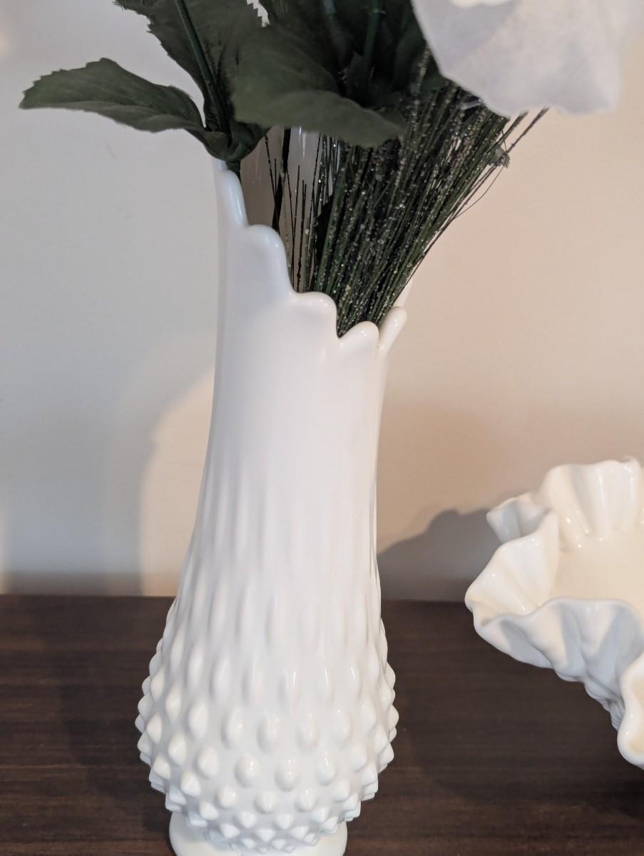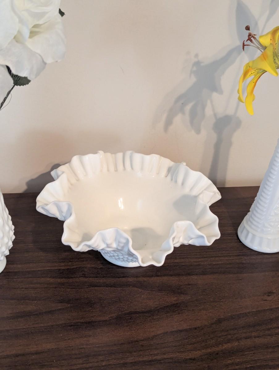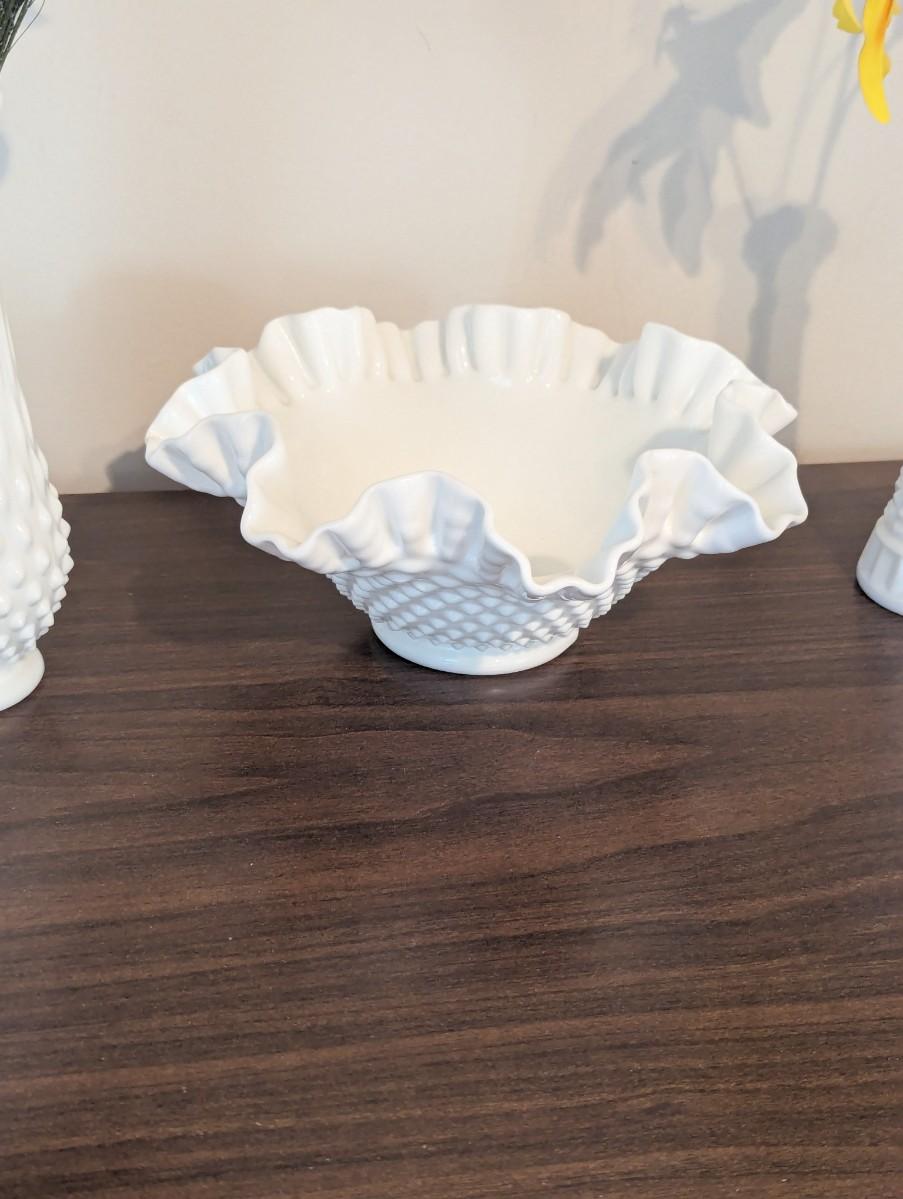 Vintage Milk Glass Vase Fenton Hobnail Ruffled Edge Bowl