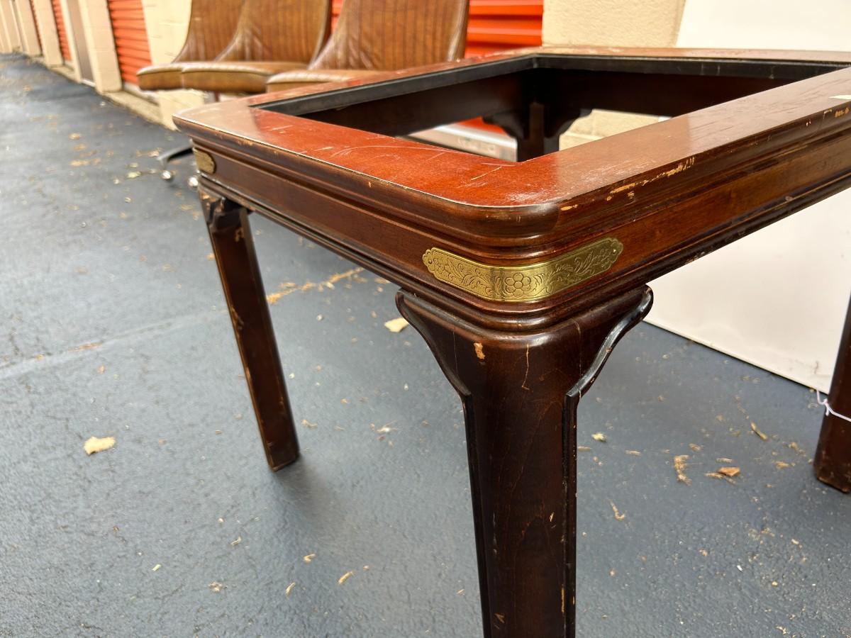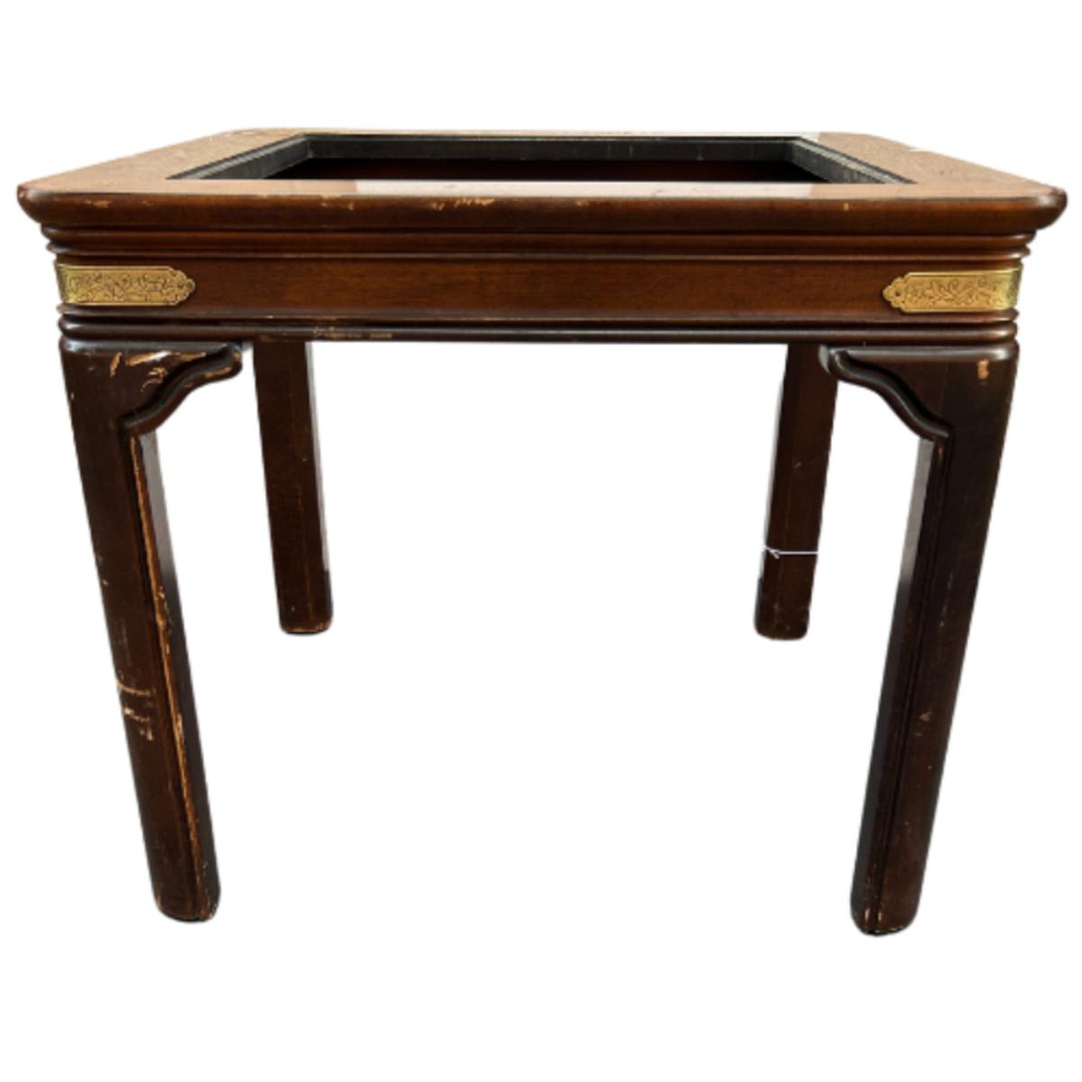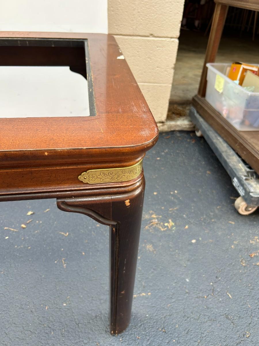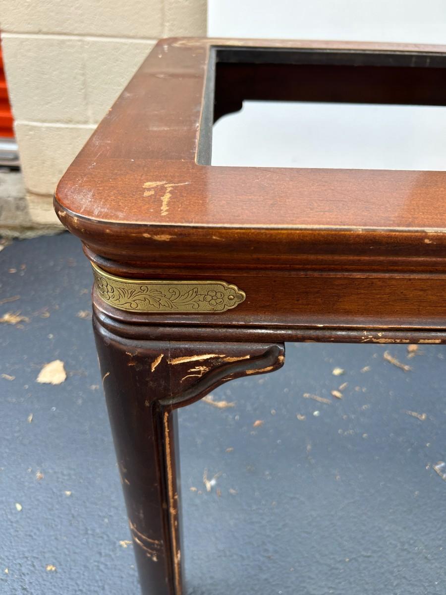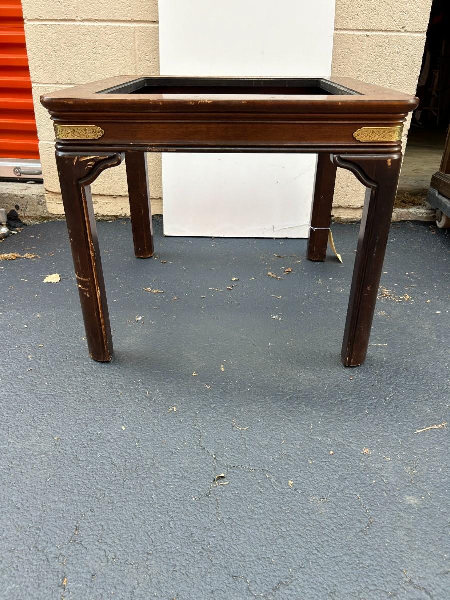 Beautiful Chinoiserie style end table with detailed design and metal corner detail. Ready for your glass top.
