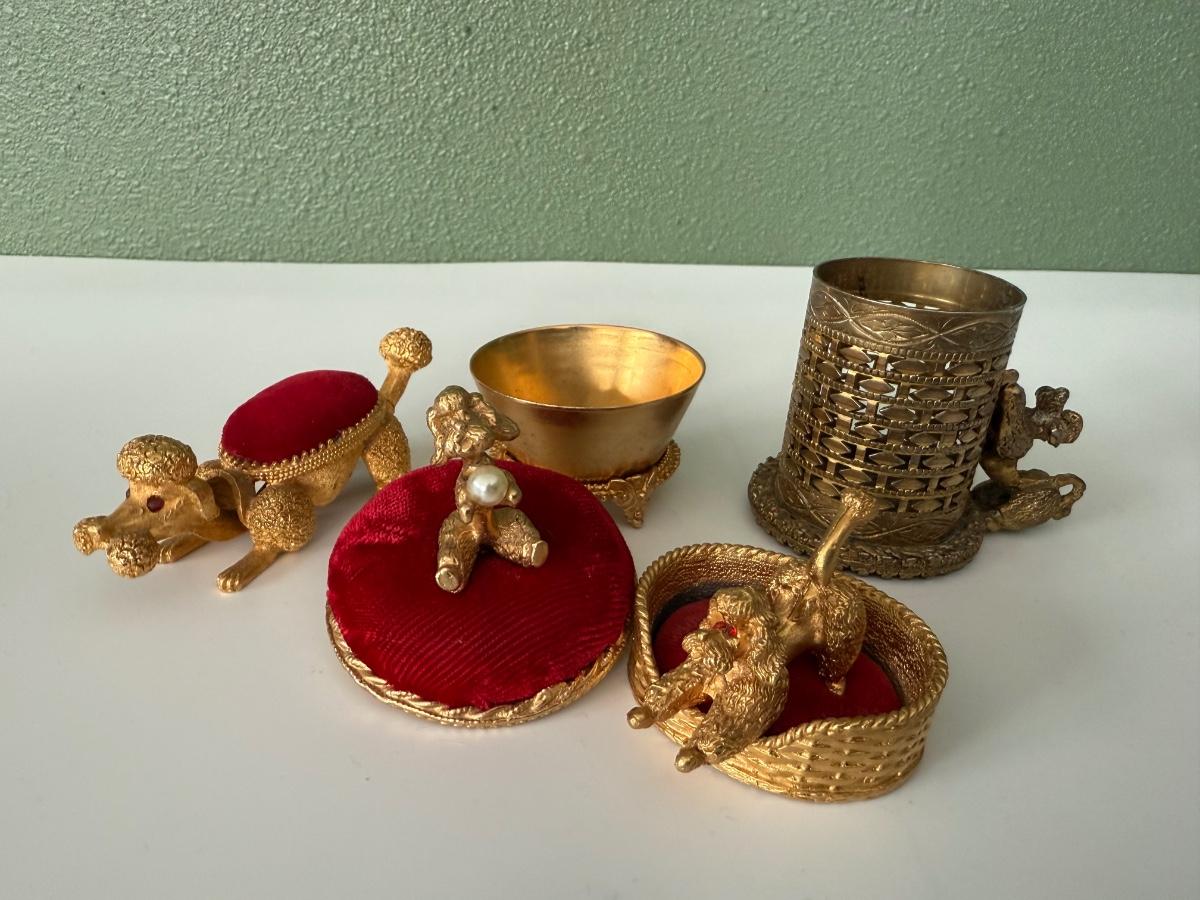 Vintage Mini Gold Metal Poodle in basket, gold metal w/red pin cushion bronze cup. 2 Florenza