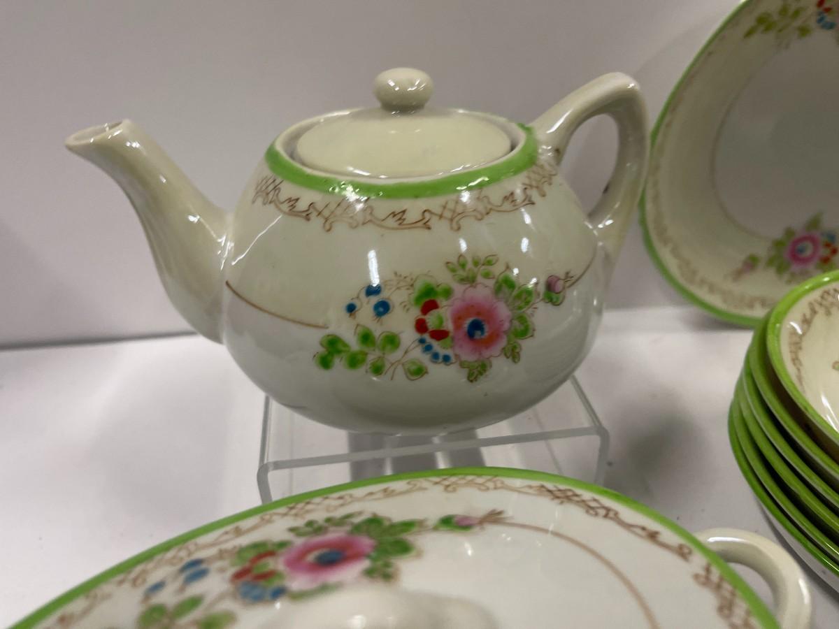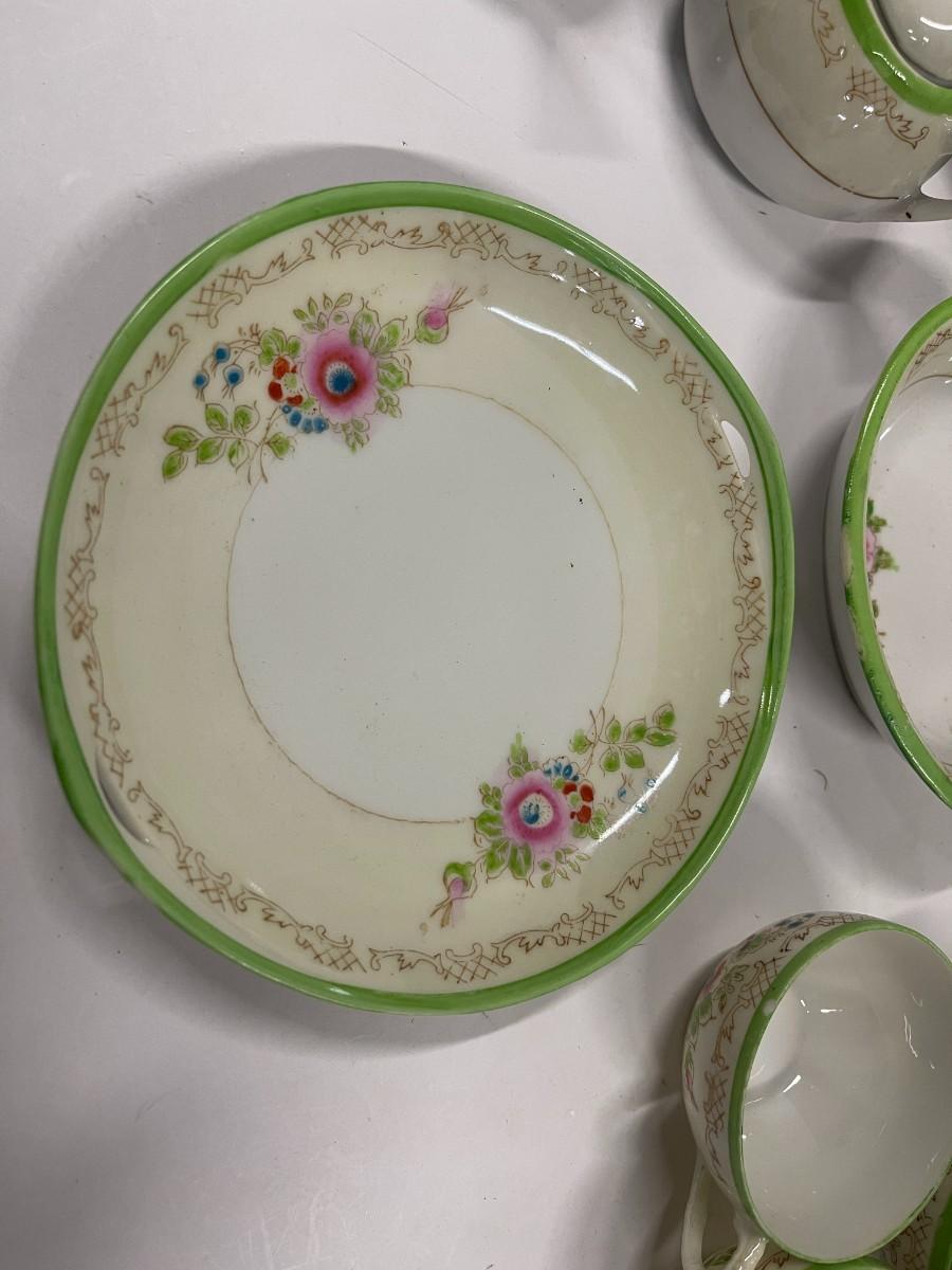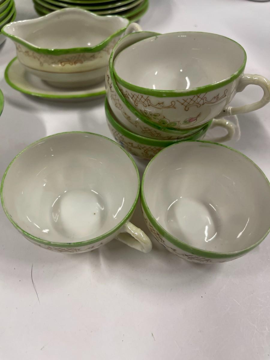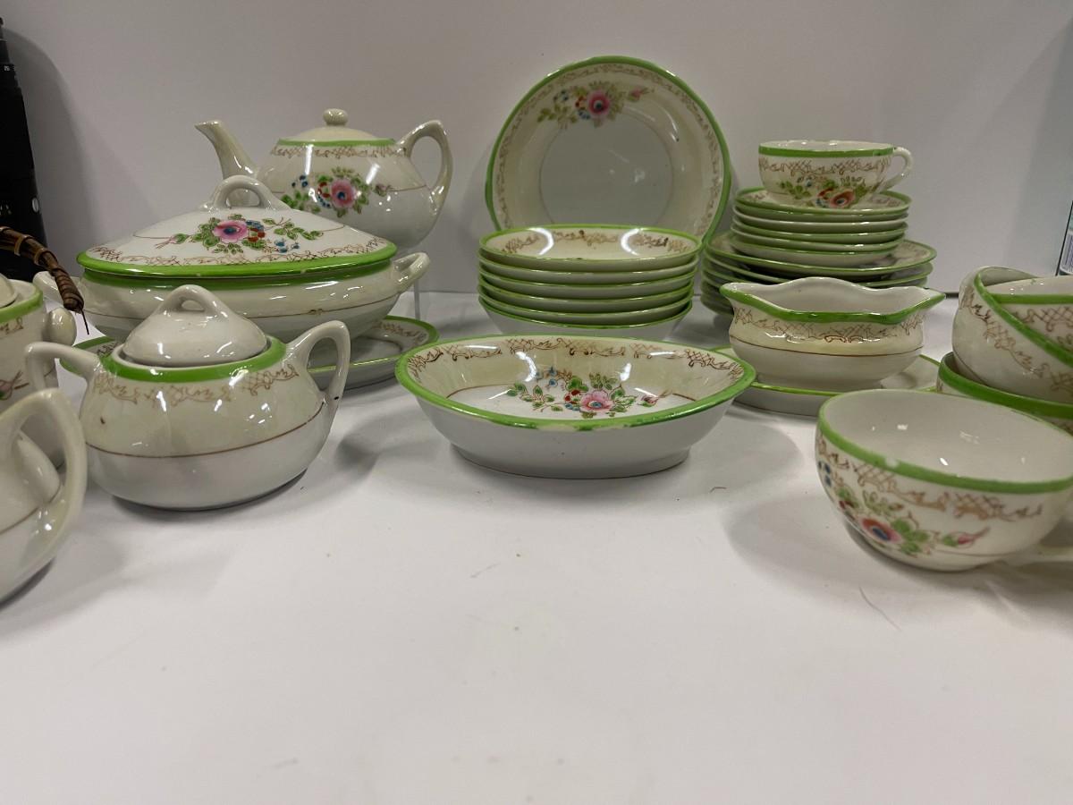 Vintage Nippon mini tea set. Very good condition. Includes everything shown. Appears to be a complete set: Tea pot, 6 cups and saucers, 6 plates, sugar and creamer, tureen with lid, serving platter, gravy boat serving bowl.