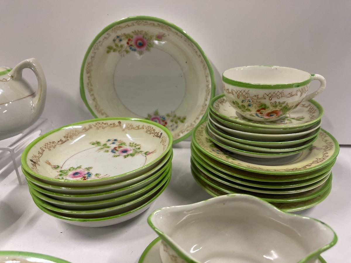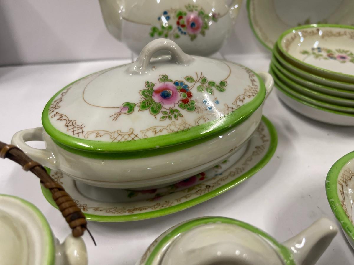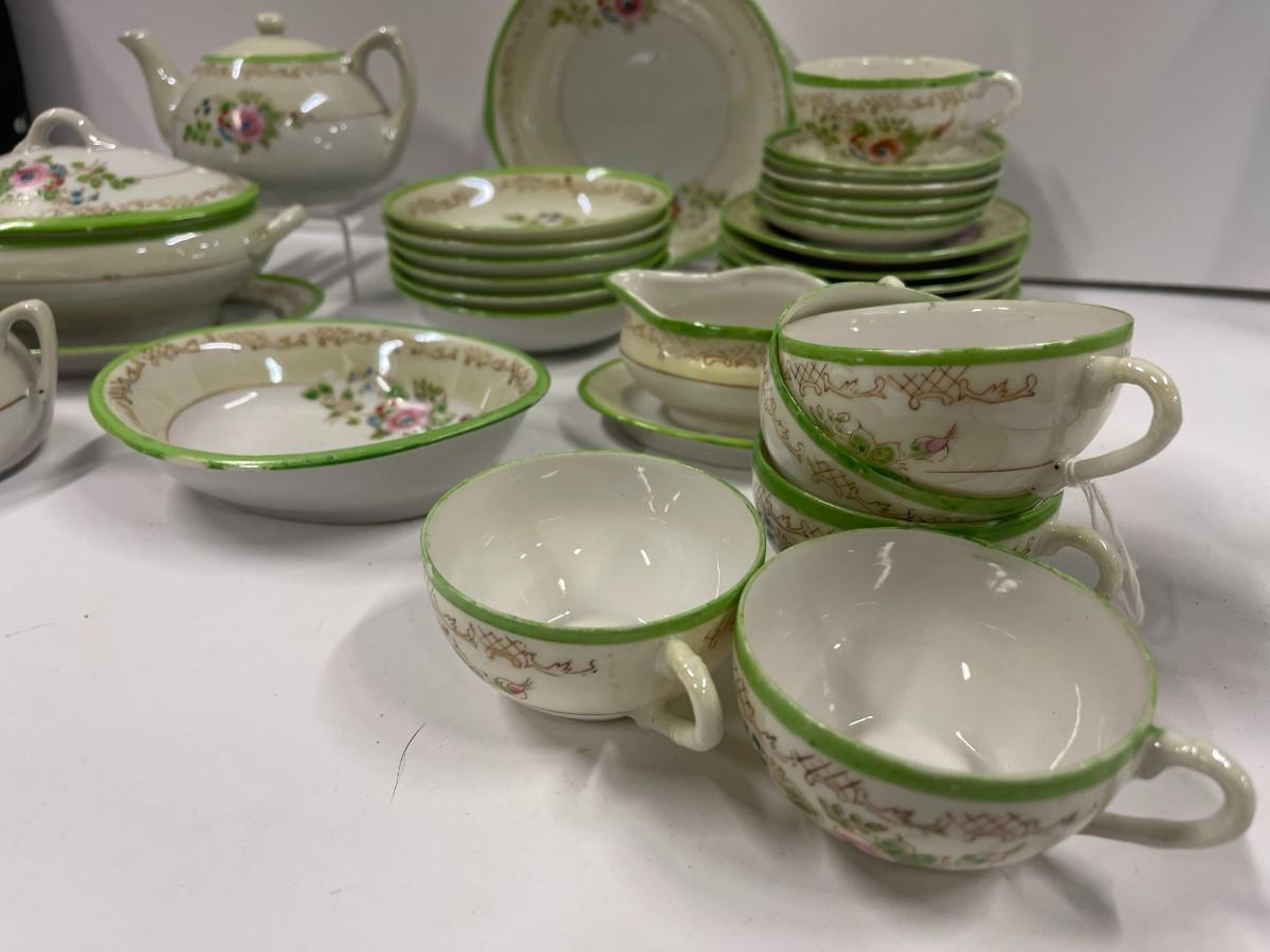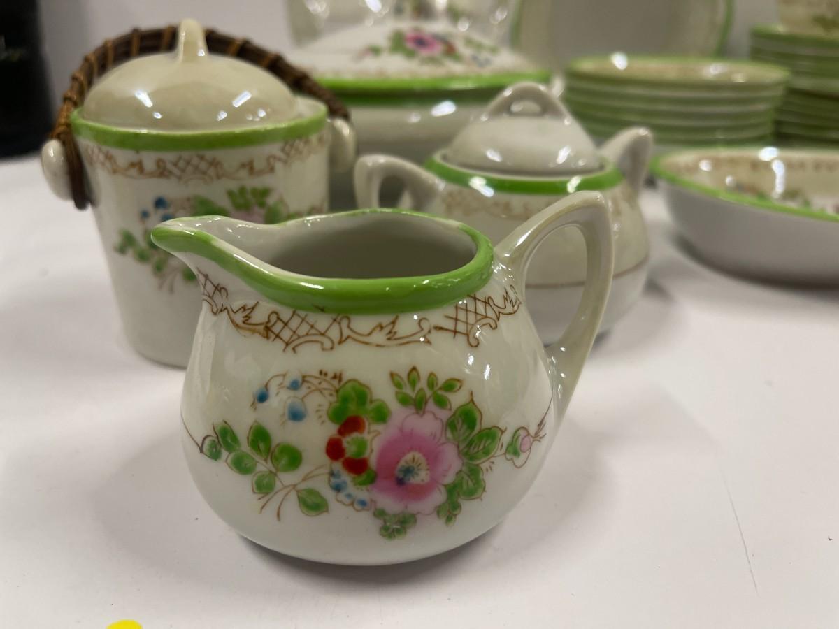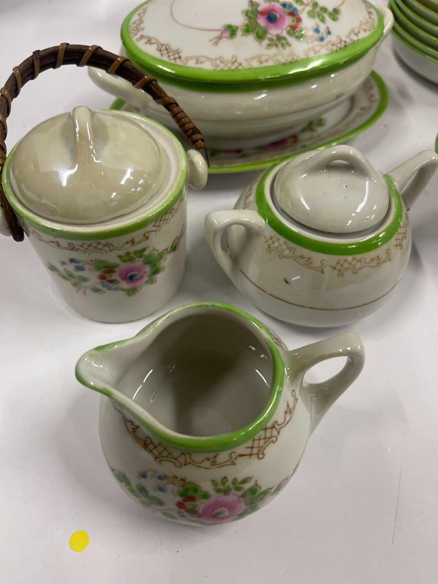 Vintage Nippon mini tea set. Very good condition. Includes everything shown. Appears to be a complete set: Tea pot, 6 cups and saucers, 6 plates, sugar and creamer, tureen with lid, serving platter, gravy boat serving bowl.