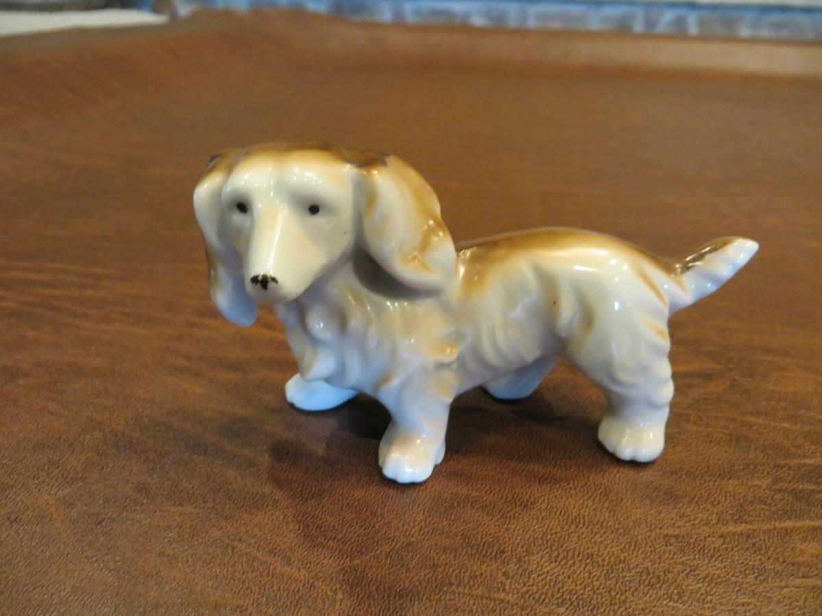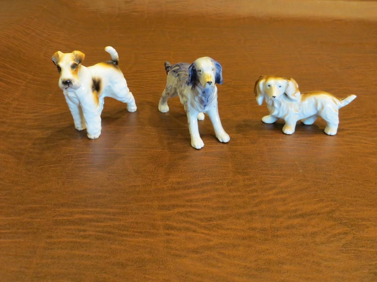 Set of 3 vintage mini porcelain dogs, measuring approx 1.5"-2". Includes an English Setter Blue Belton, Fox Terrier, and Dachshund