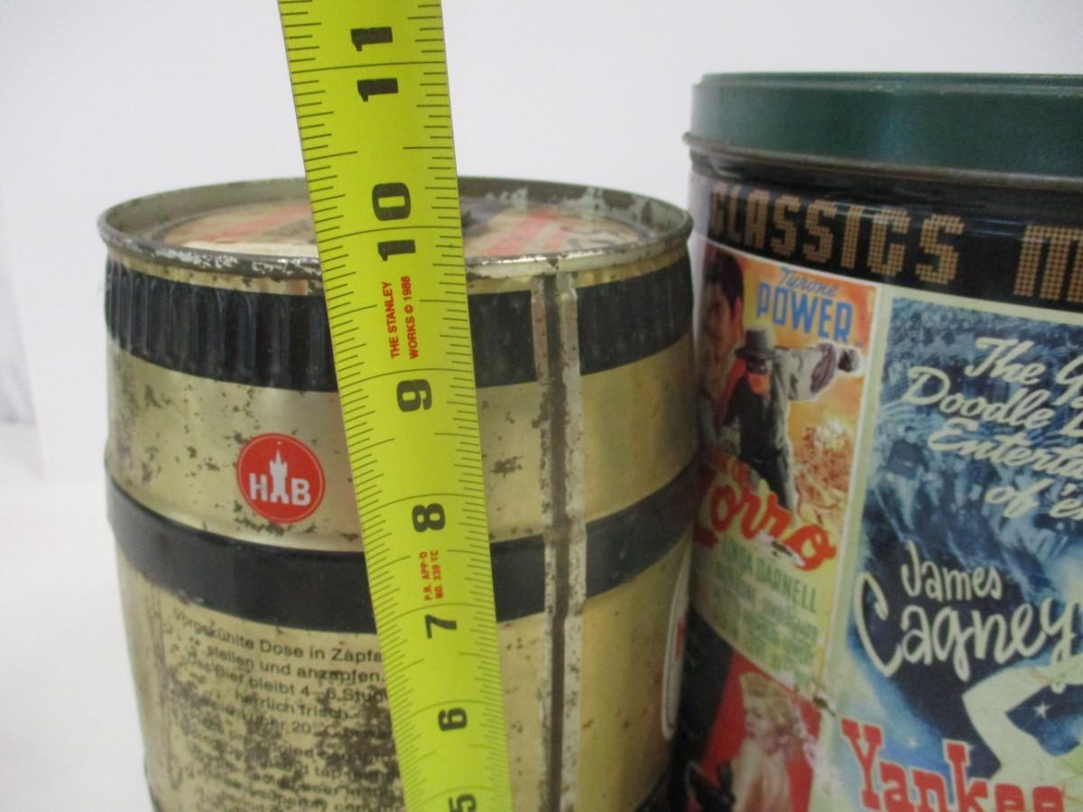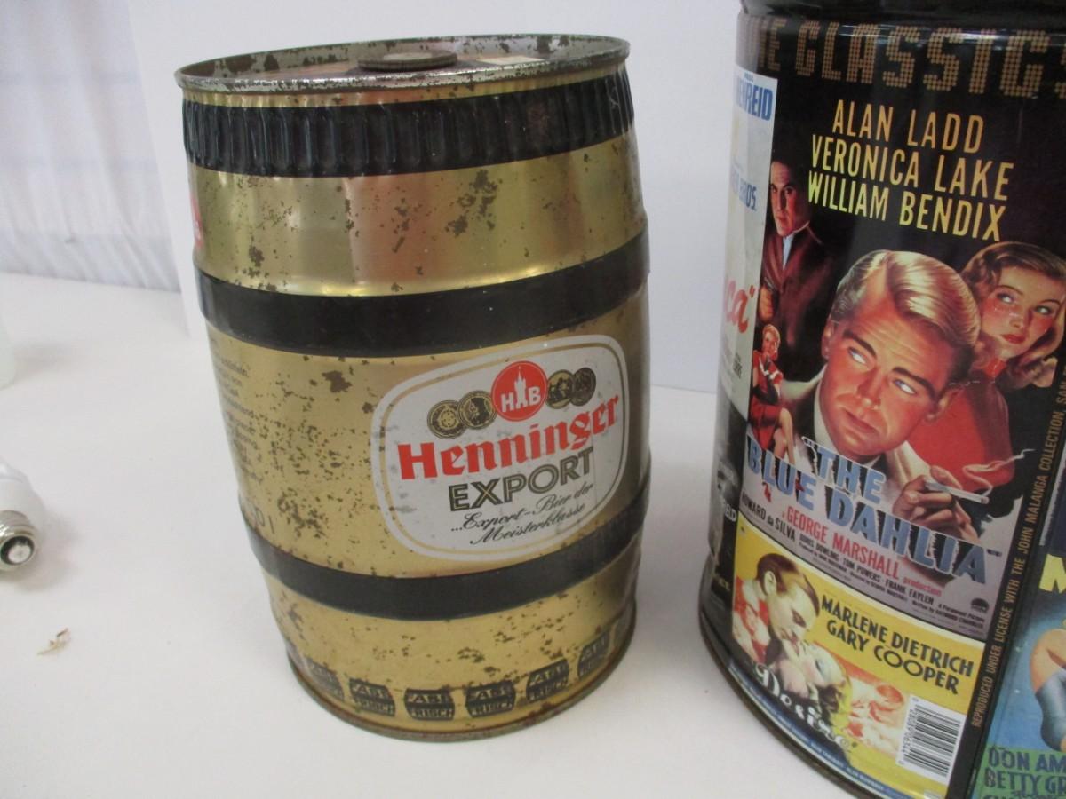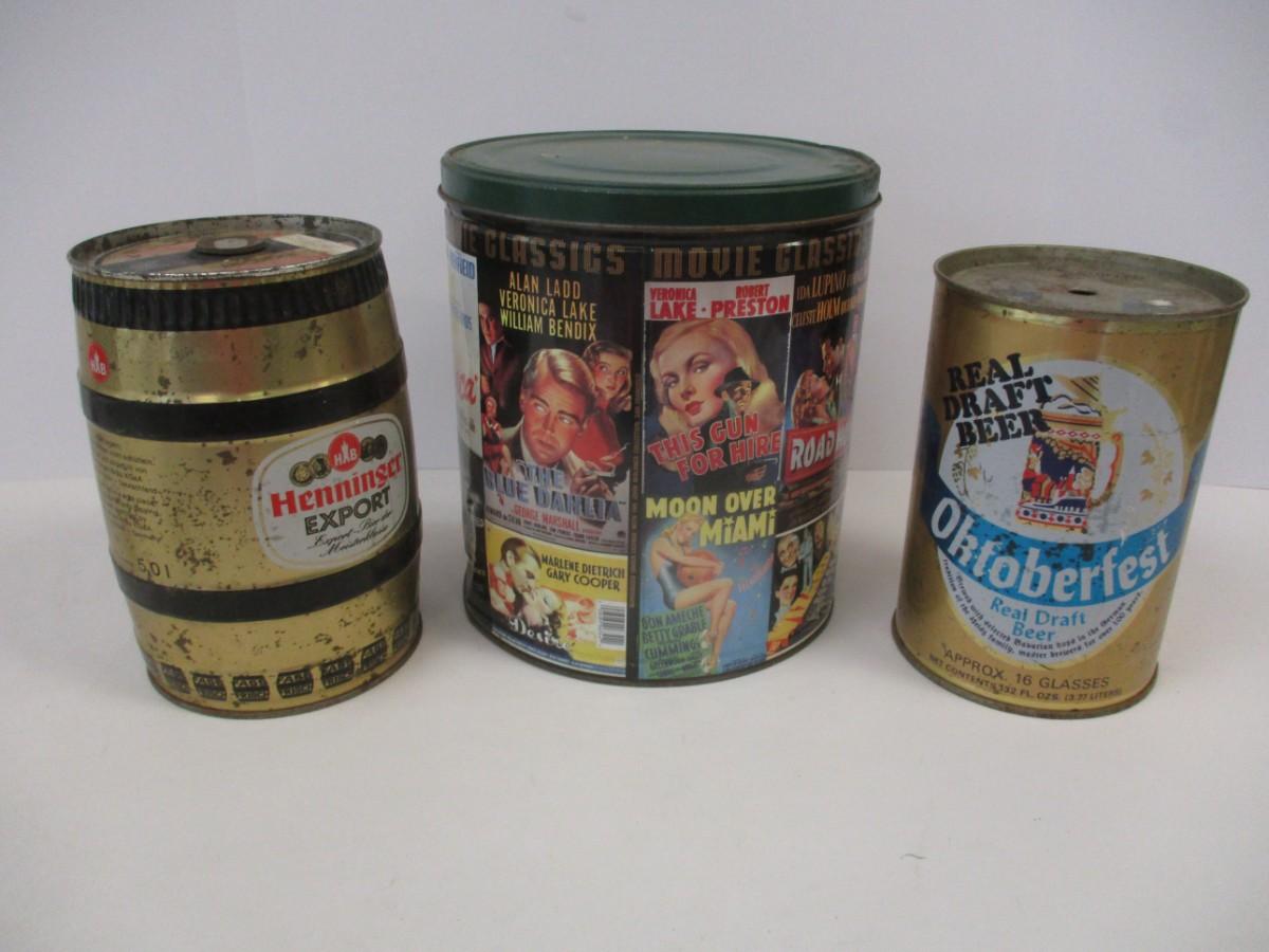 Vintage Miniature Beer Keg (empty) Henninger Export Can - Movie Classics Popcorn Tin Casablanca Tarzan Zorro Houston Foods Co. & Vintage Oktoberfest Real Draft Beer Mini Keg 132 Oz Empty