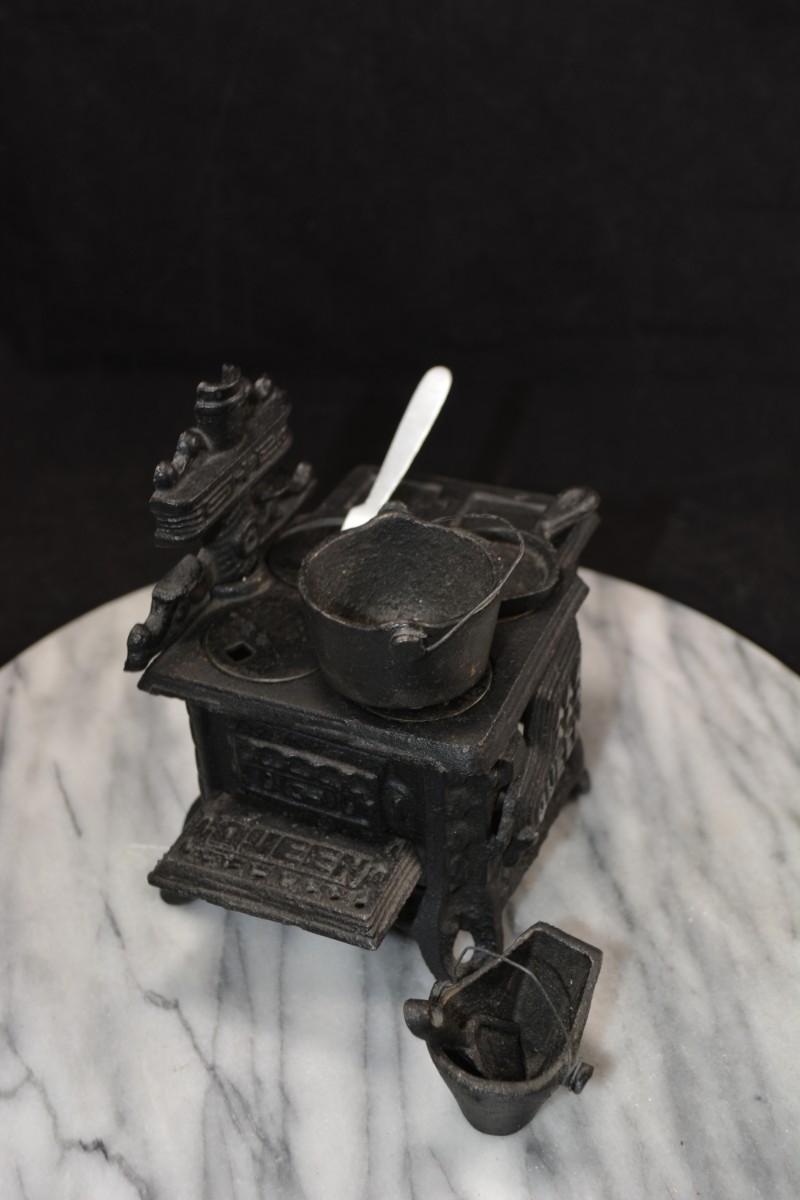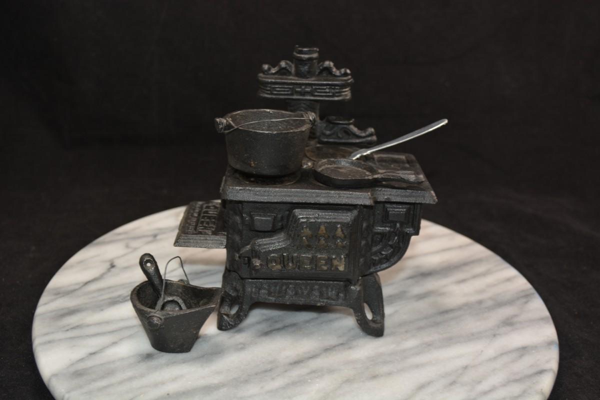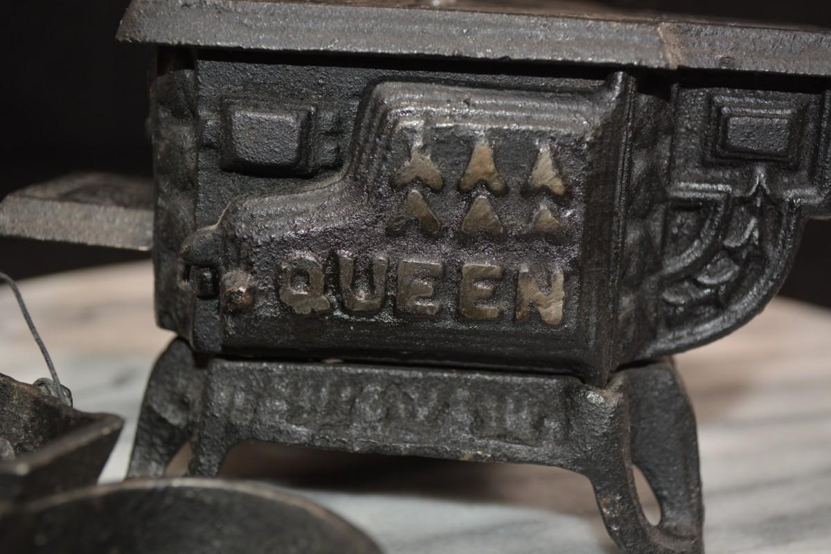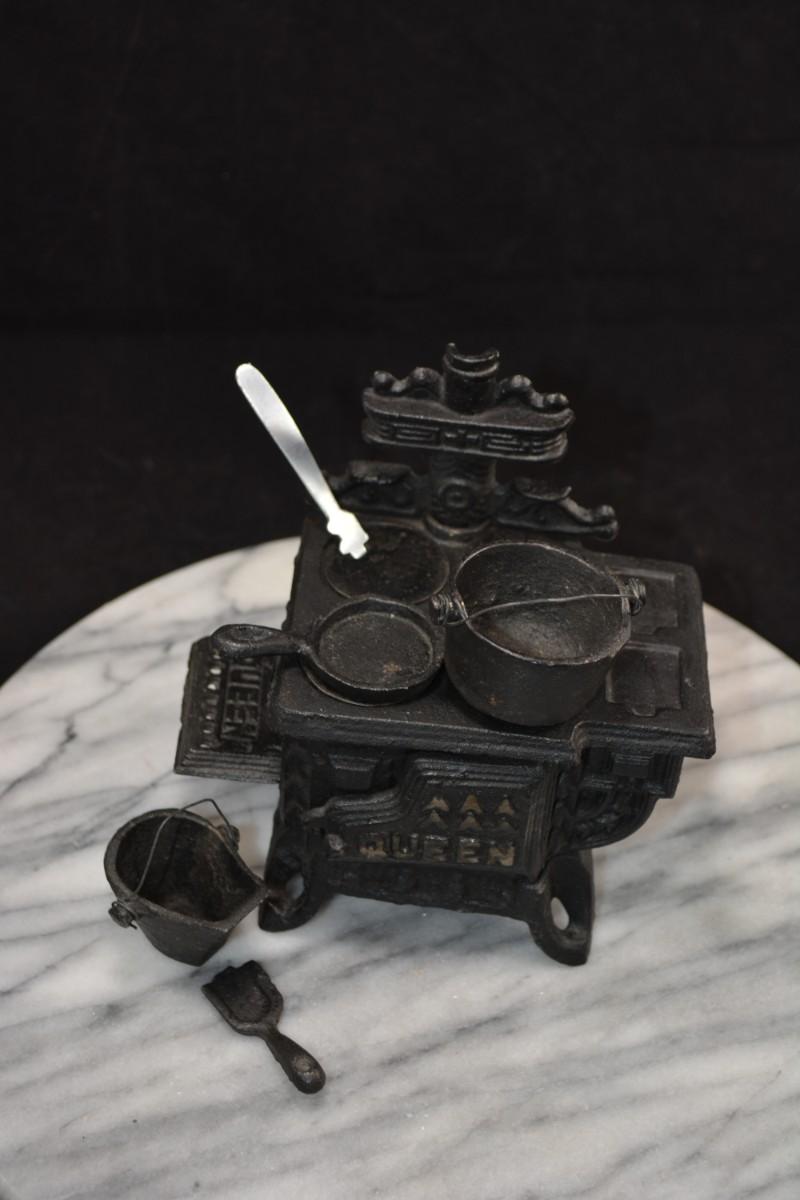 Vintage Miniature Cast Iron ‘Queen’ Stove w/ Accessories 5.5”x5.5”