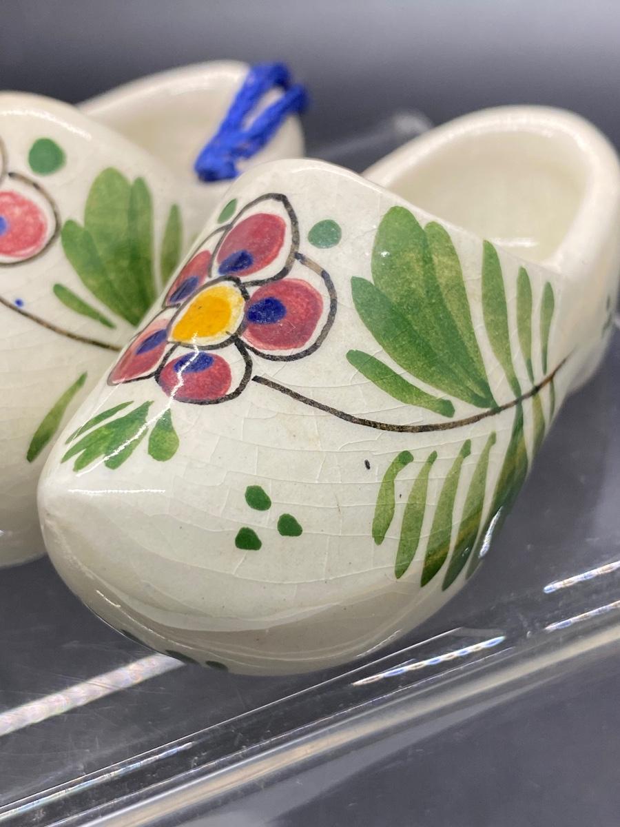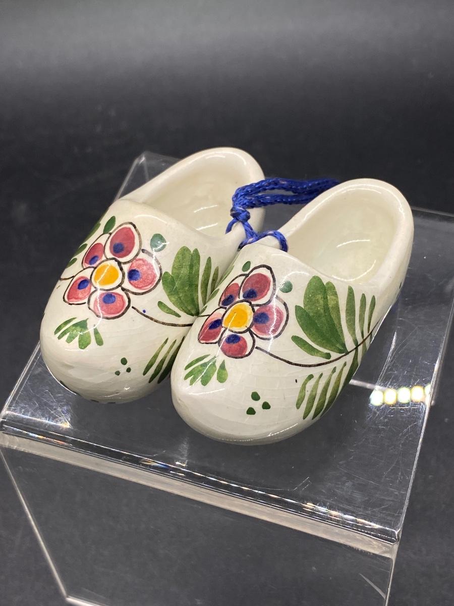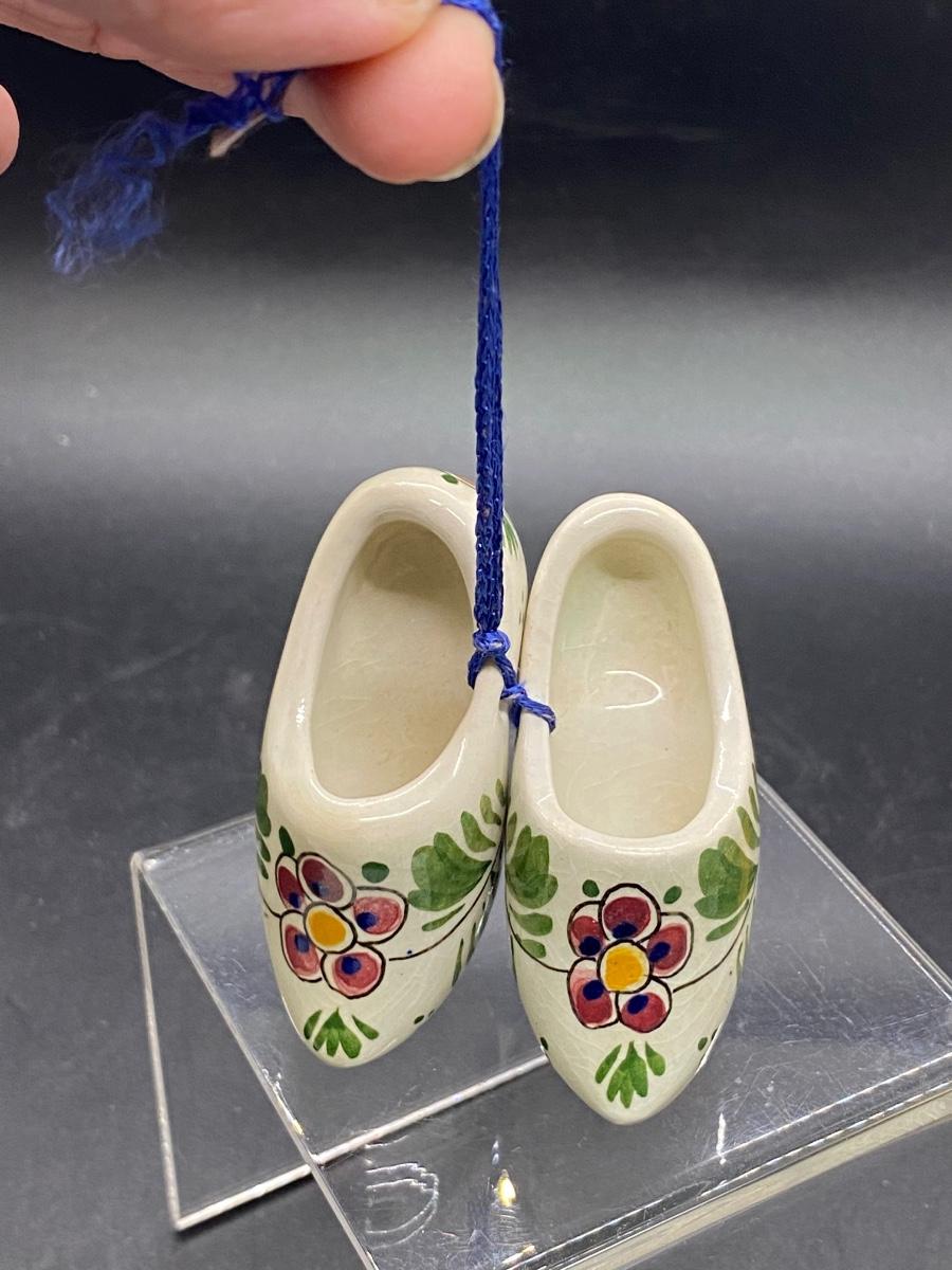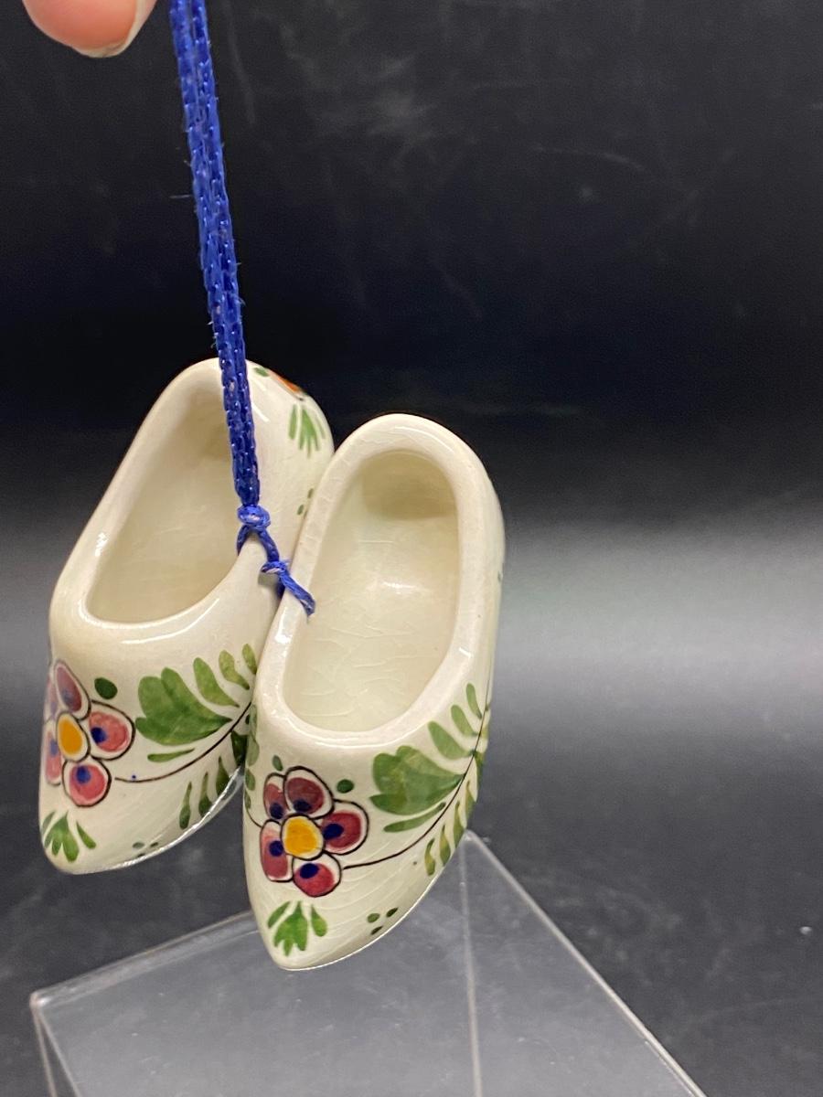 Pair of miniature ceramic wood shoes. White with pink flower design. Tied together with blue string , can be hung. Maker marks on the bottom. About 2.5" size.