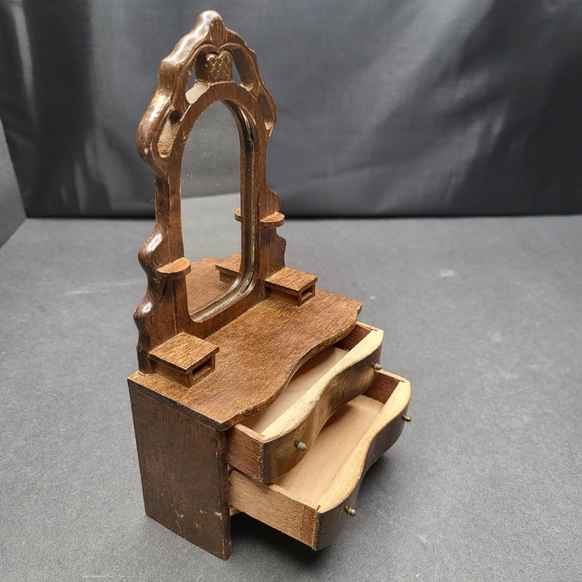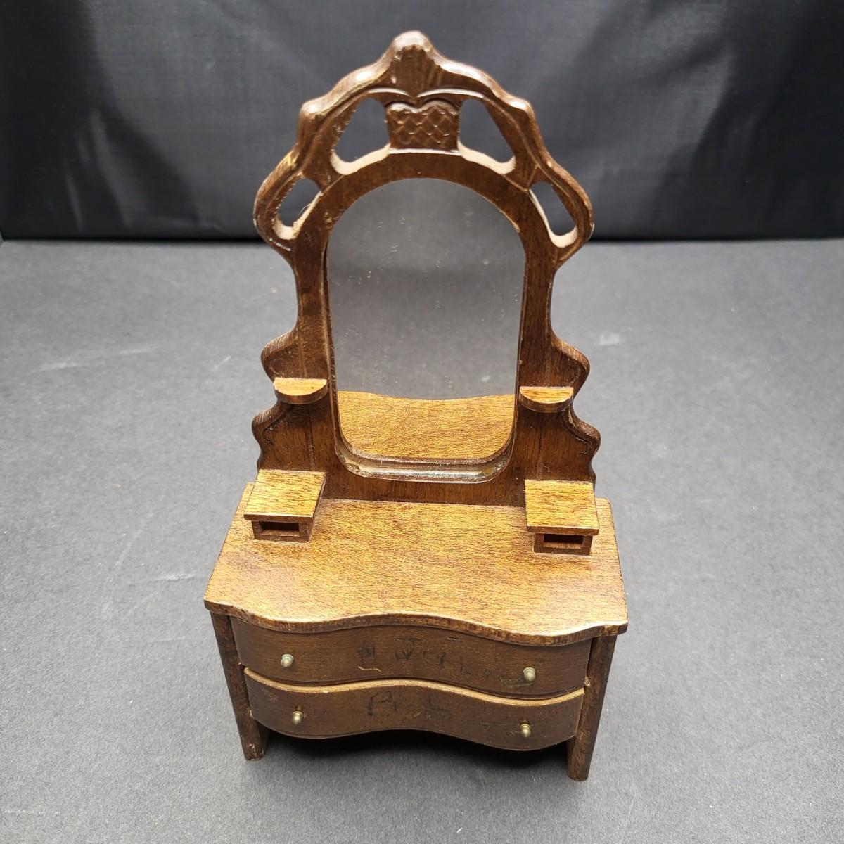 1.75" wicker basket, 3" tall wicker chair, wood 7" x 3.75" x 1.75" mirrored dresser w/two drawers.