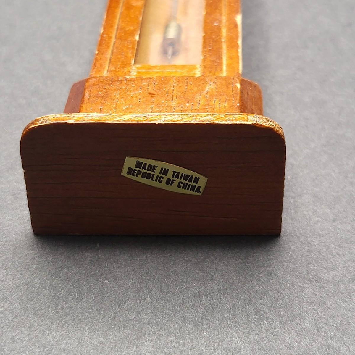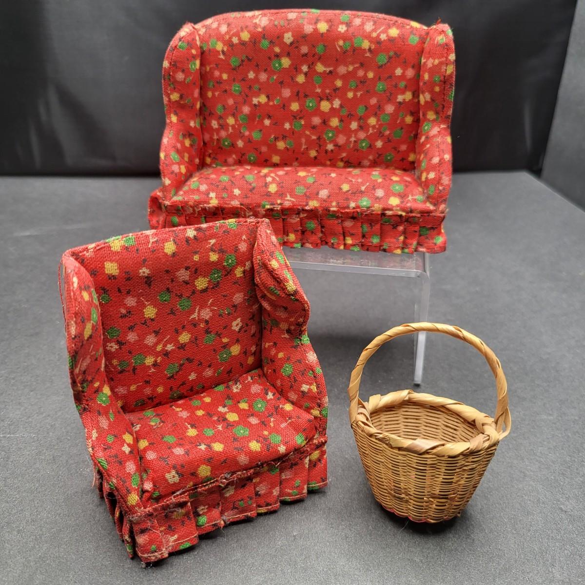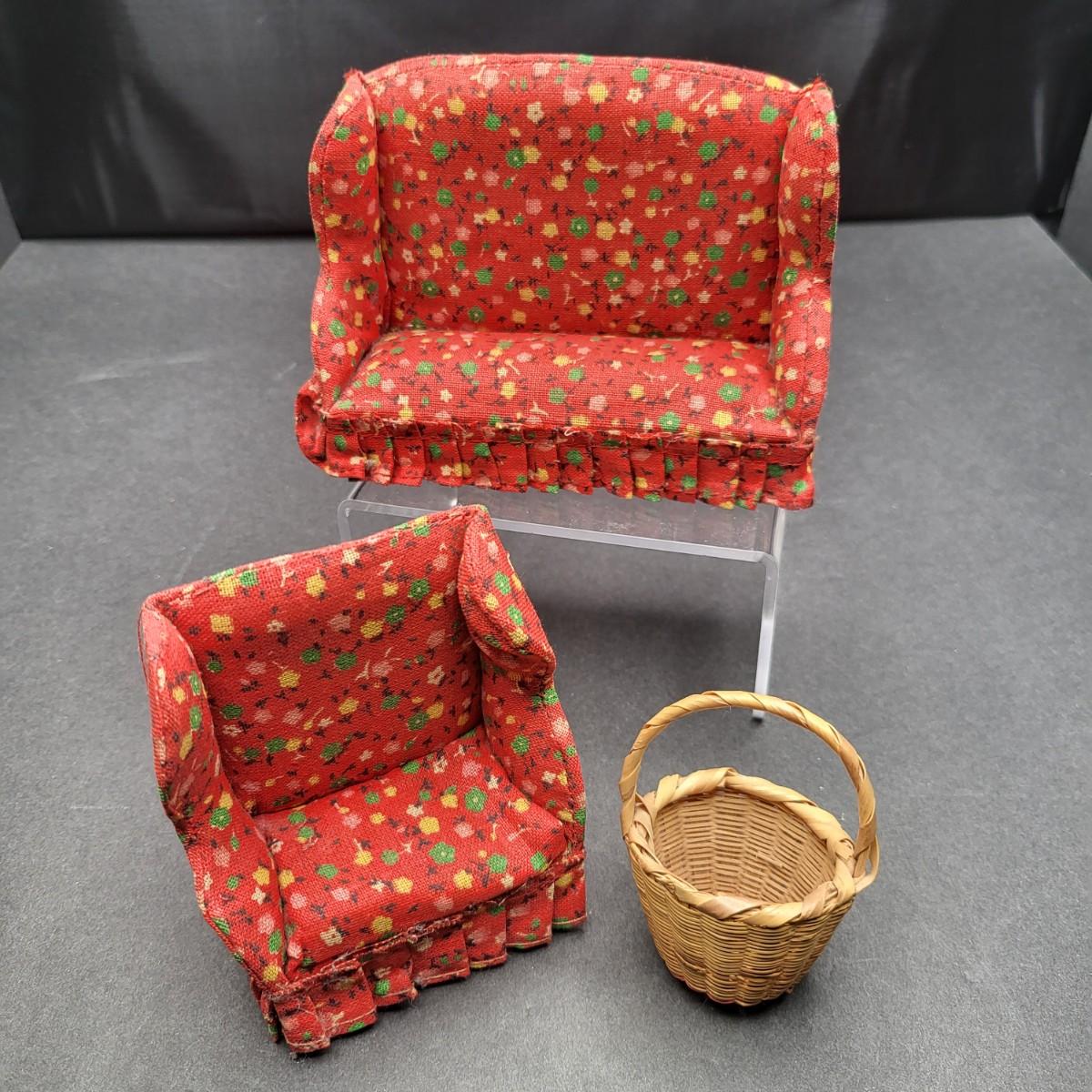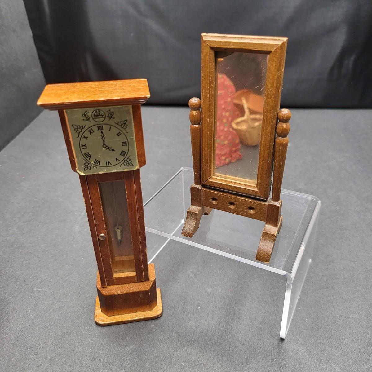 Vintage miniature dollhouse furniture lot. 5" x 3" and 3" x 3" matching hi-back sofa and chair, 4" x 3" plastic settee, PRC 6" wood grandfather clock, wood rocking crib 4" x 1.25", wood swivel mirror 4.25".