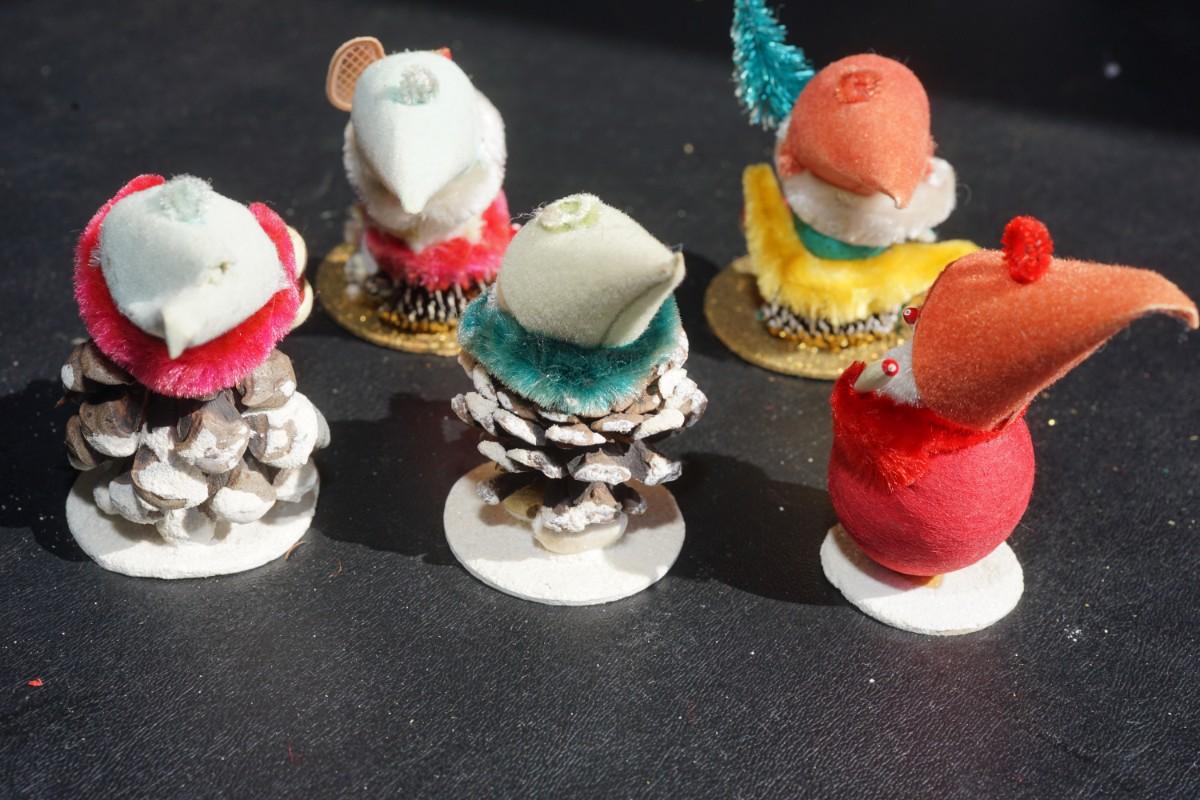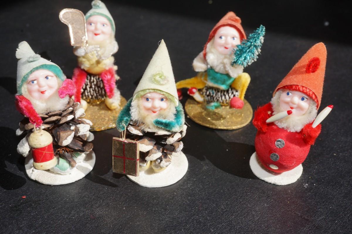 vintage holiday elves about 2-3" in height. felt, pipe cleaner, pinecones and paper machie