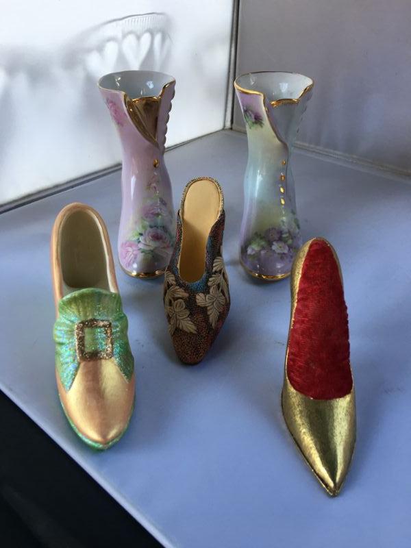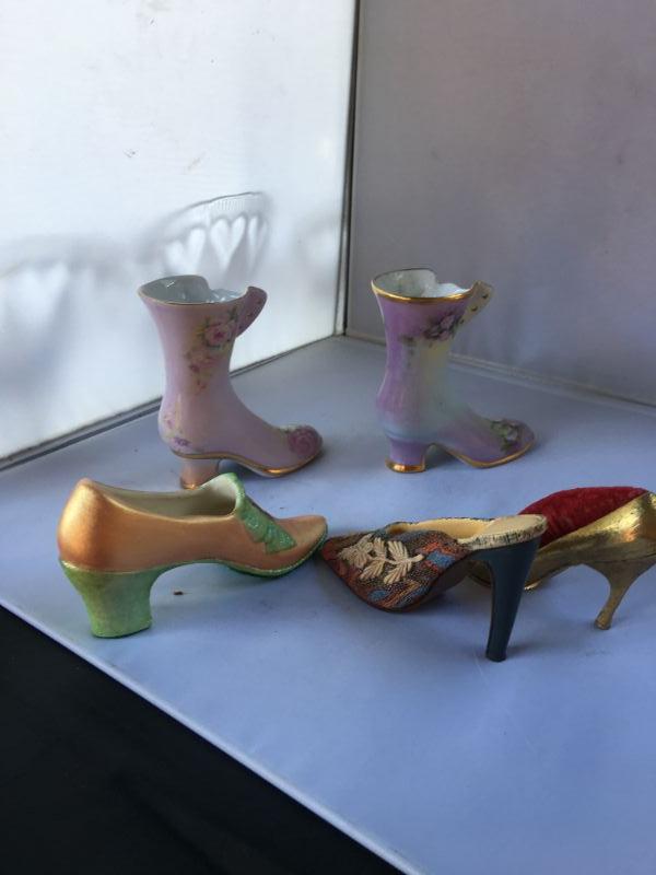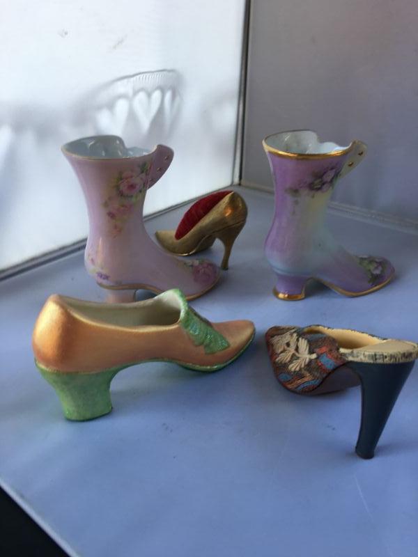 Pair of porcelain hand painted shoes, the tallest, Hand Decorated by Betty Platner. Each measures 4.5" X 4.25". The 3 other ones are smaller between 3" to 4" tall. In fine conditions.