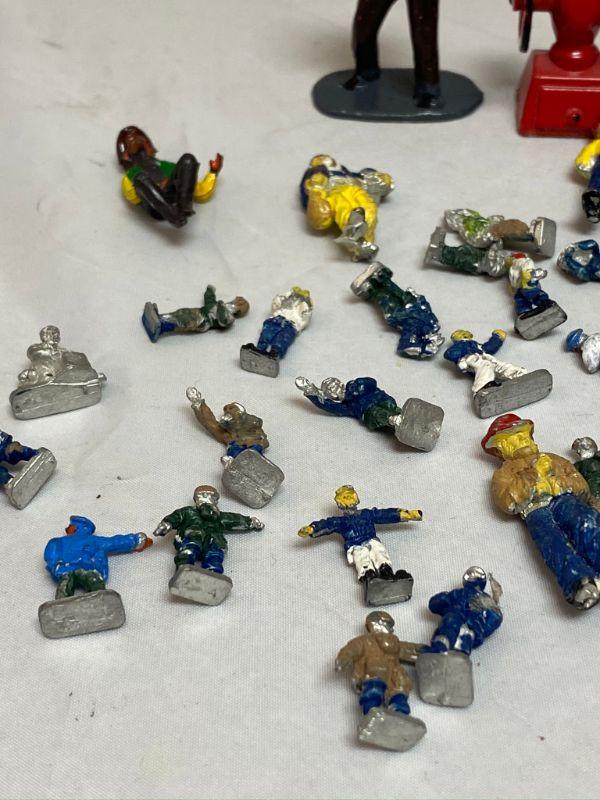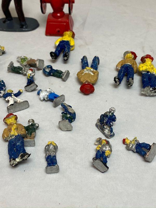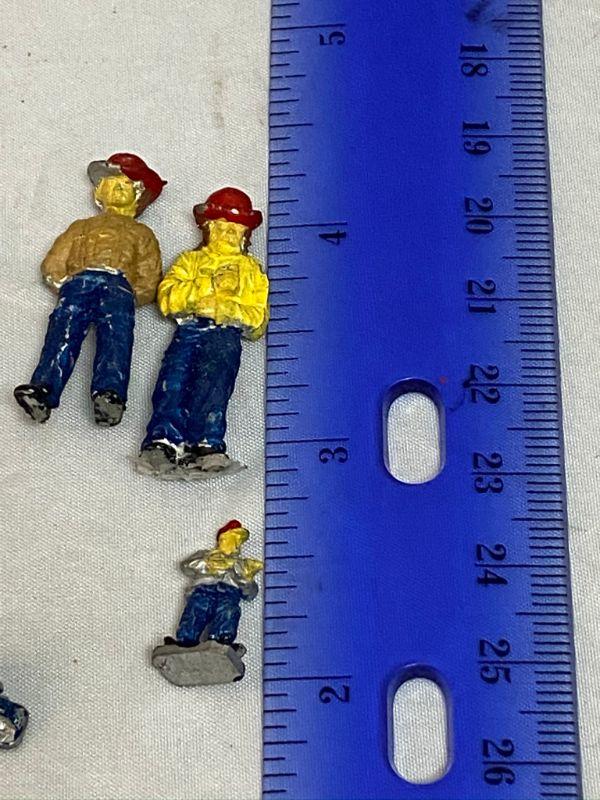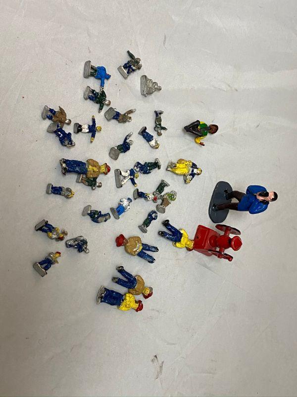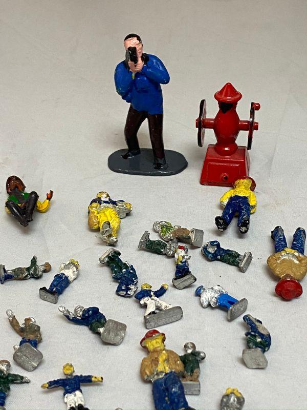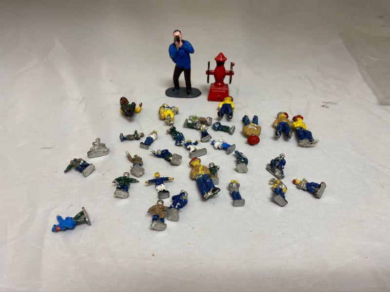 Lot of miniature cast metal people. Most have been painted, paint has chipped off in some places. 1/2" and 1" size. Look like firemen, soldiers, and other uniformed figures. The guy standing in the back is holding a camera and is made of plastic. 25+ pieces.