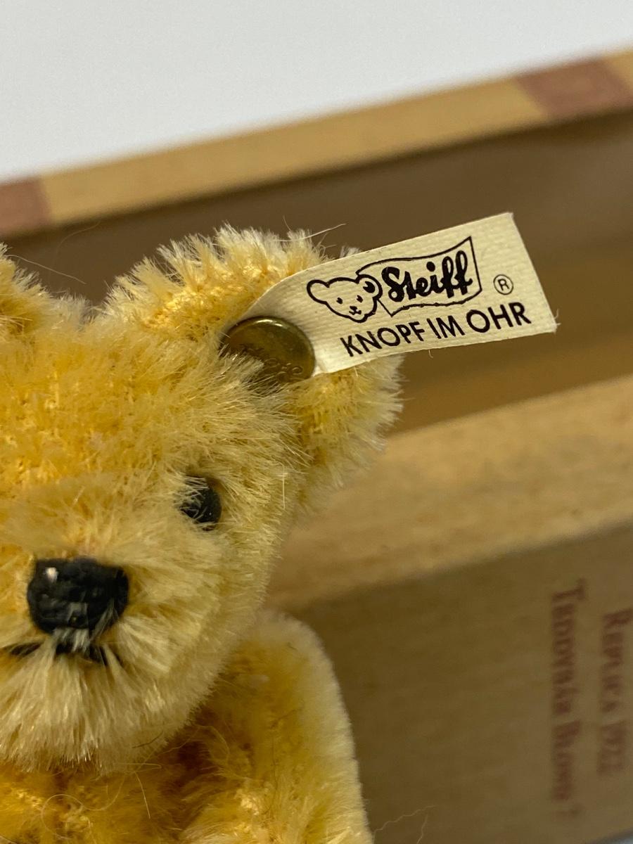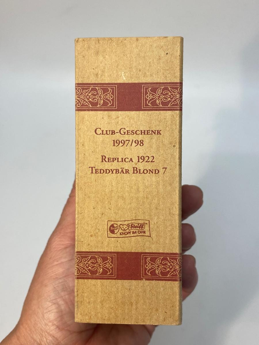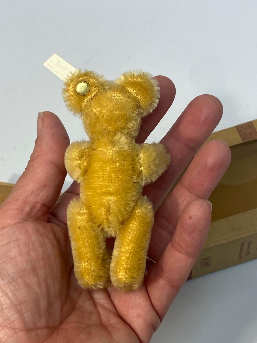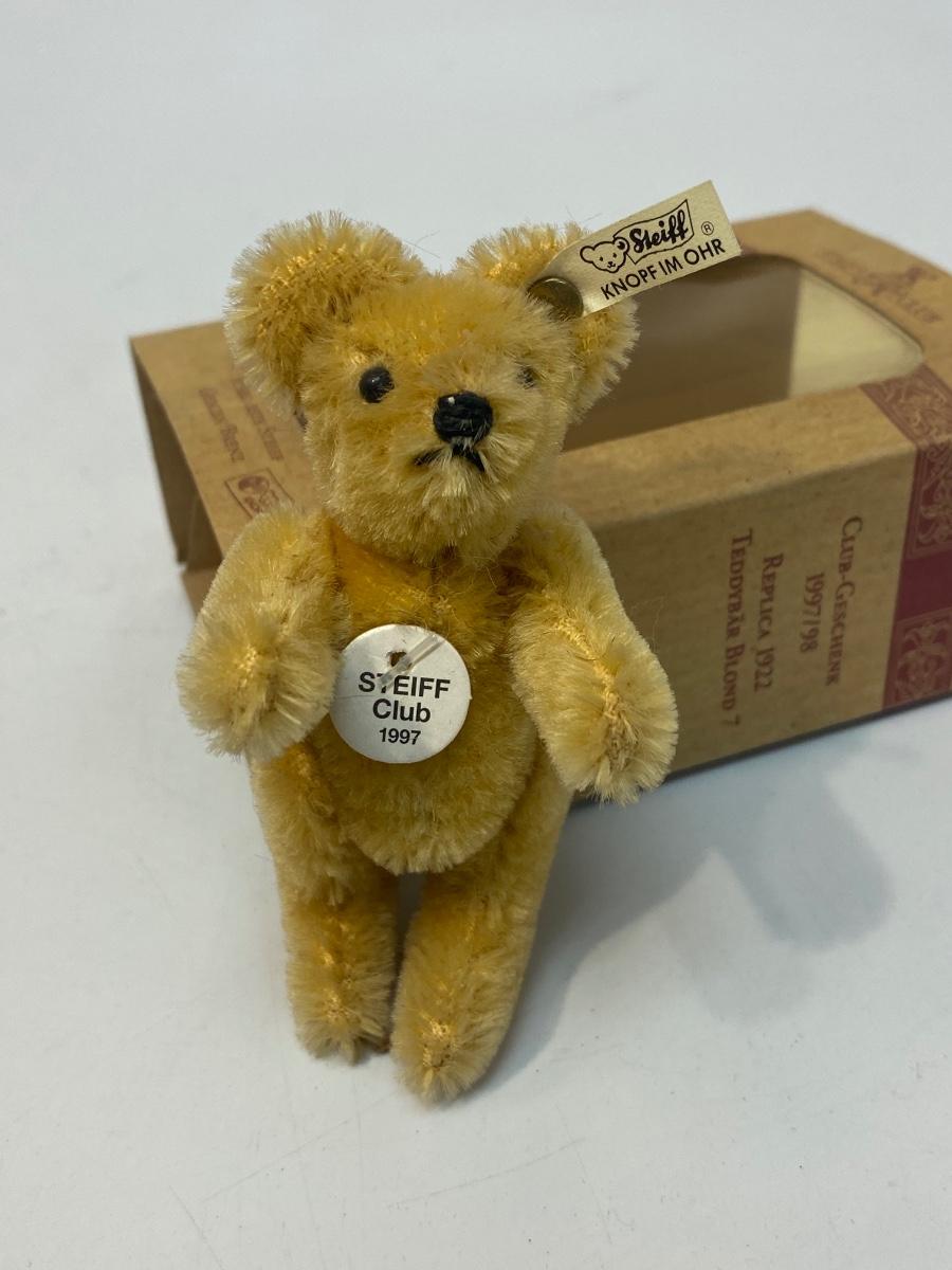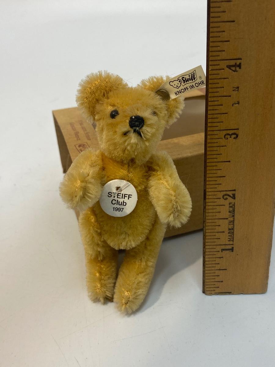 Vintage Miniature STEIFF 1922 Replica Teddy Bear Blond 7 Club Gift. Comes in original box, has a COA, even has STEIFF button and tag in ear. Jointed. In good vintage condition. About 4" size.