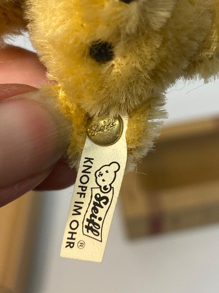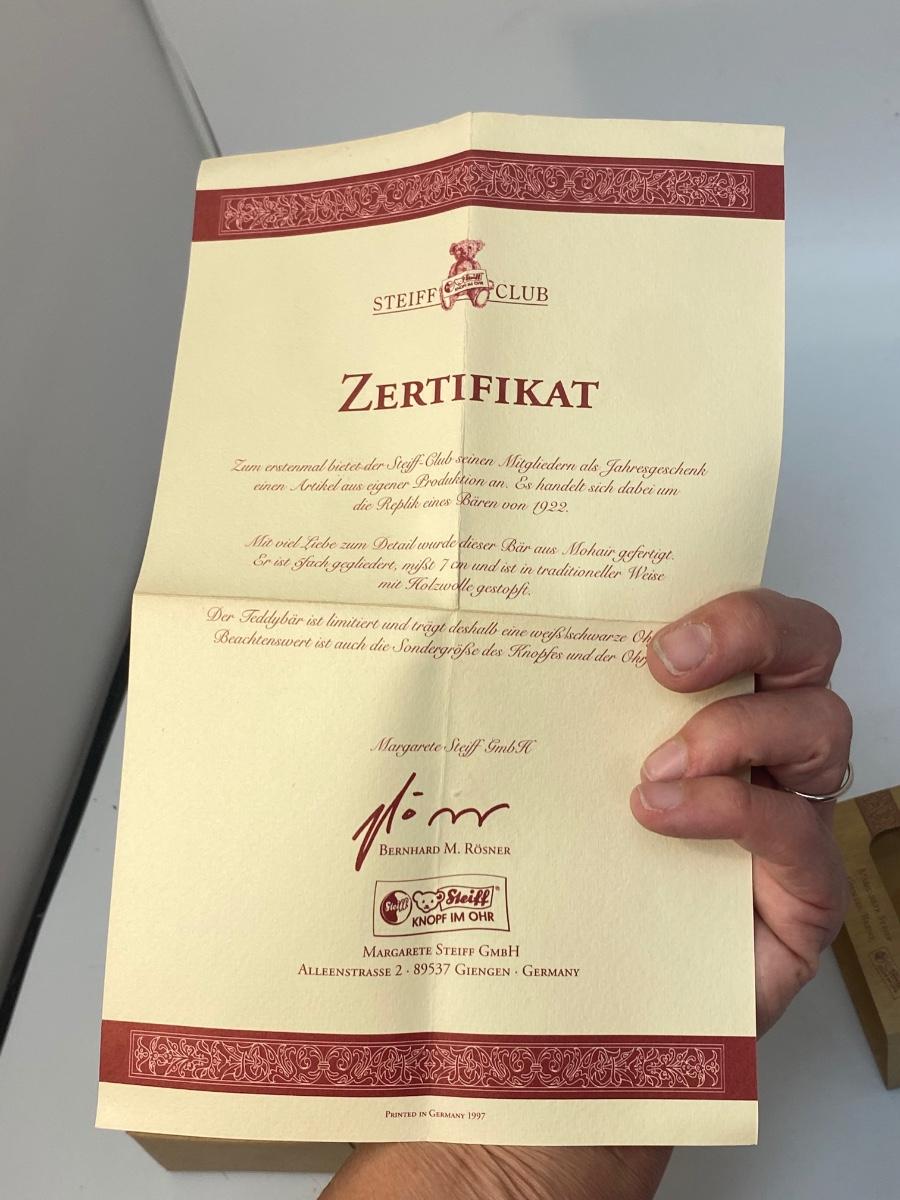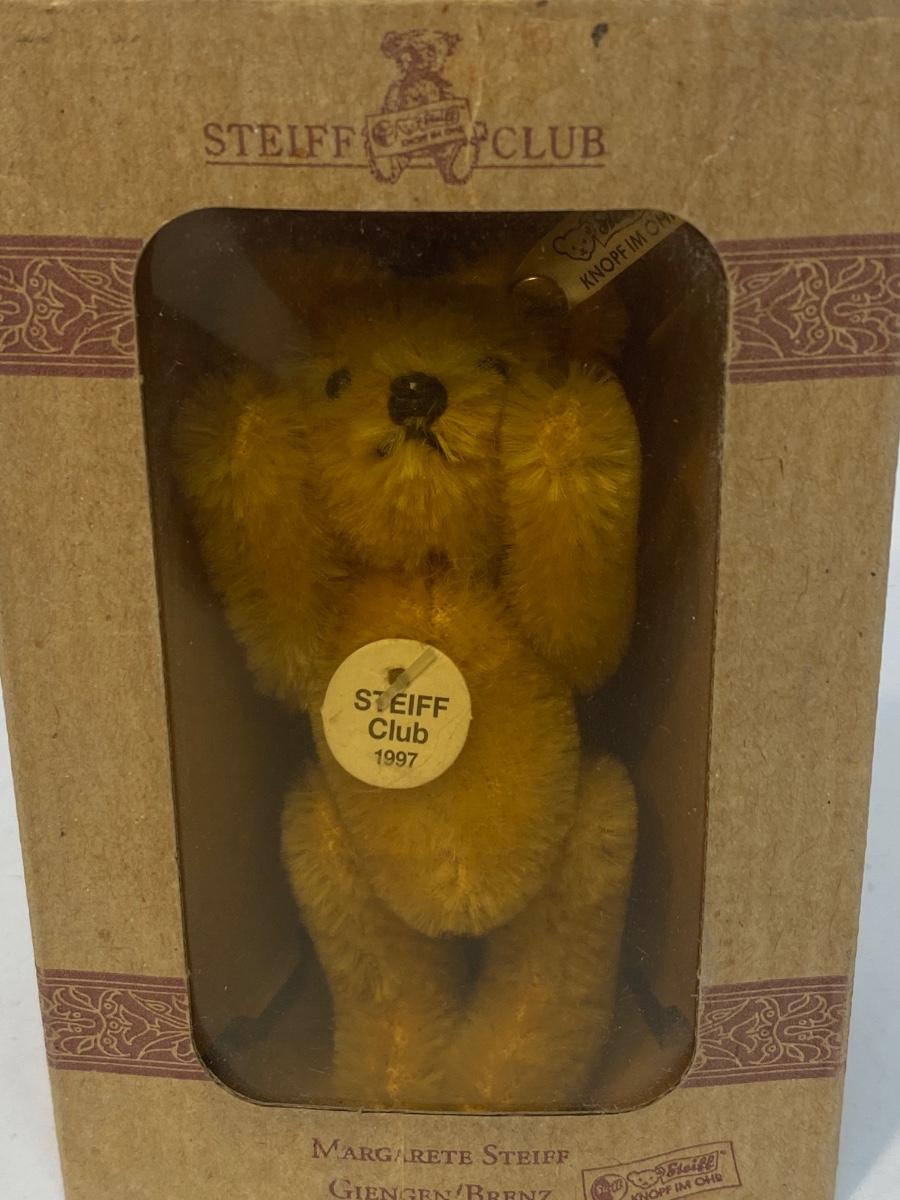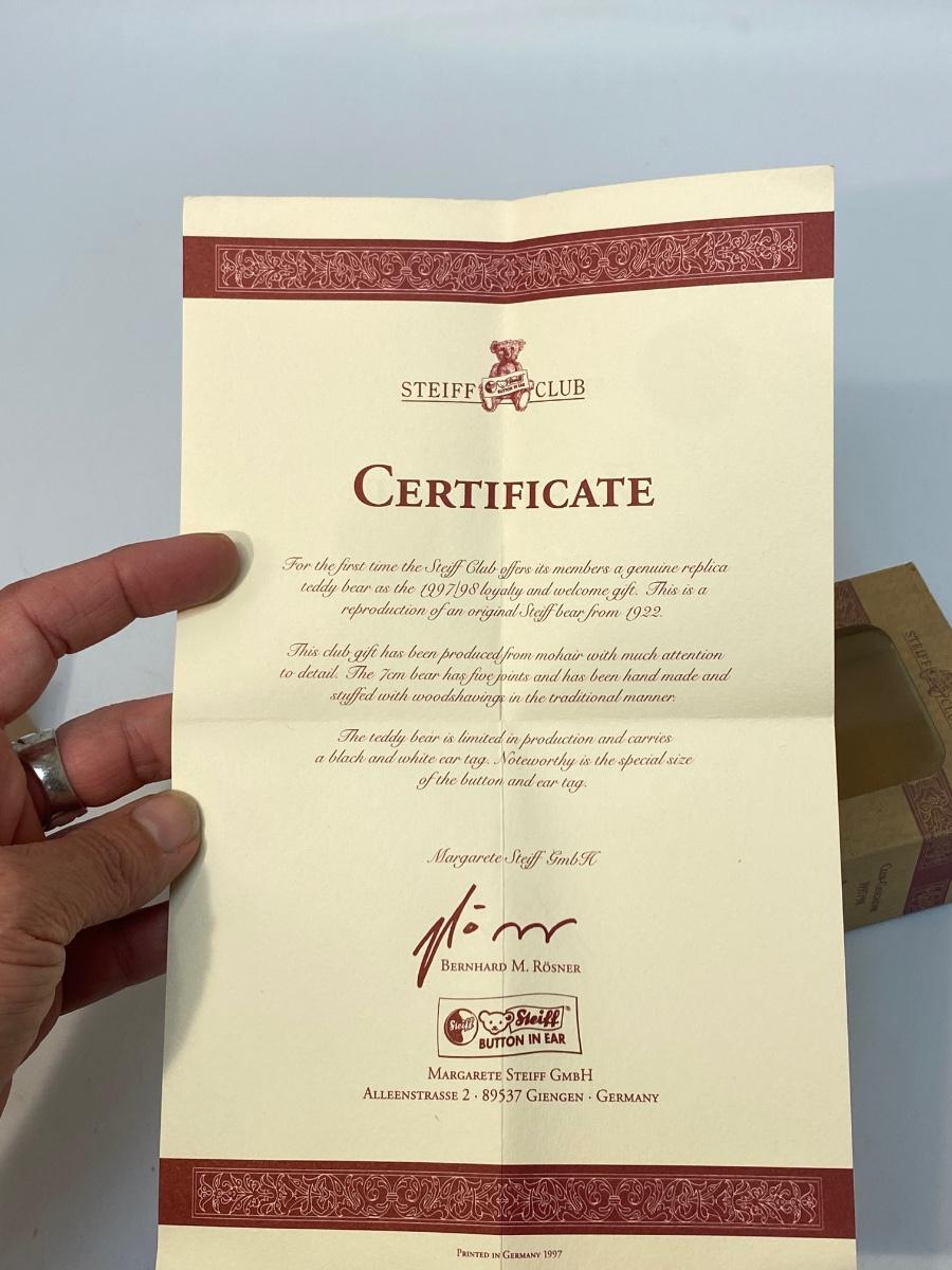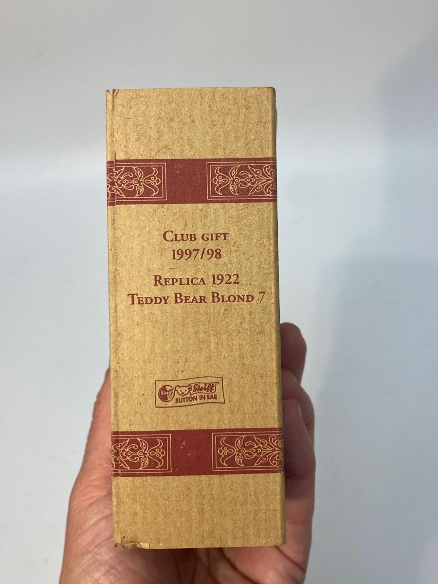 Vintage Miniature STEIFF 1922 Replica Teddy Bear Blond 7 Club Gift. Comes in original box, has a COA, even has STEIFF button and tag in ear. Jointed. In good vintage condition. About 4" size.