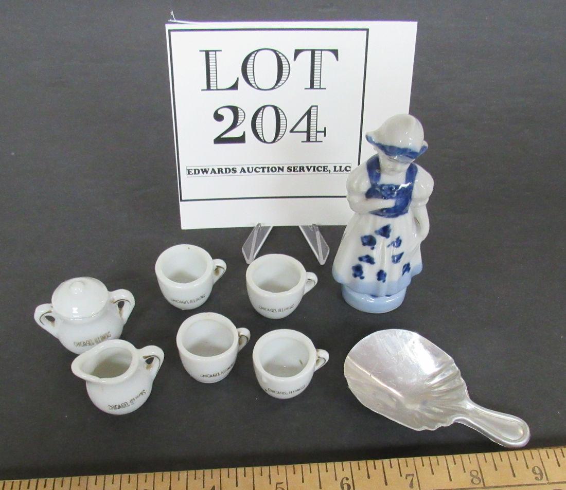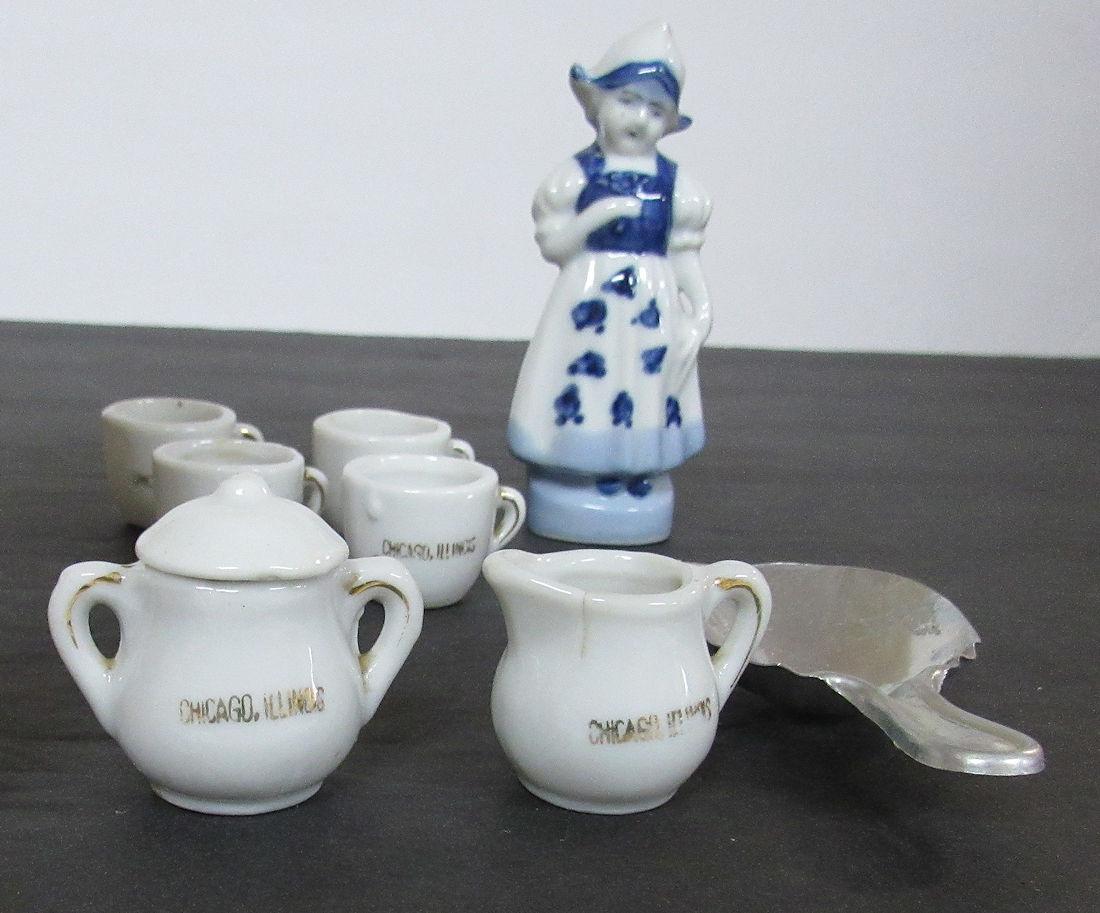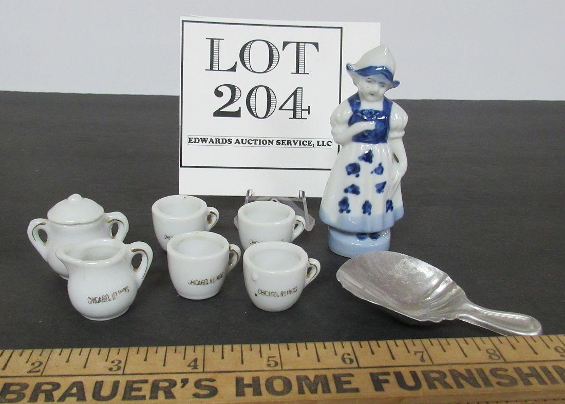 Vintage Minniature Cups, Sugar and Creamer, Aluminum Scoop, Figurine