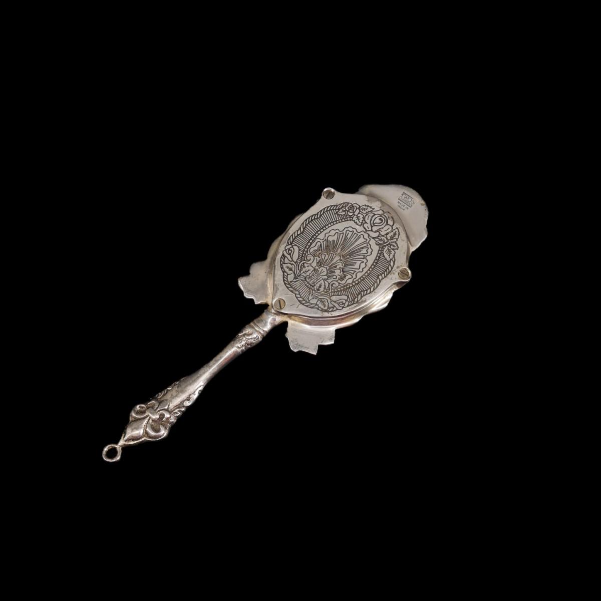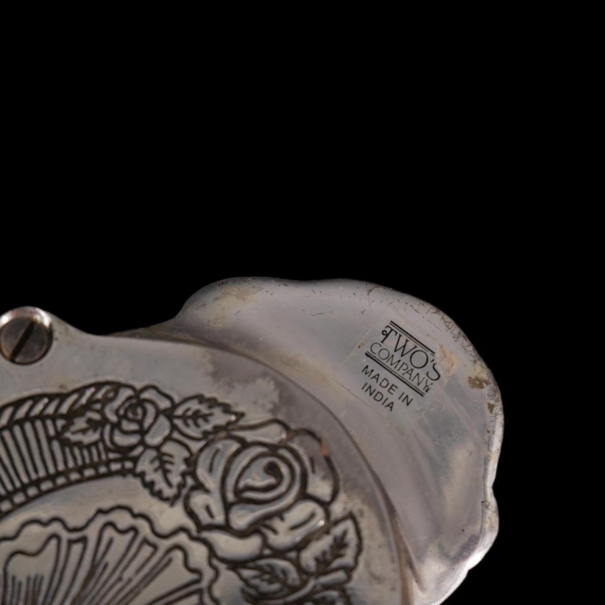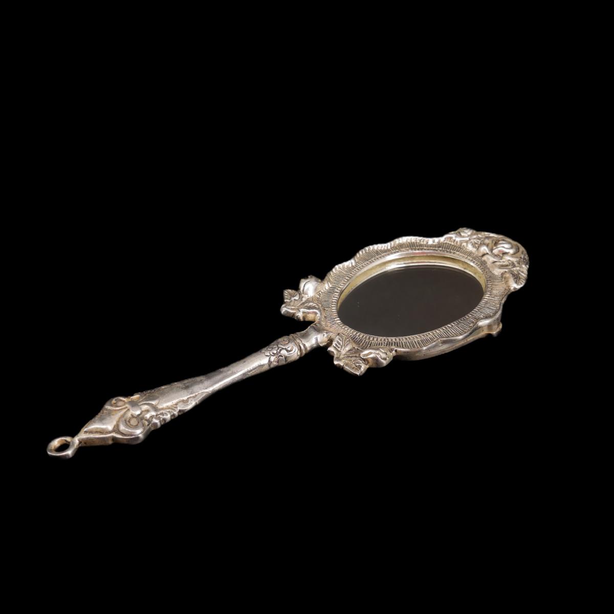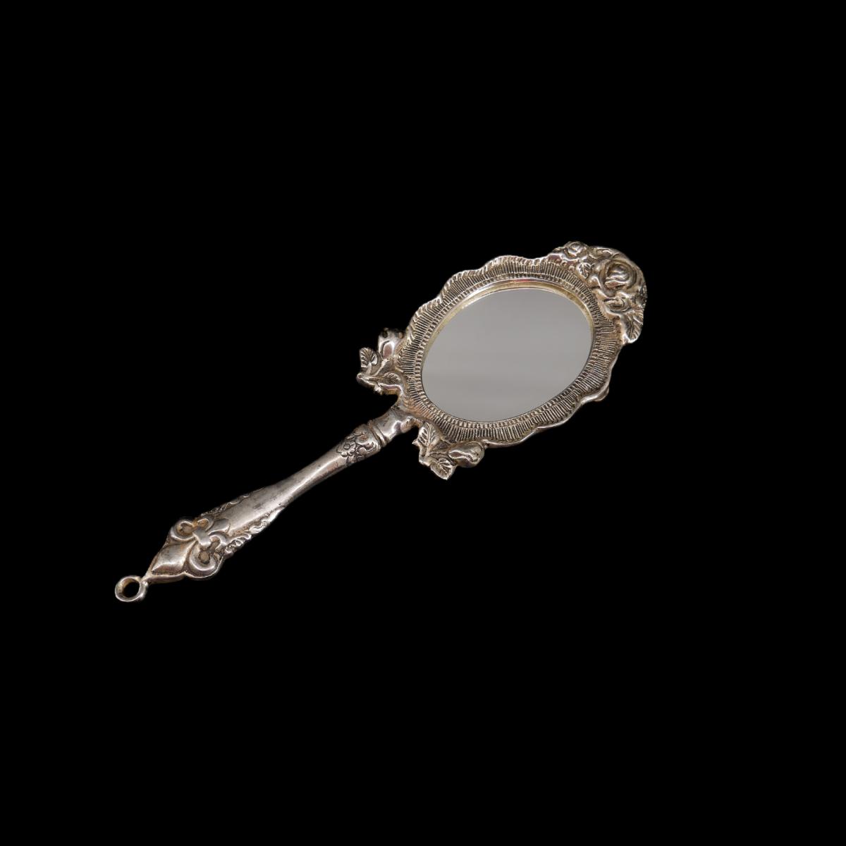 Vintage hand-held metal mirror by Two's Company. Beautifully ornate floral design. Made in India, great condition. Measures 9" in length and 3" across. Weighs 10 oz. (D41)