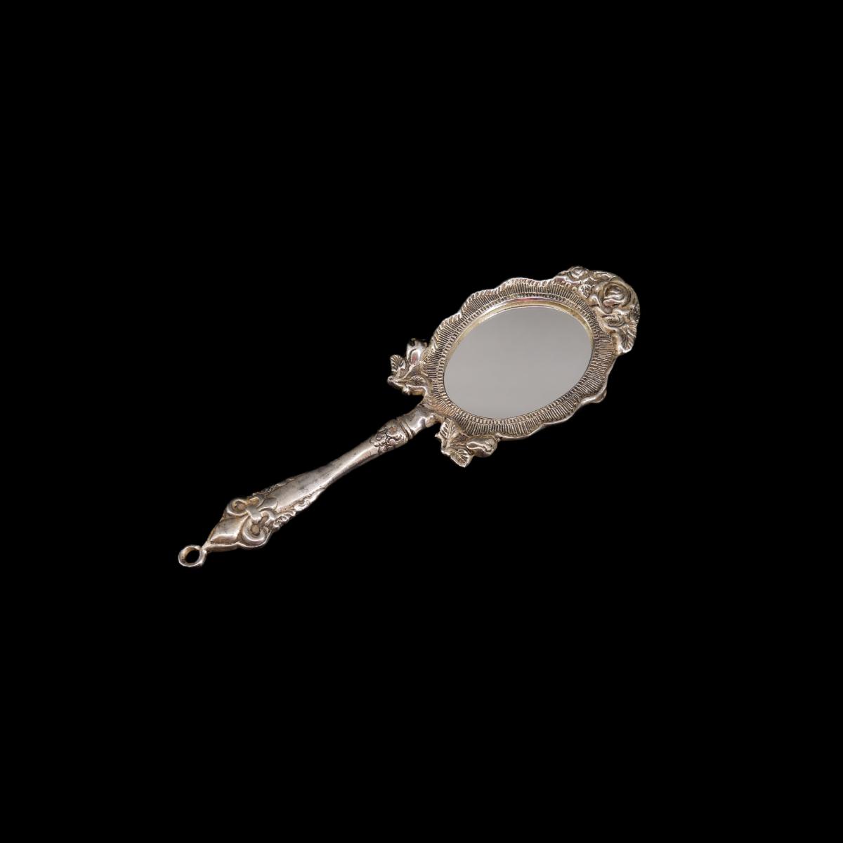 Vintage hand-held metal mirror by Two's Company. Beautifully ornate floral design. Made in India, great condition. Measures 9" in length and 3" across. Weighs 10 oz. (D41)