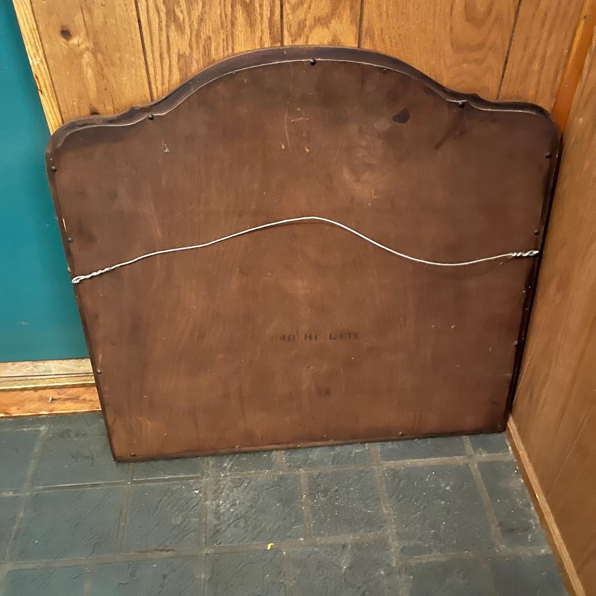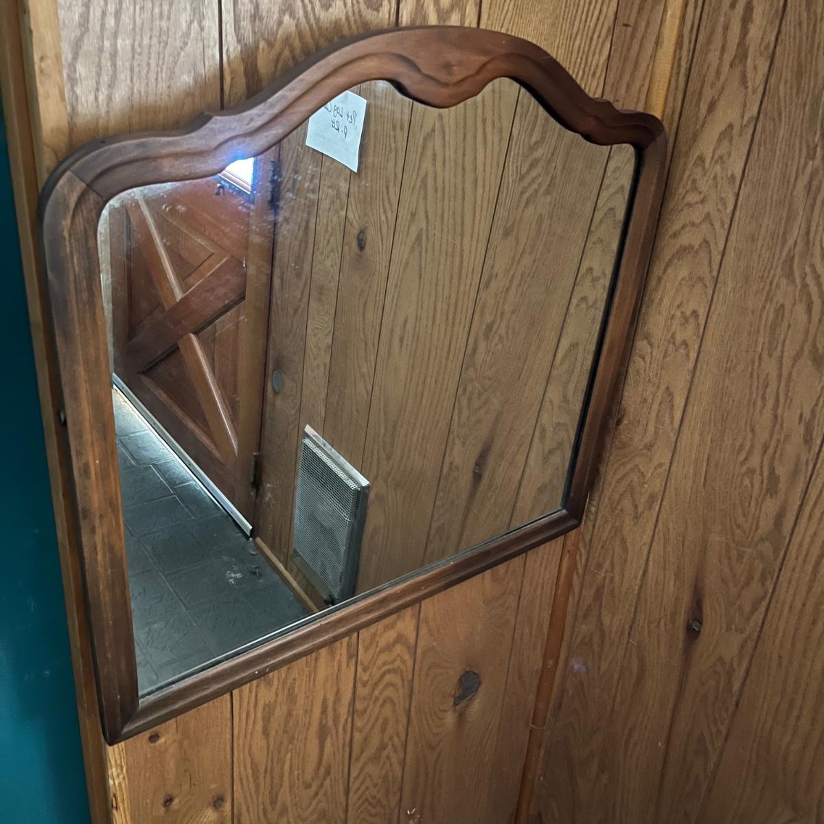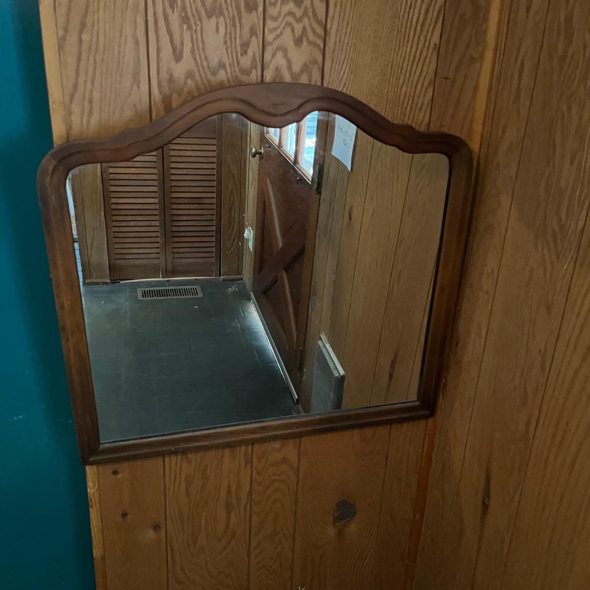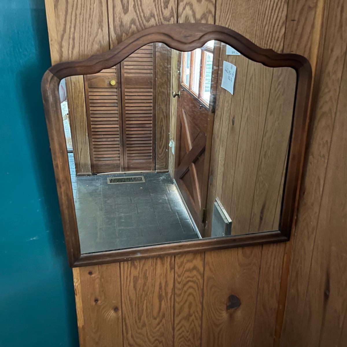 This vintage mirror has a wooden frame and appears to have come from a dresser as it has a place for a screw on each side, see pictures. A wire is attached for hanging on the wall. Mirror measures 27” x 28”.