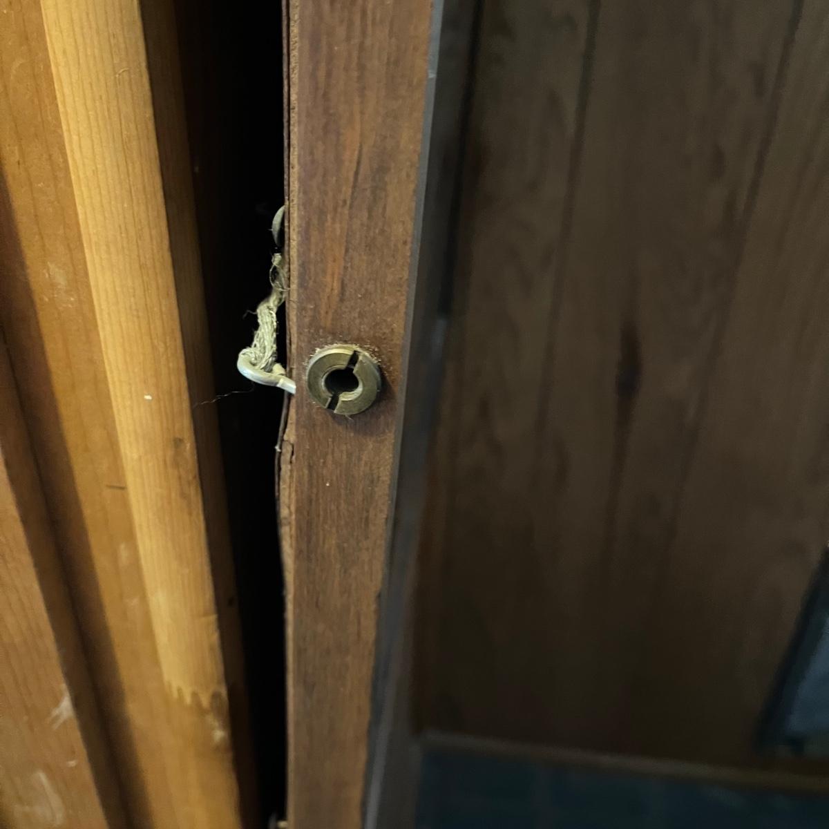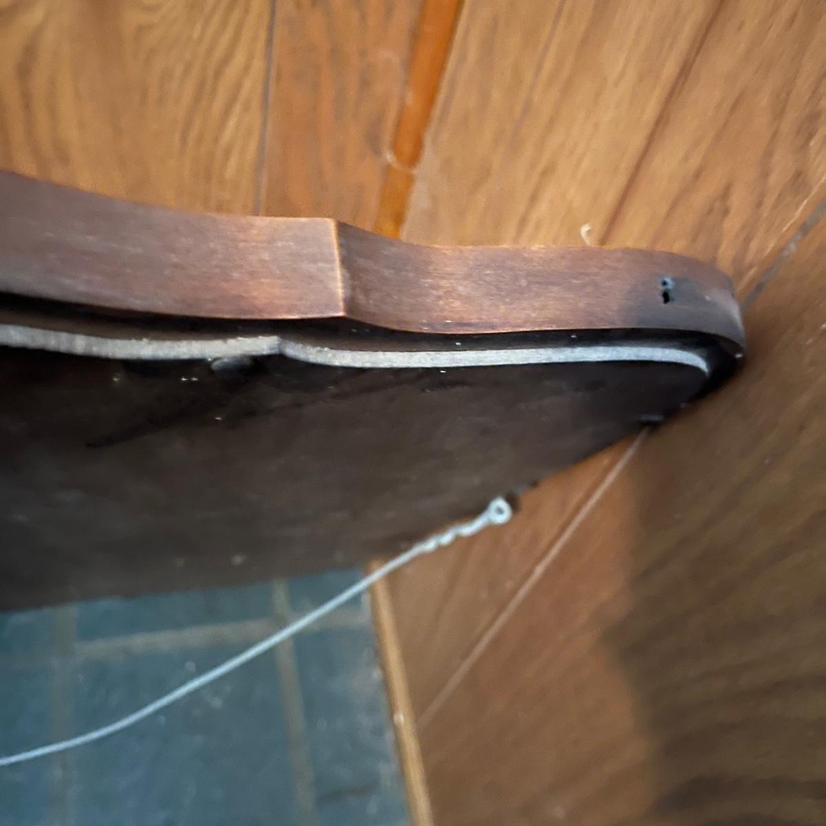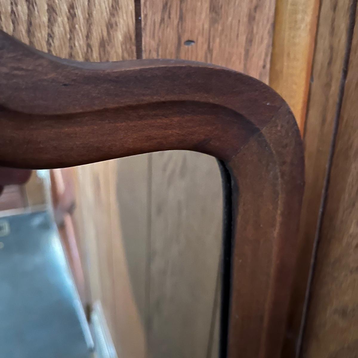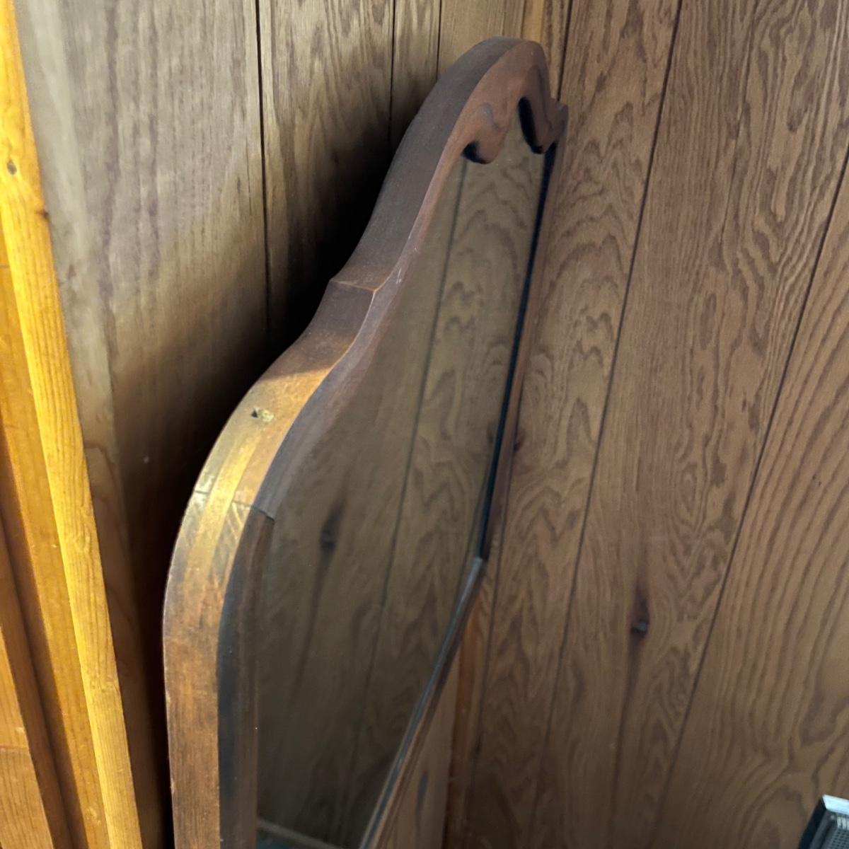 This vintage mirror has a wooden frame and appears to have come from a dresser as it has a place for a screw on each side, see pictures. A wire is attached for hanging on the wall. Mirror measures 27” x 28”.