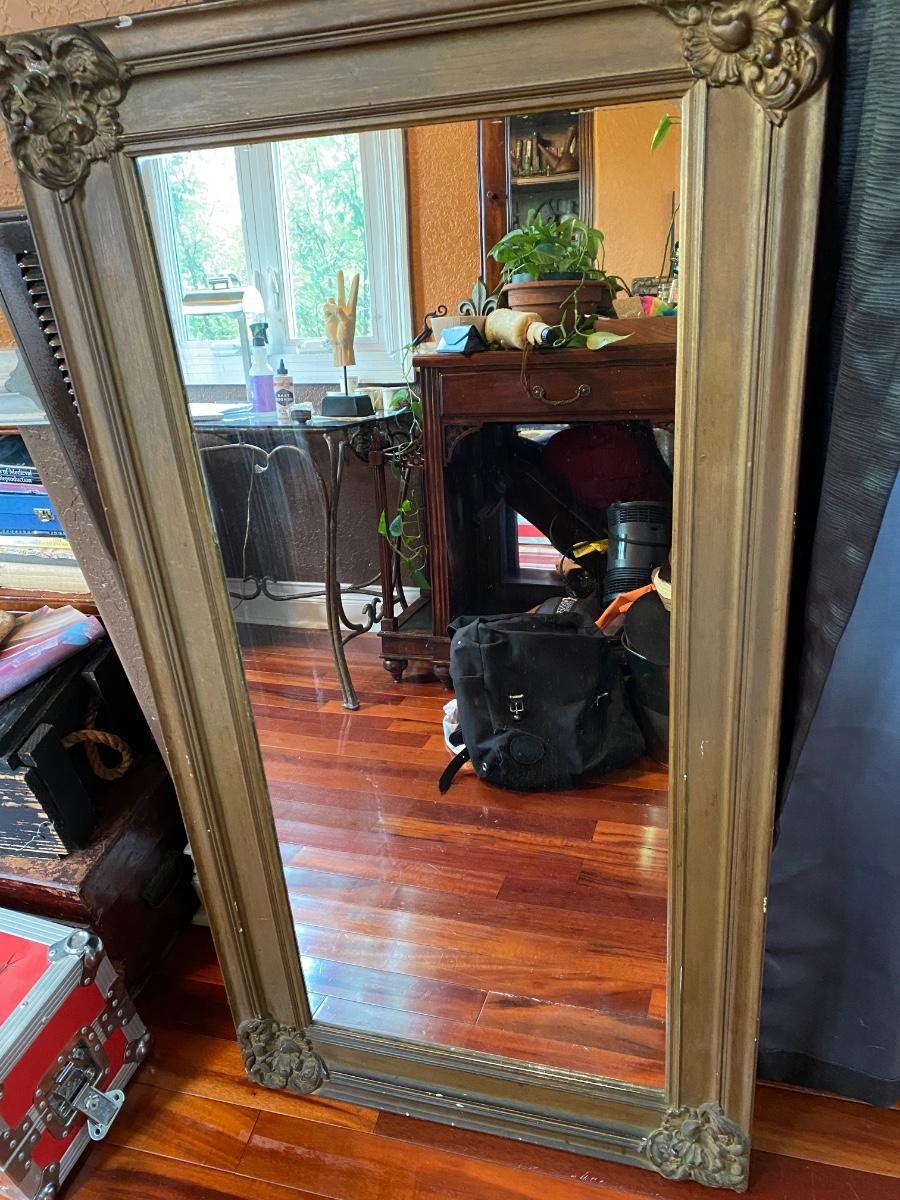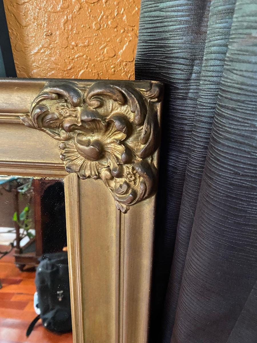 Vintage mirror w/ornate frame. Shows some wear. Hangs vertically. 24-3/4 x 46-1/2