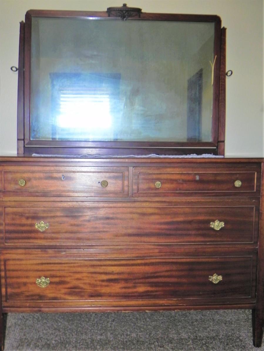 VINTAGE MIRRORED DRESSER MEASURES 48X24X65" 4 DRAWERS 2 SMALL 2 LARGE, TILTING MIRROR AND ORIGINAL
