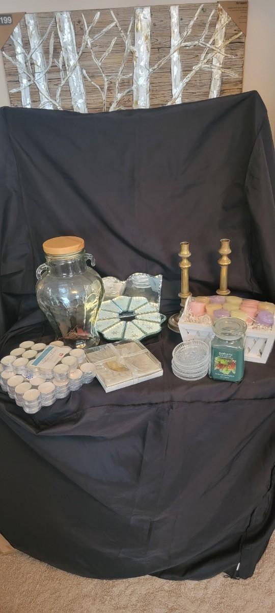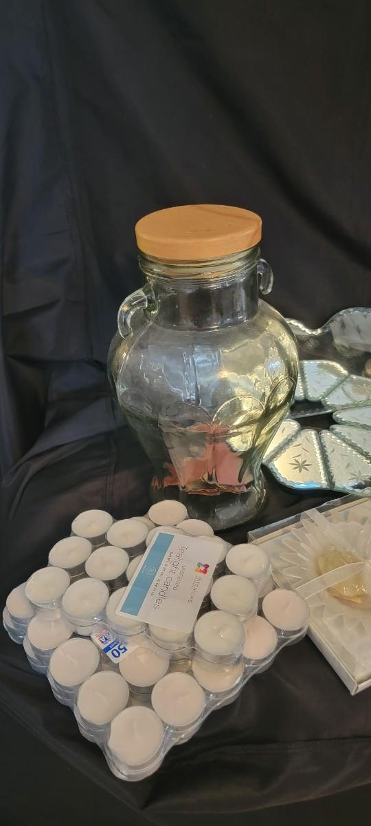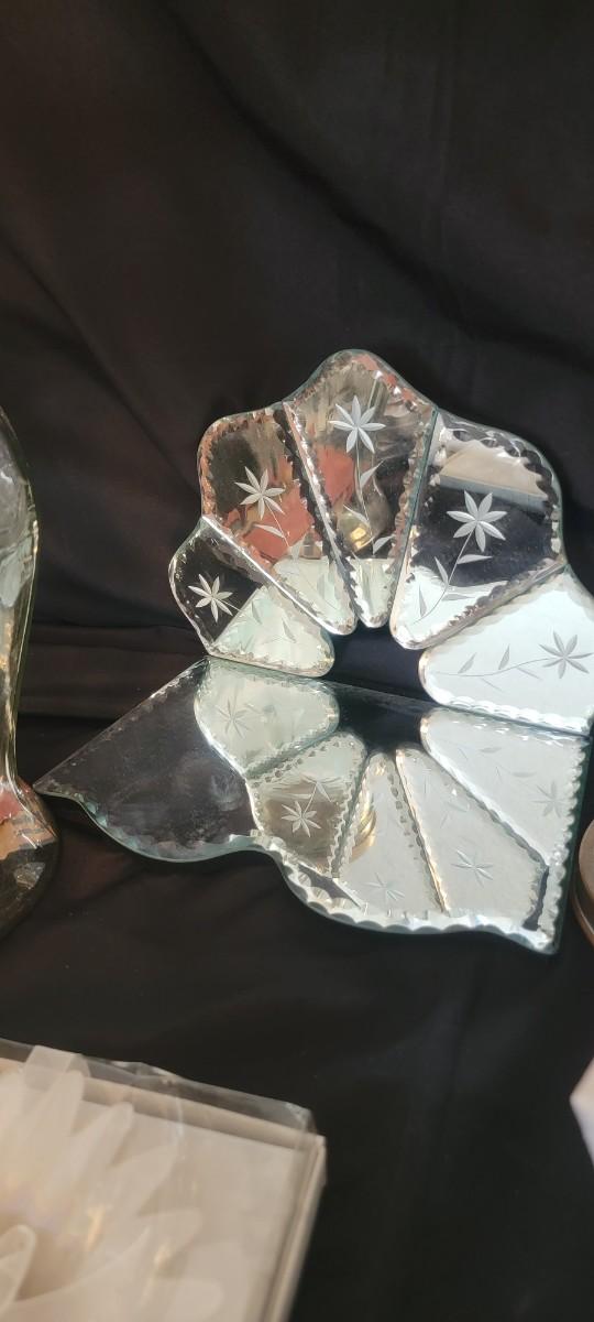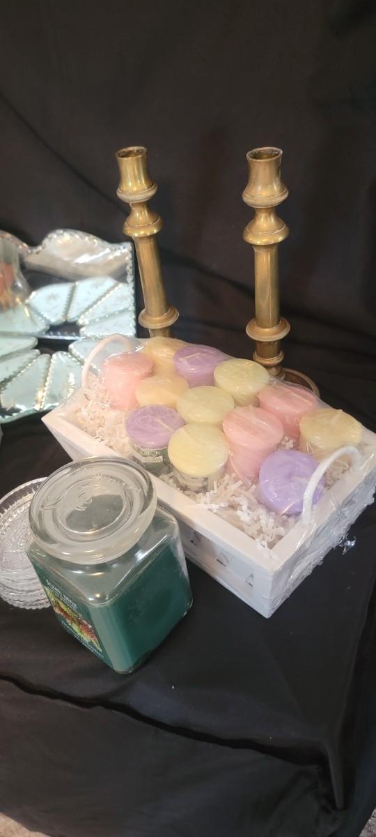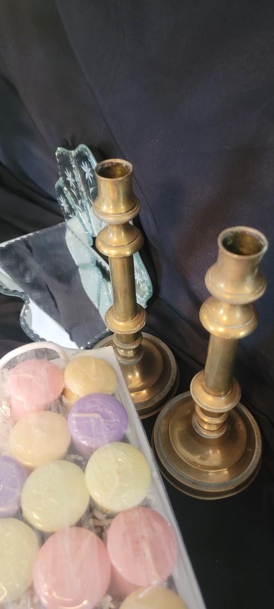 Vintage mirror wall shelf, brass candle holders, candles and more!
