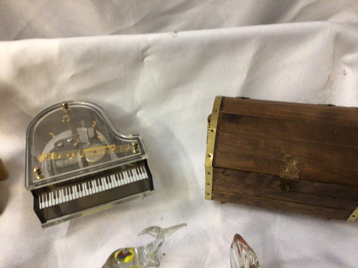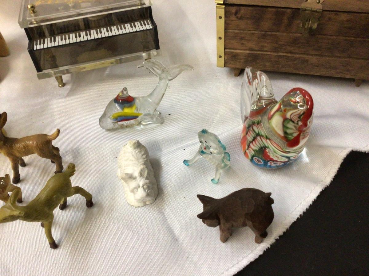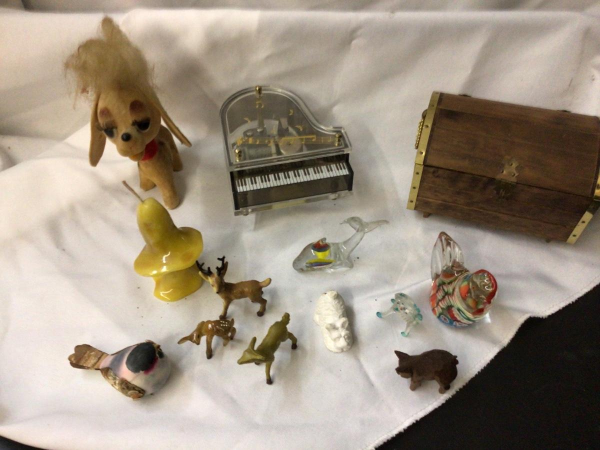 You get piano music box, wood chest jewelry and music box, glass chicken, glass fish, mushroom candle, dog and cat fig, bird, and deer.