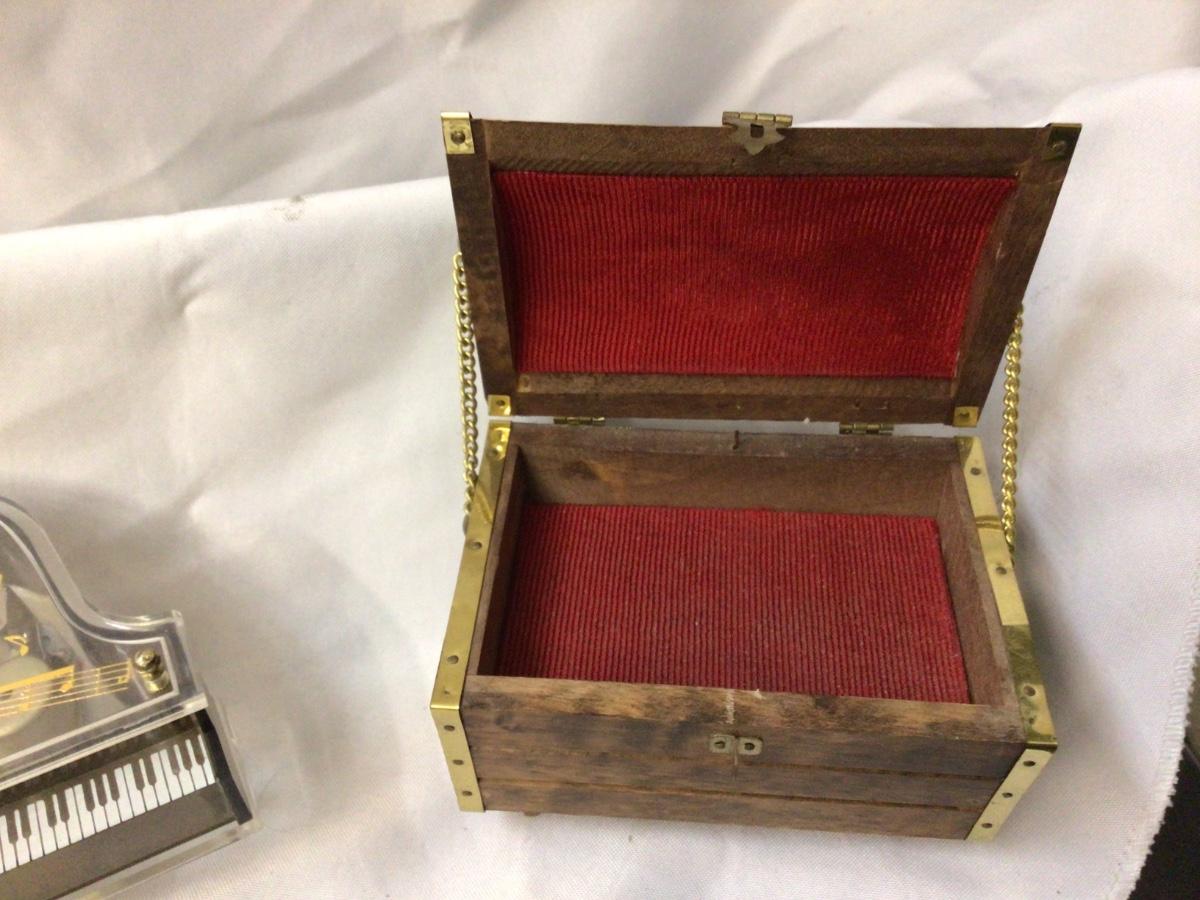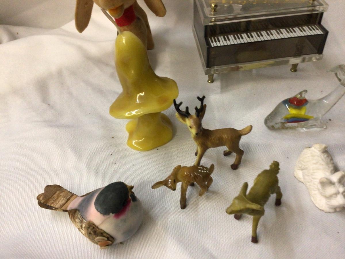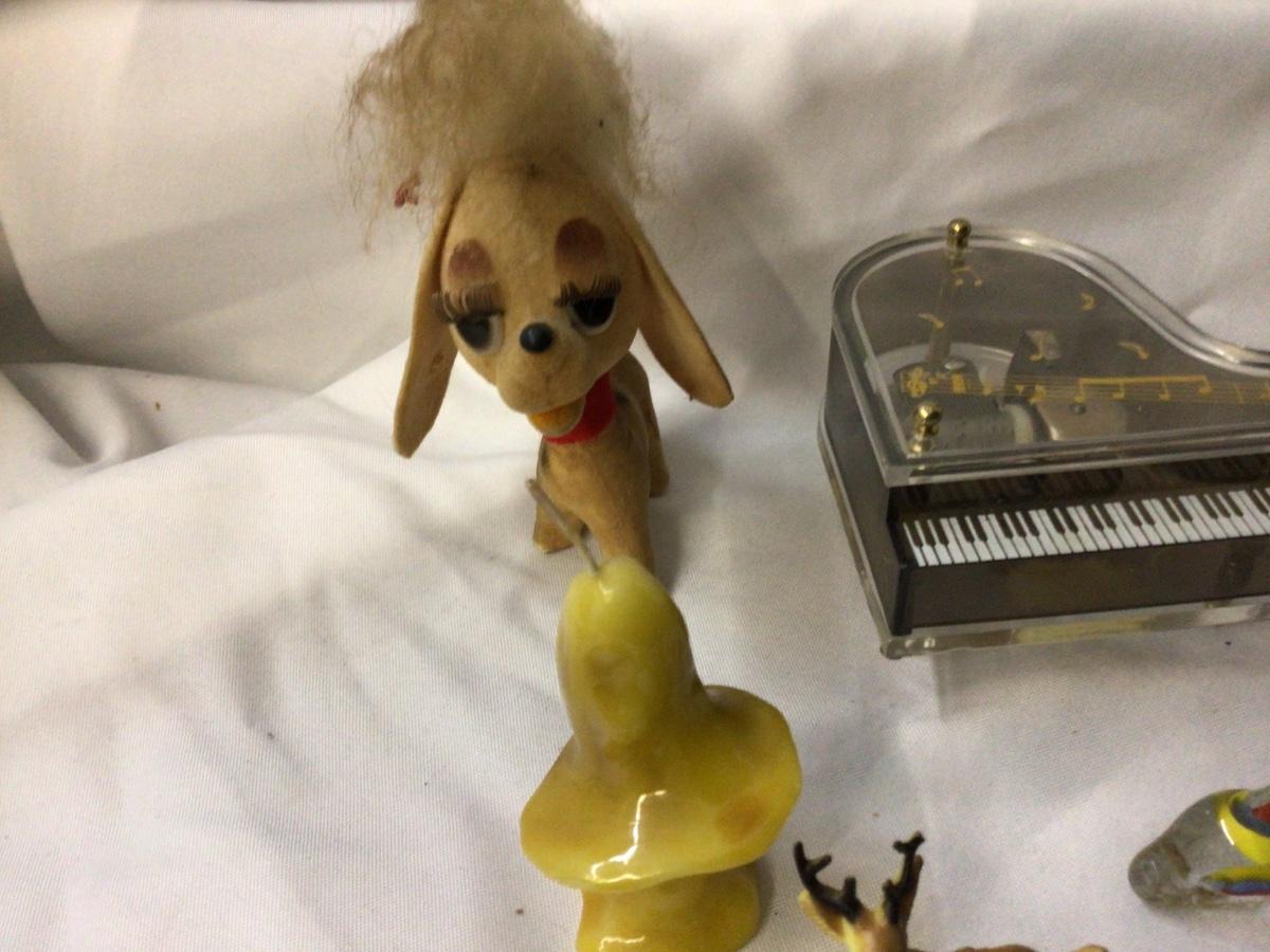 You get piano music box, wood chest jewelry and music box, glass chicken, glass fish, mushroom candle, dog and cat fig, bird, and deer.