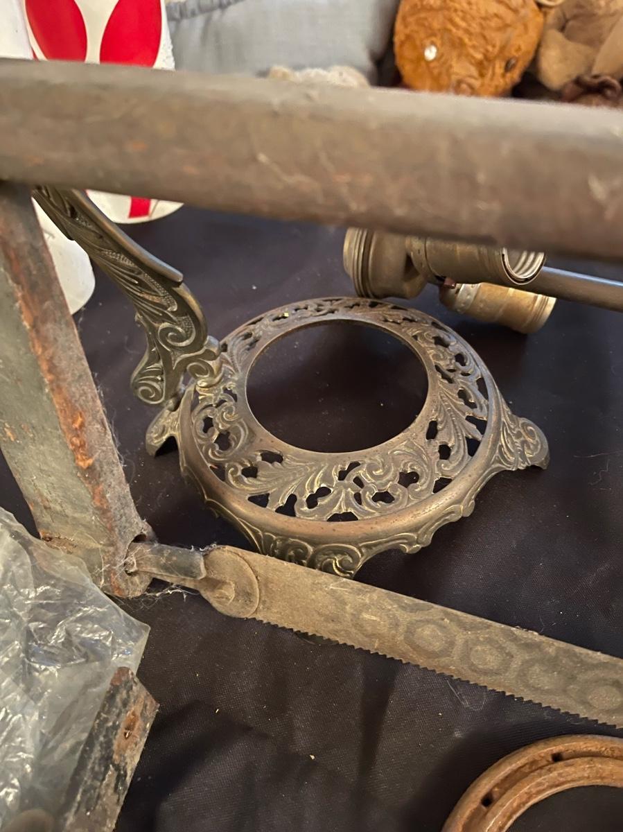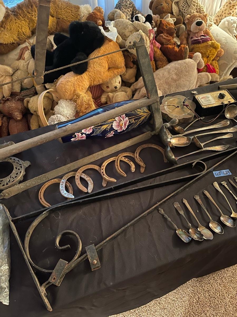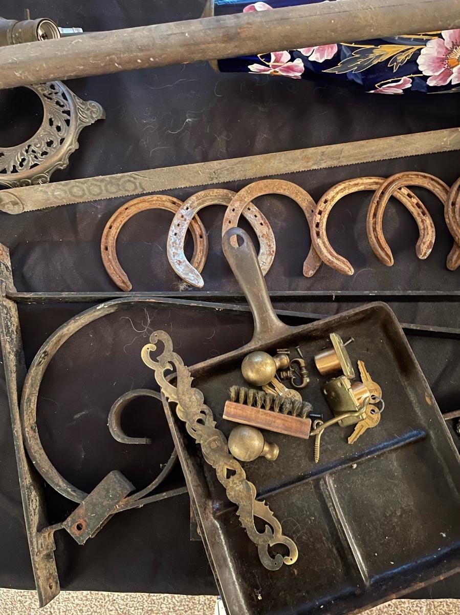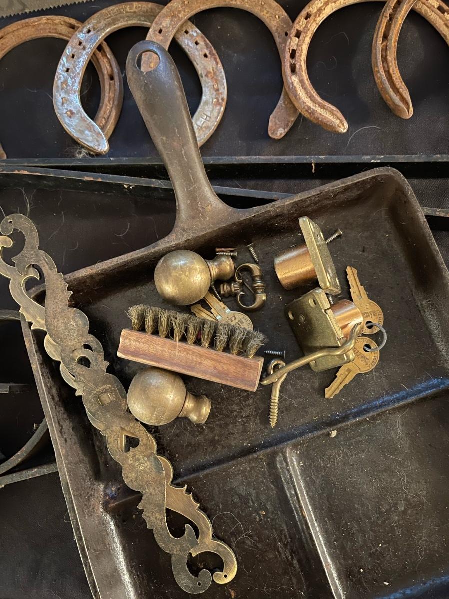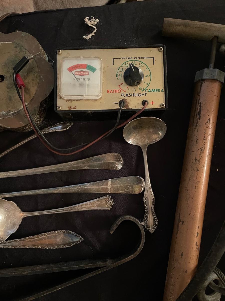 Huge vintage misc. metal lot - spoons, horseshoes, lamp, Wagner ware cast iron skillet, saw, Ray-o-vac battery tester, metal pump, pulley and more!