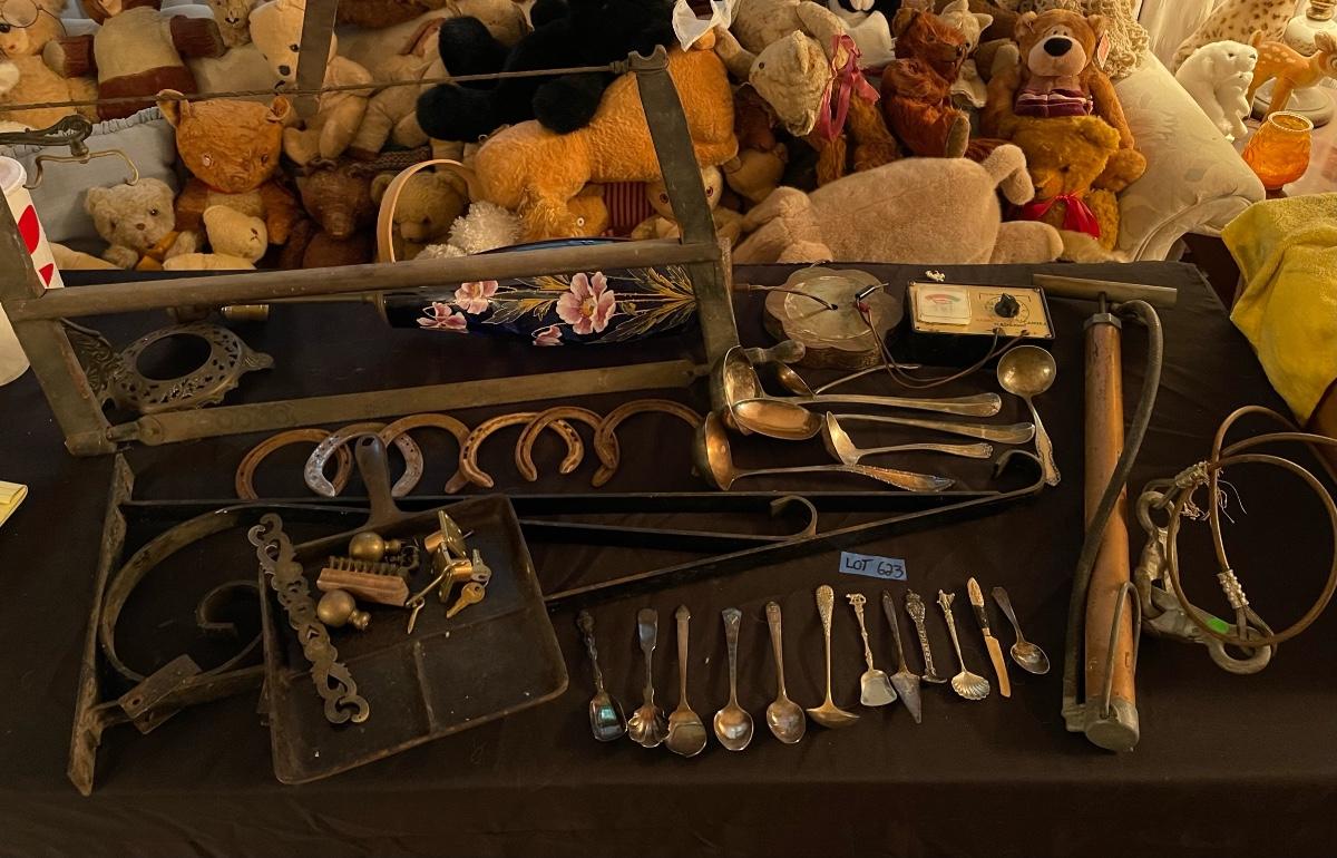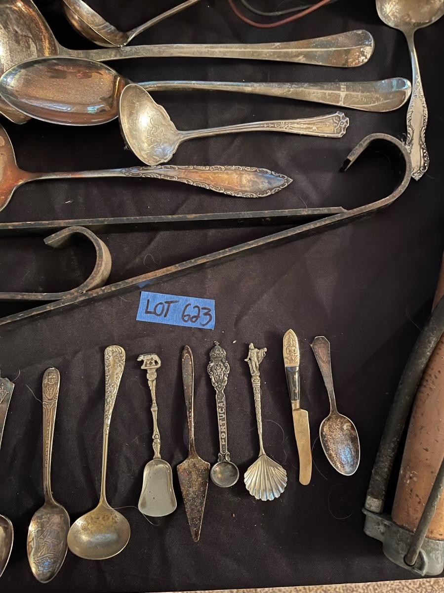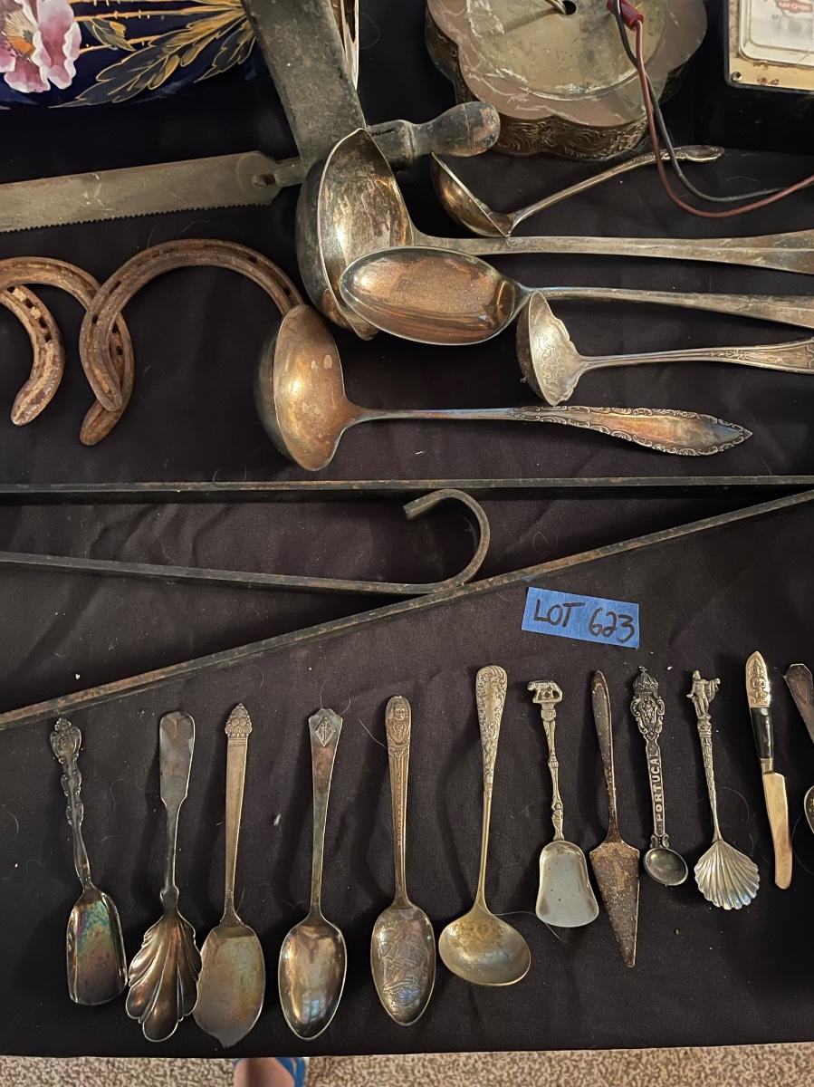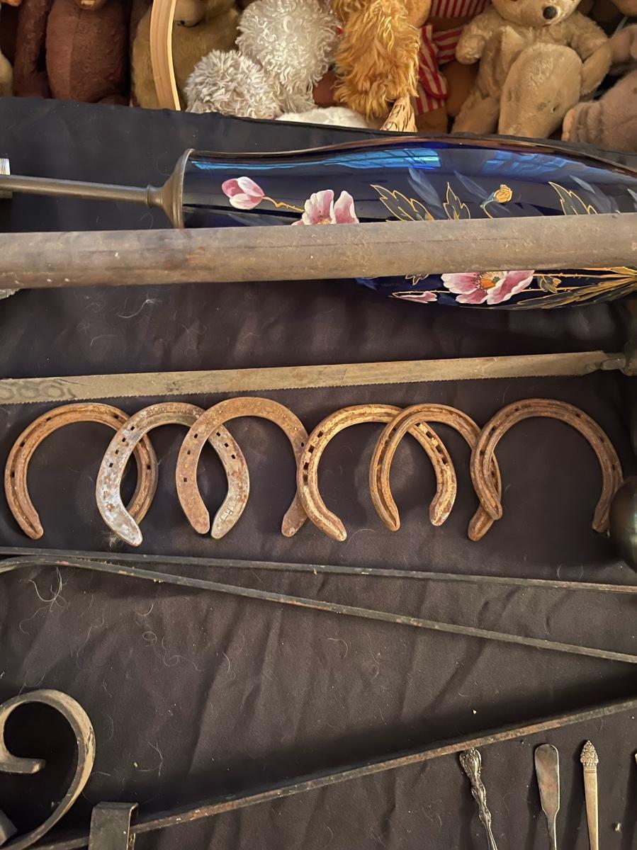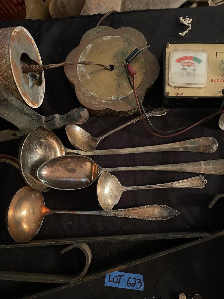 Huge vintage misc. metal lot - spoons, horseshoes, lamp, Wagner ware cast iron skillet, saw, Ray-o-vac battery tester, metal pump, pulley and more!