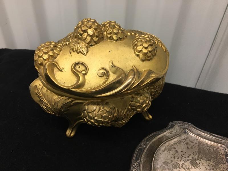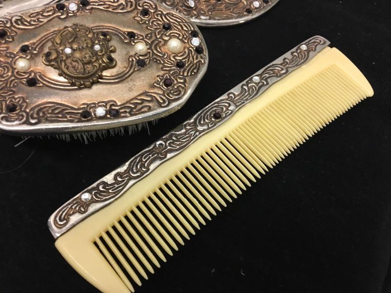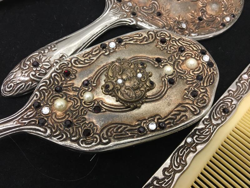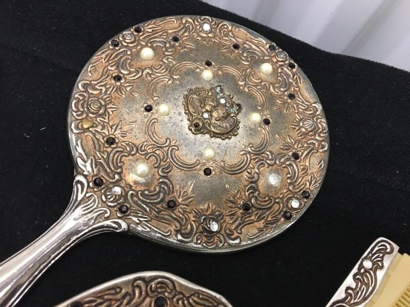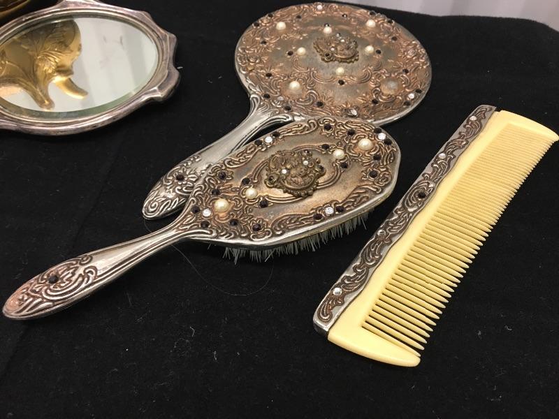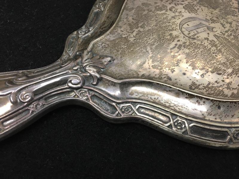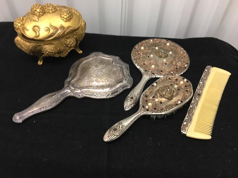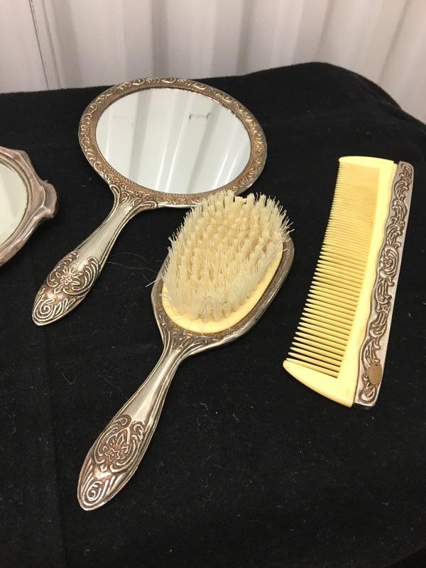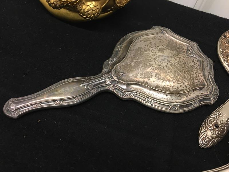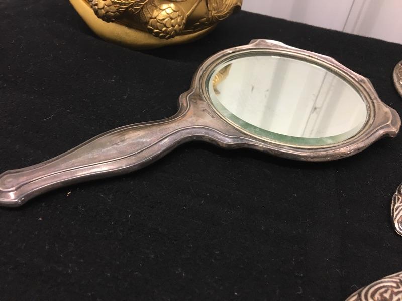This collection of five metalware items is in very good condition. One mirror is marked sterling.