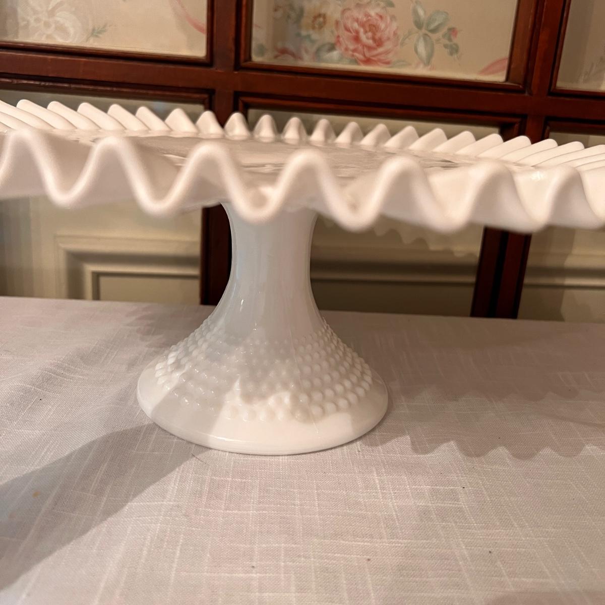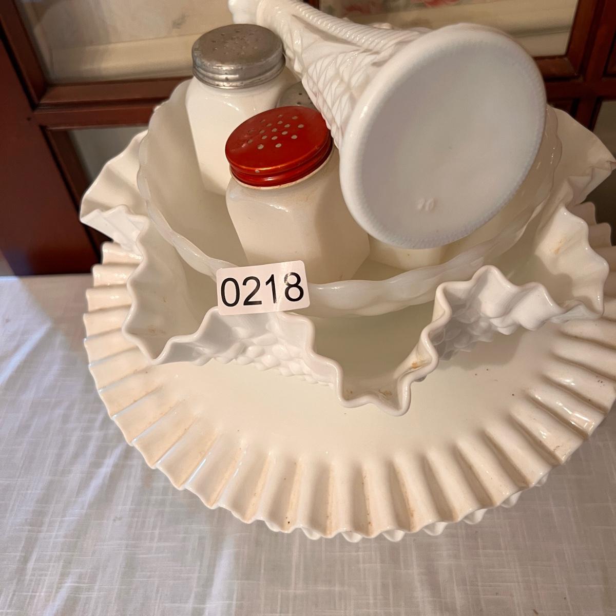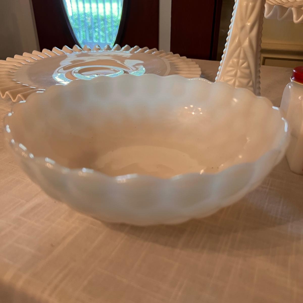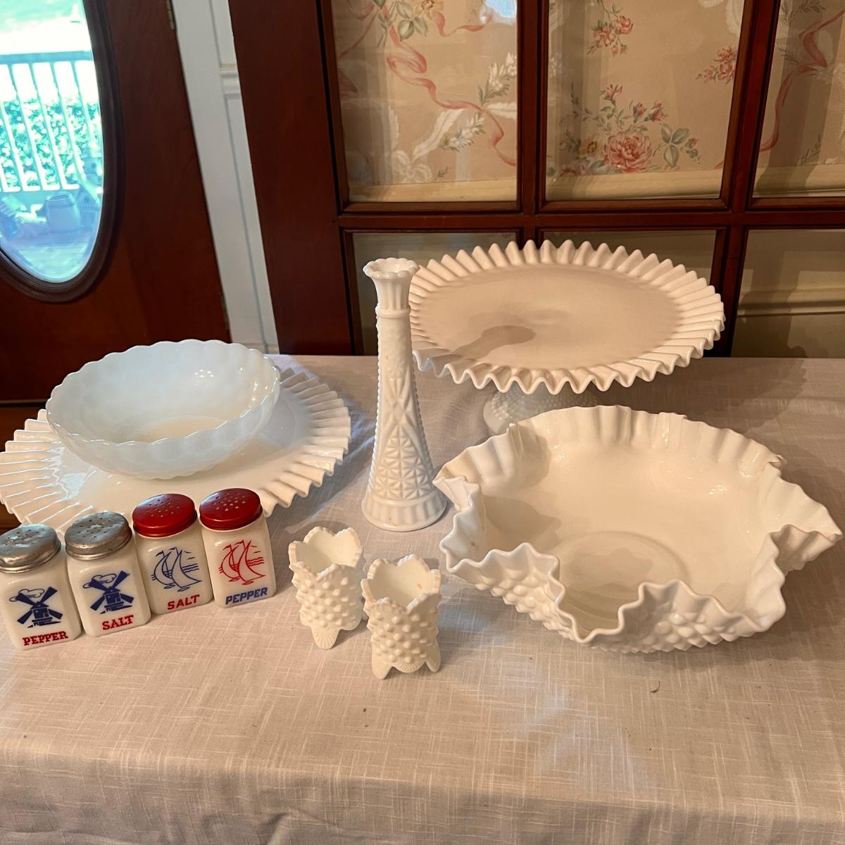 2 sets milk glass salt and pepper shakers, looks to be Fenton hobnail ruffle dish with matching 2 small budvases, looks to be Fenton ruffle cake stand, looks to be Fenton plate from a 2 tier cake stand, bowl and vase.