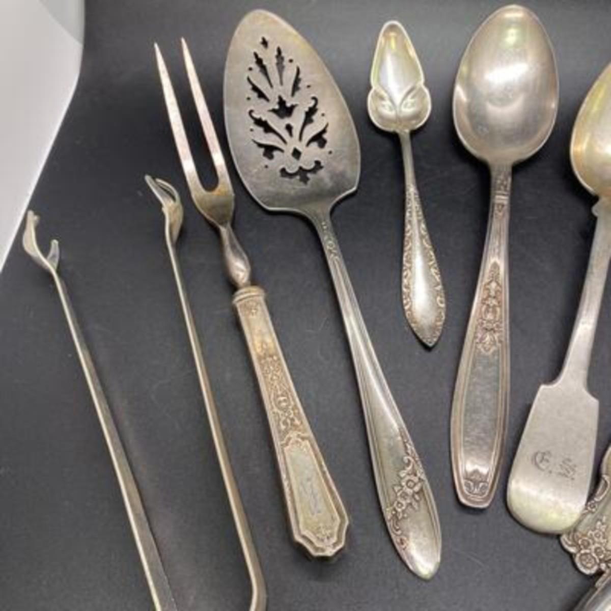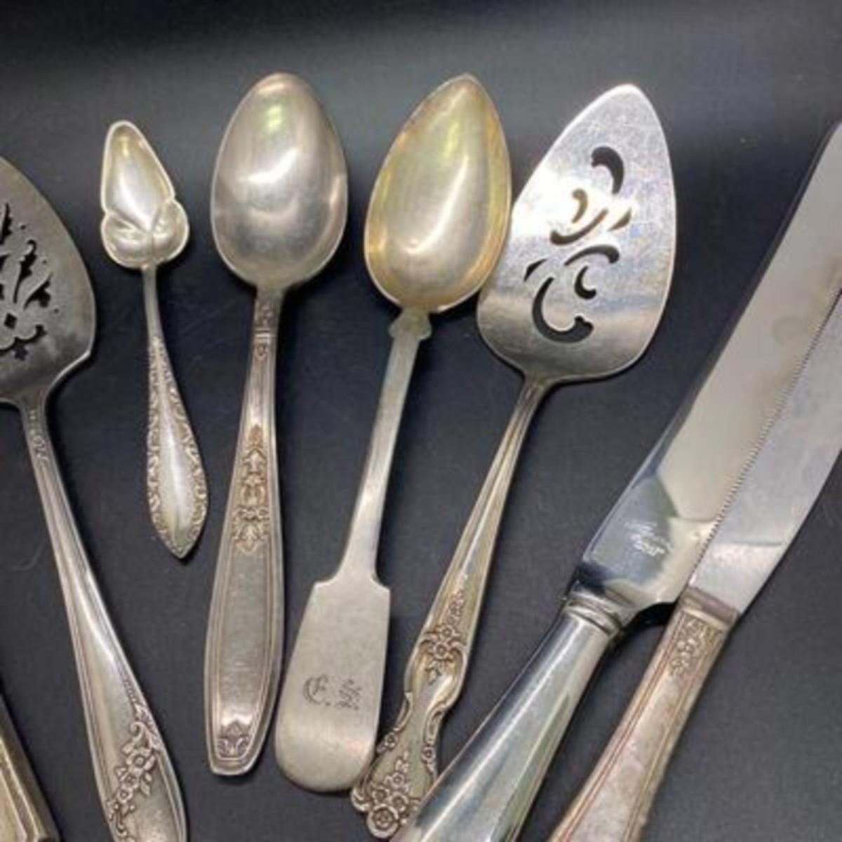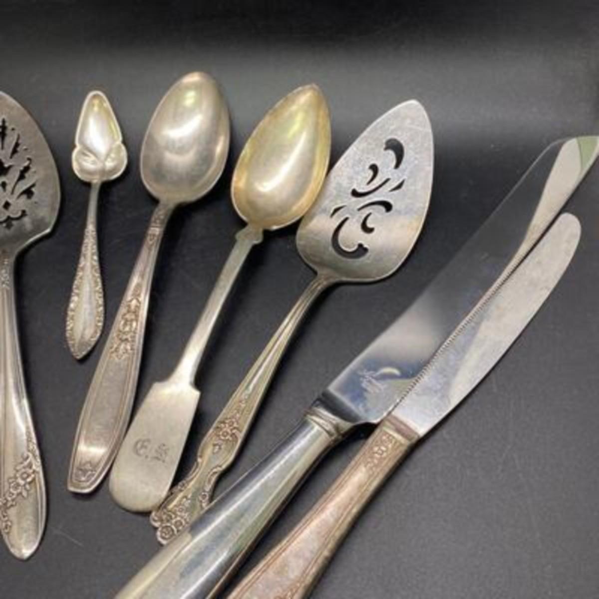 Mixed lot of hostess serving pieces. Silver plate flatware, variety of pieces and handle patterns. Good used condition, silver plate or stainless, no sterling in this lot.