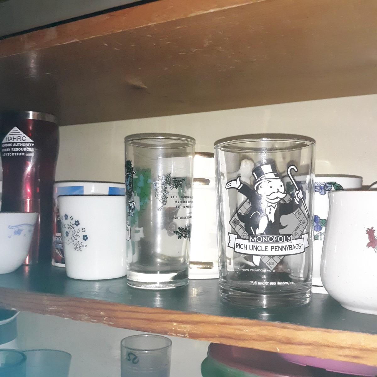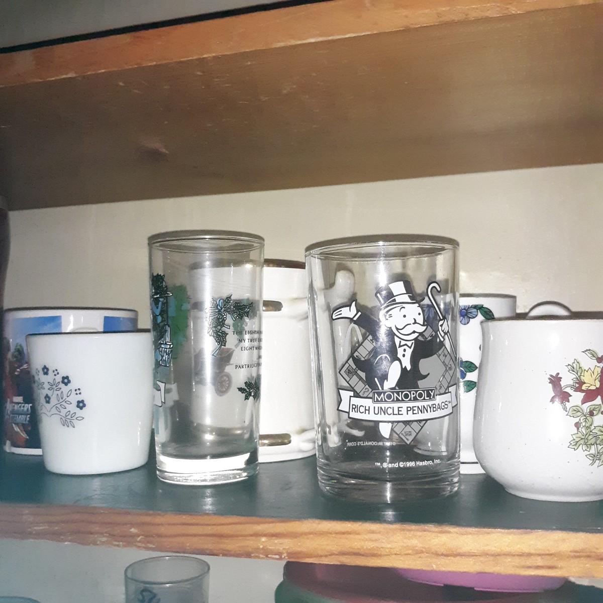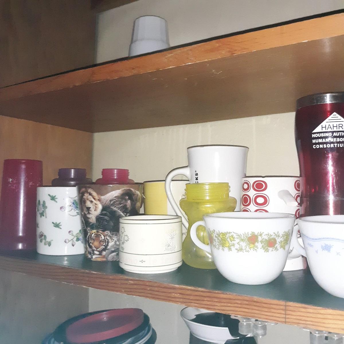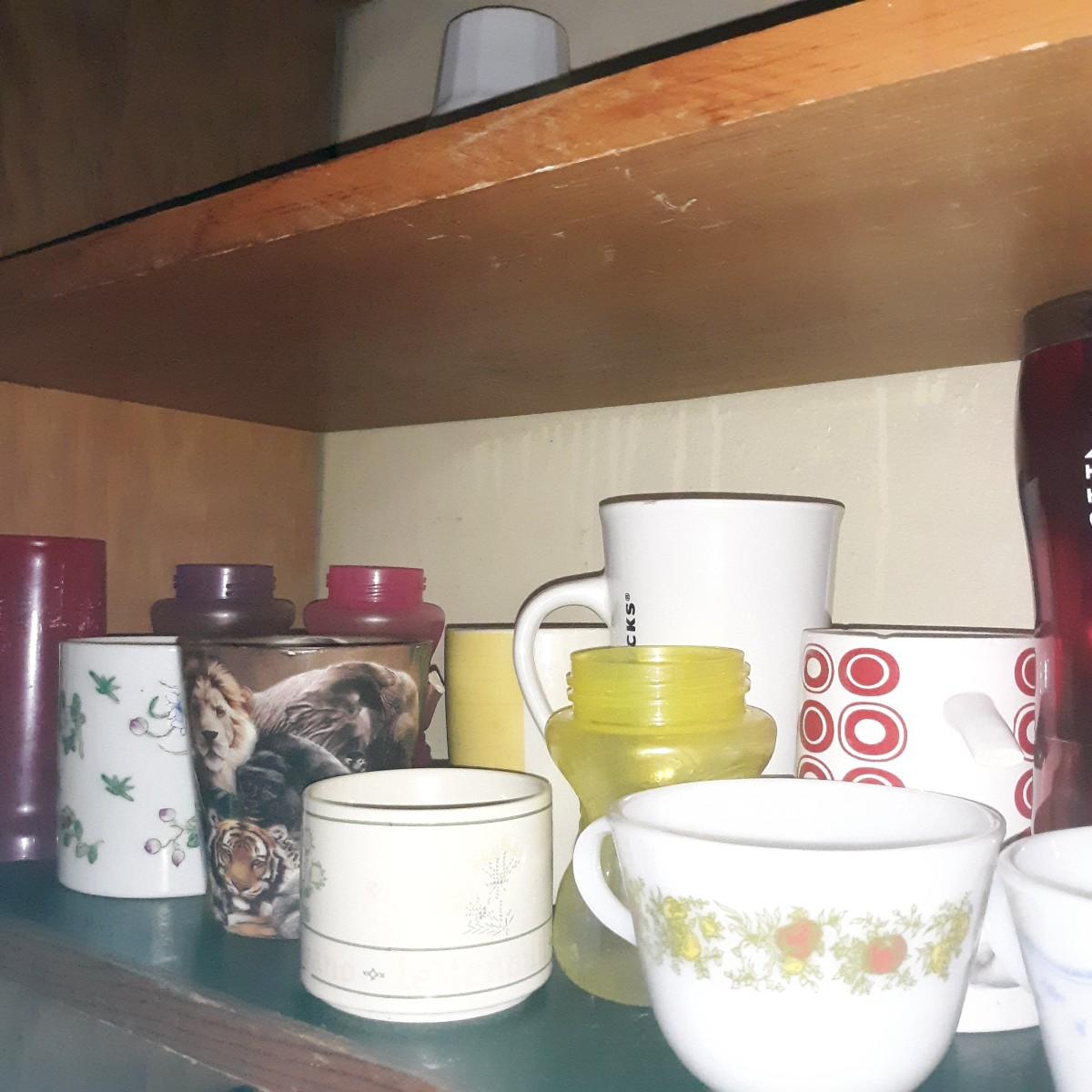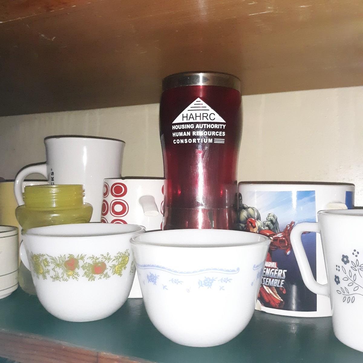 Vintage & Modern Mugs Glasses Lot Lot- 2nd shelf only; some mugs have missing handles or chipped lips, others are perfect. This lot cannot be shipped.