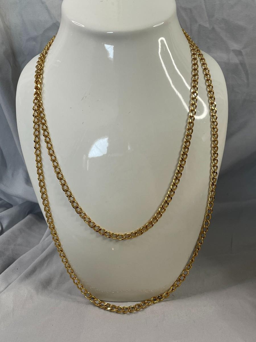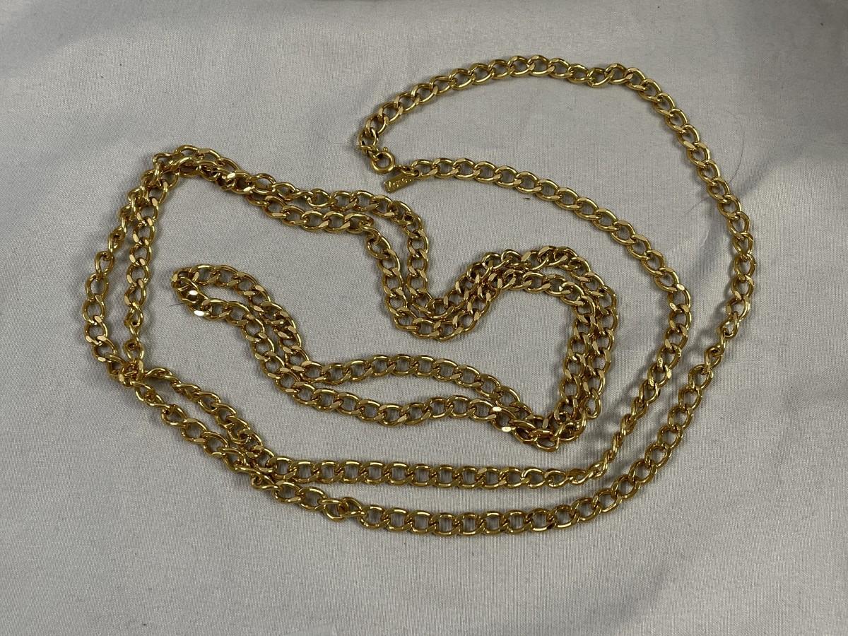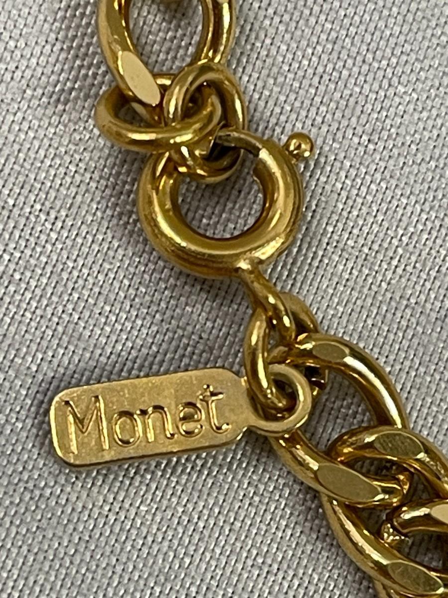 This chain is in excellent condition and made of a gold tone metal. It has the Monet tag and is about 55 inches long.
