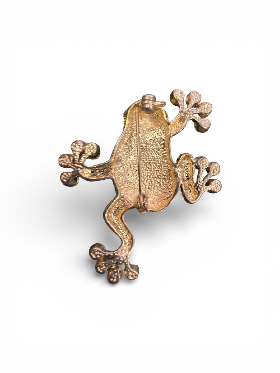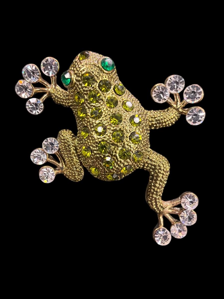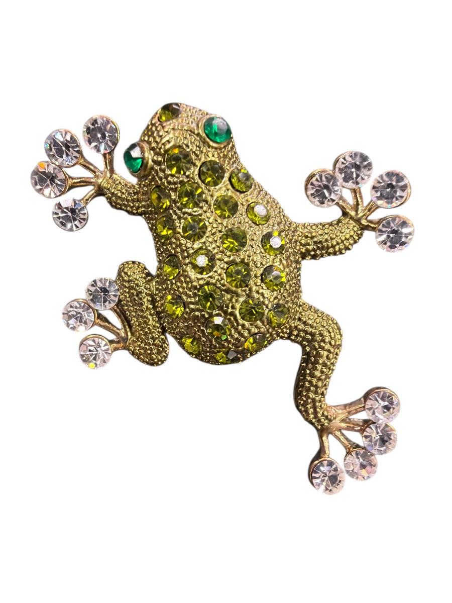 Vintage Monet Gold Tone Green Rhinestone Crawling Frog Brooch