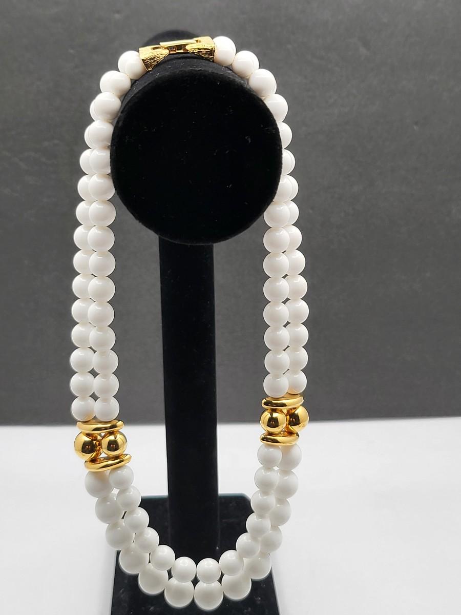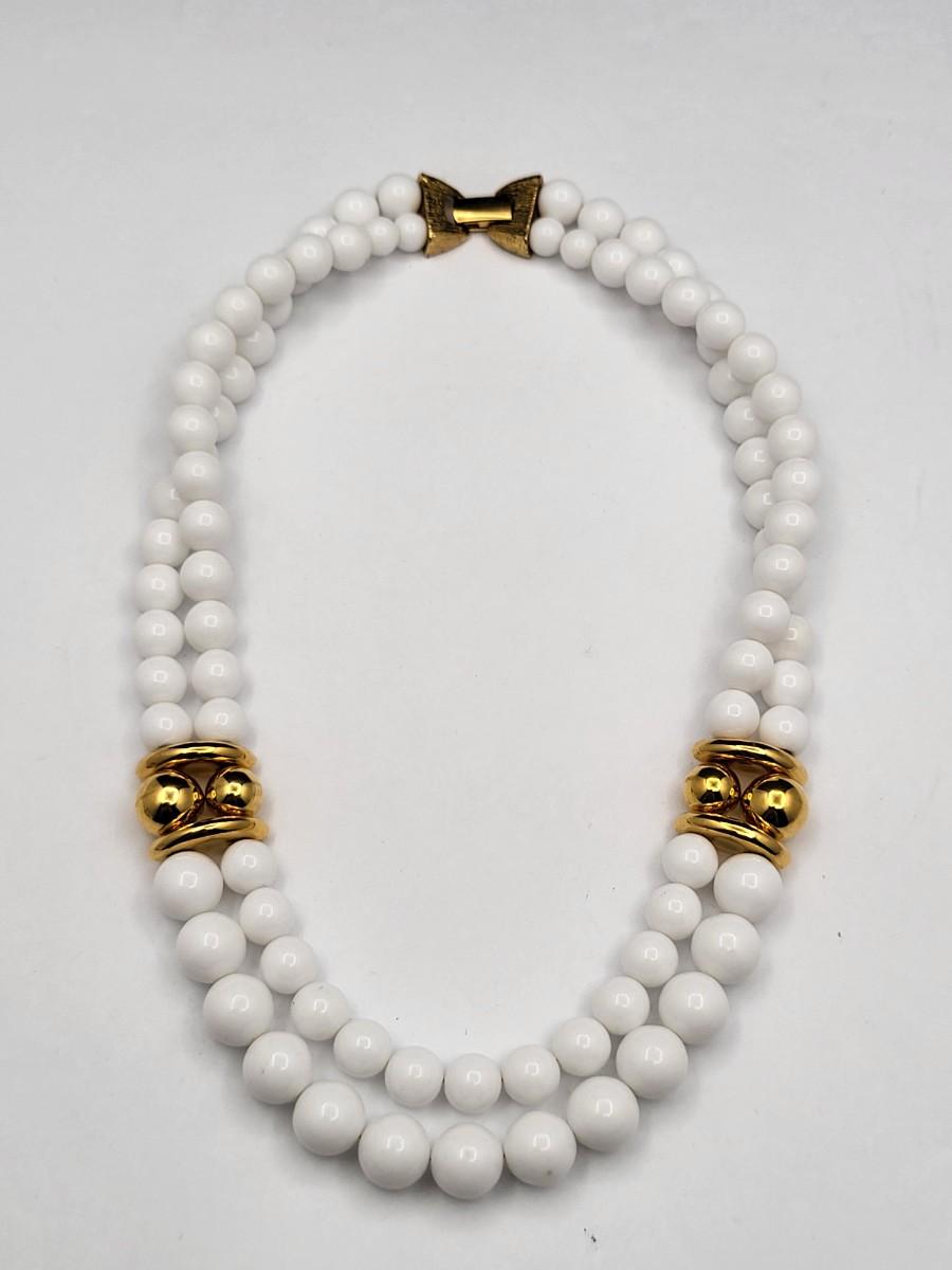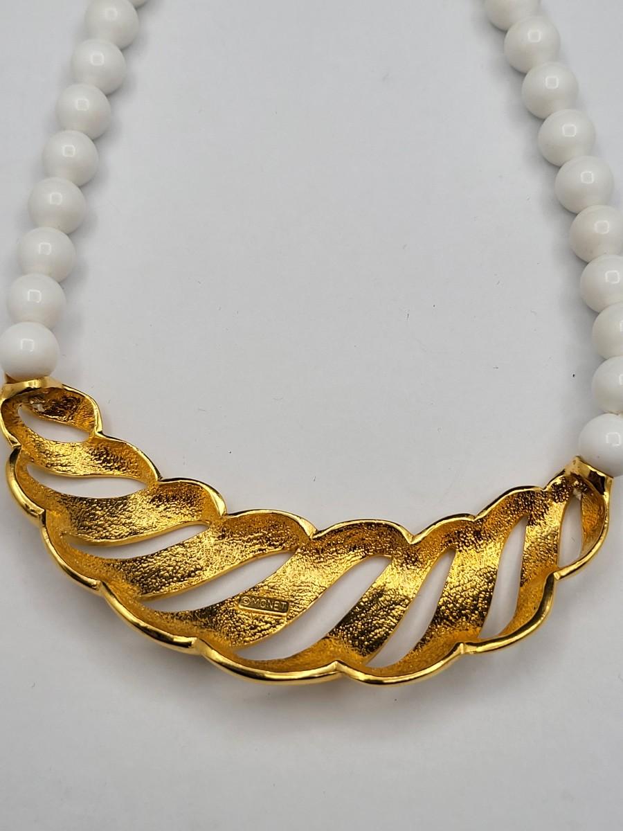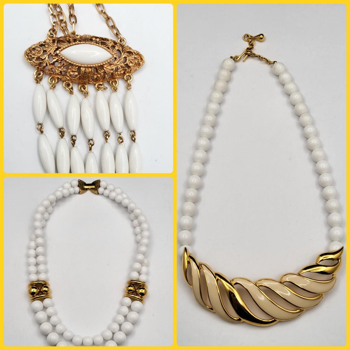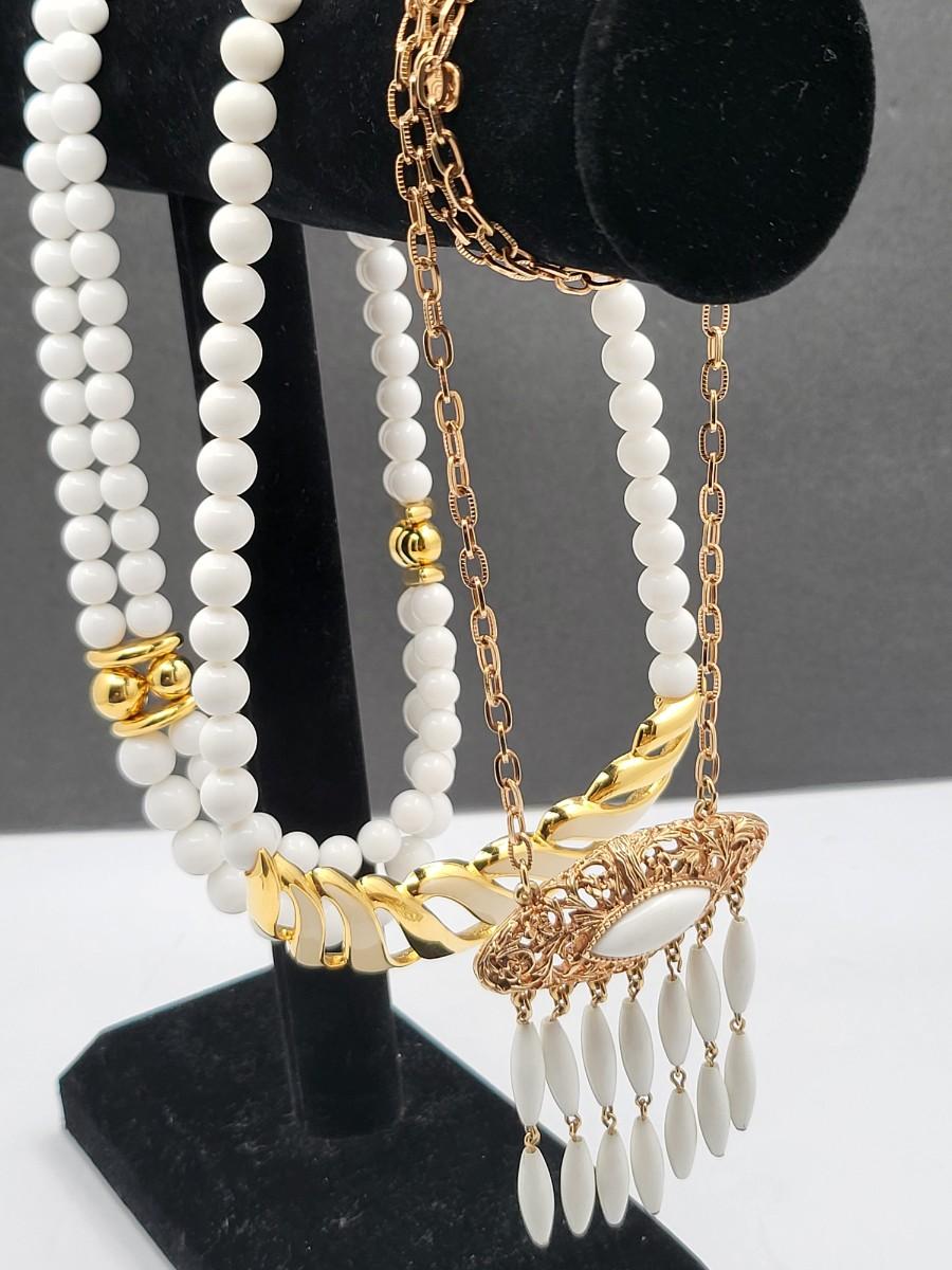 White bead and gold tone necklace trio - all signed - Monet, Napier and Emmons. 15" to 26".