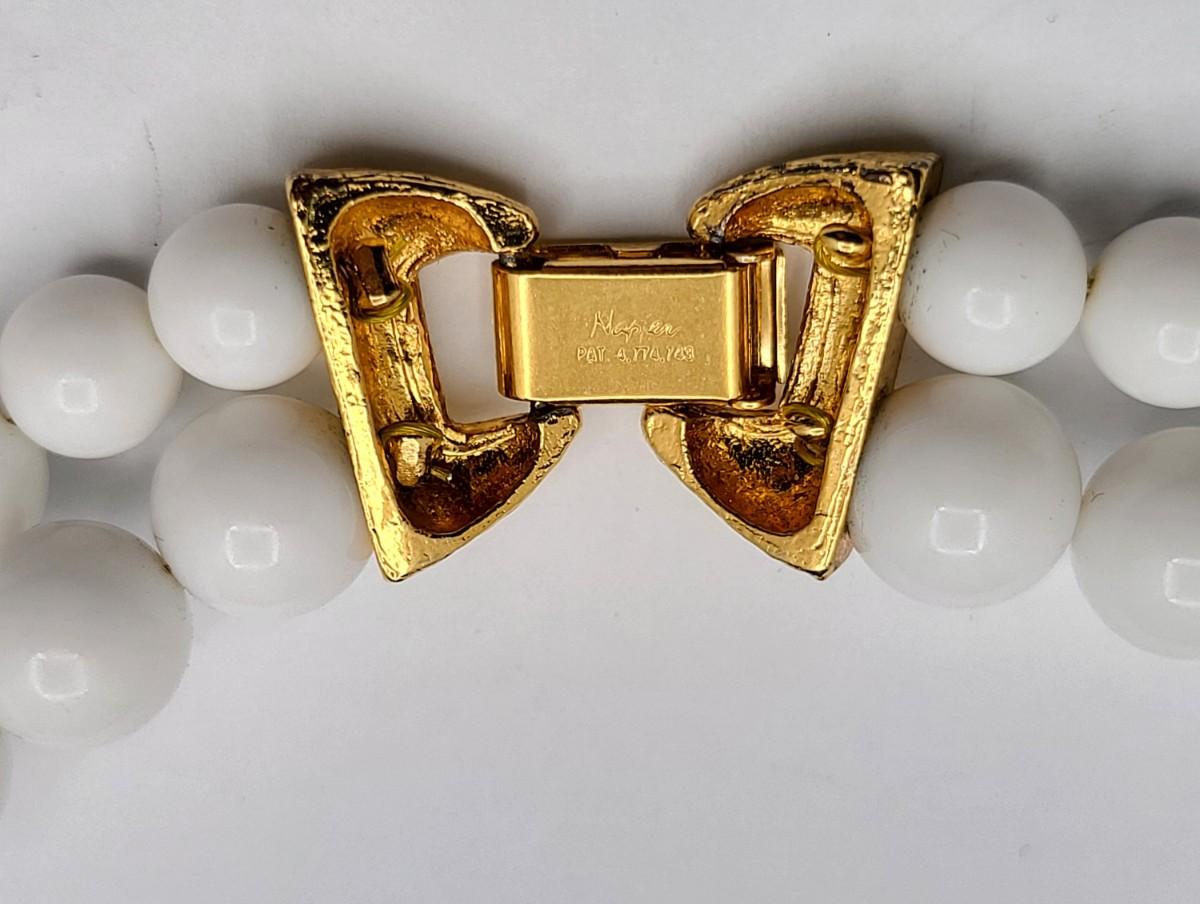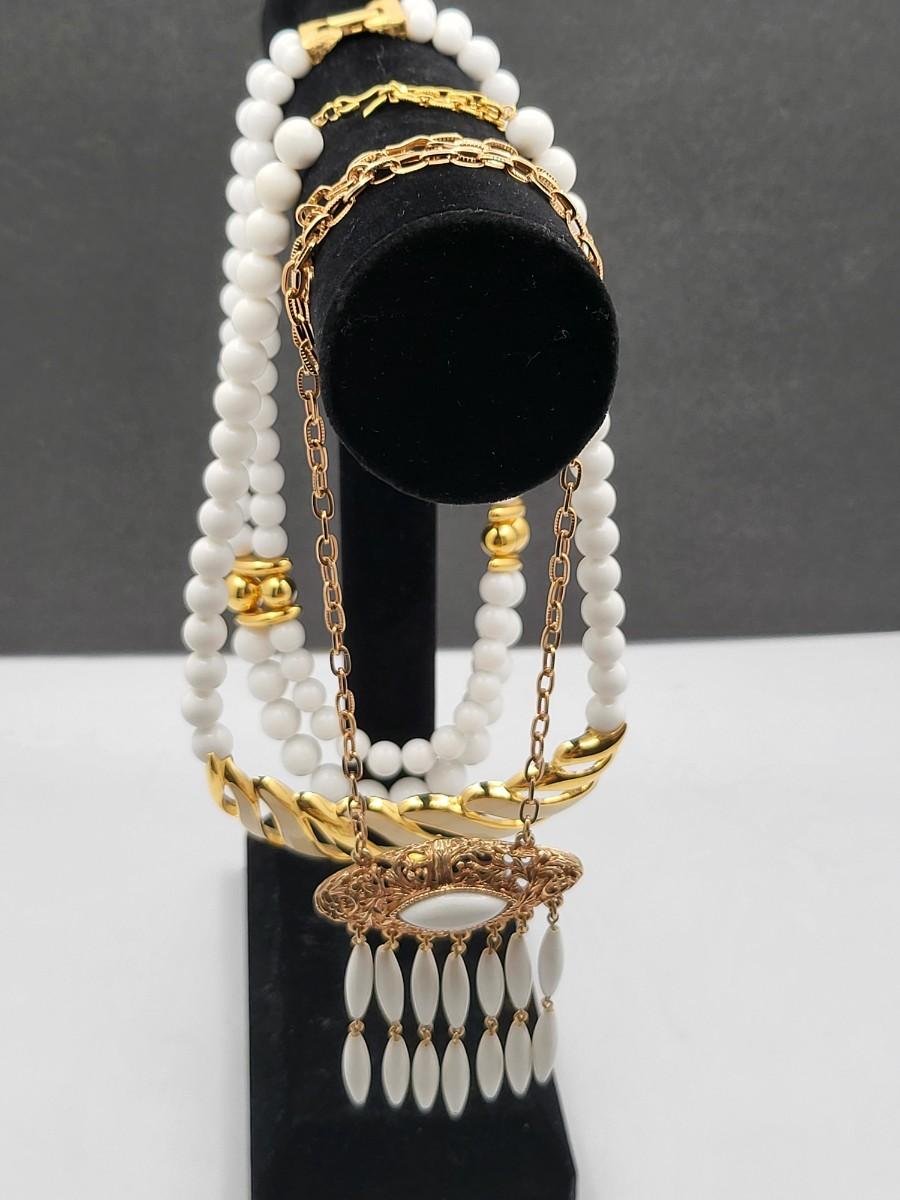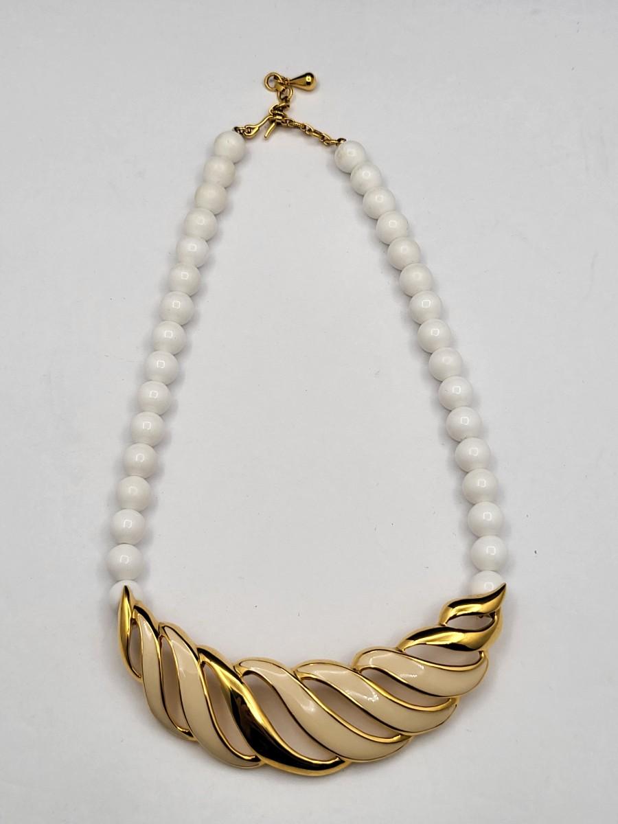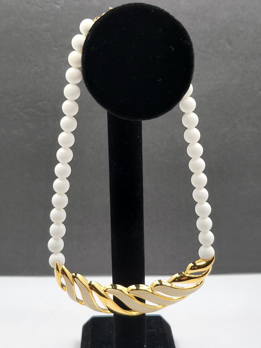 White bead and gold tone necklace trio - all signed - Monet, Napier and Emmons. 15" to 26".