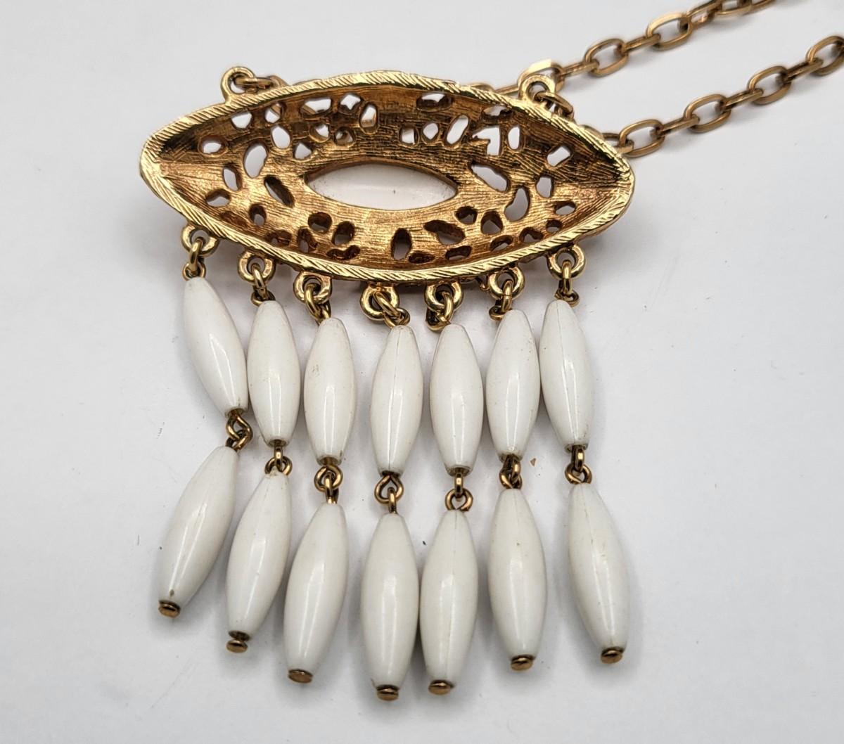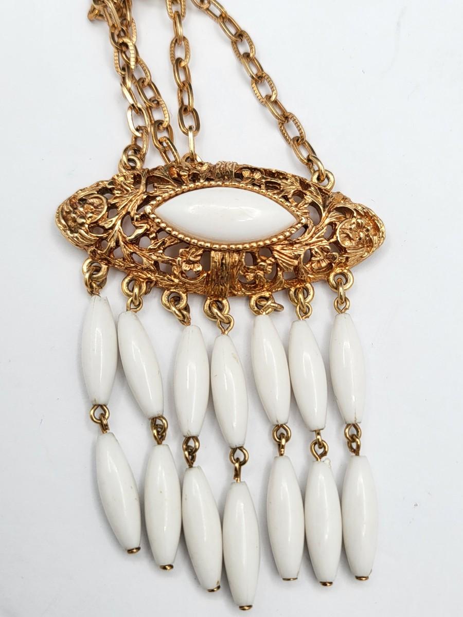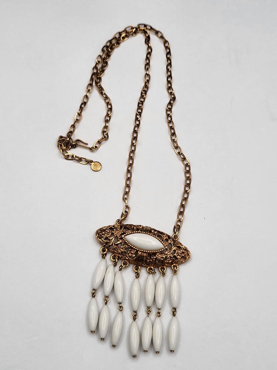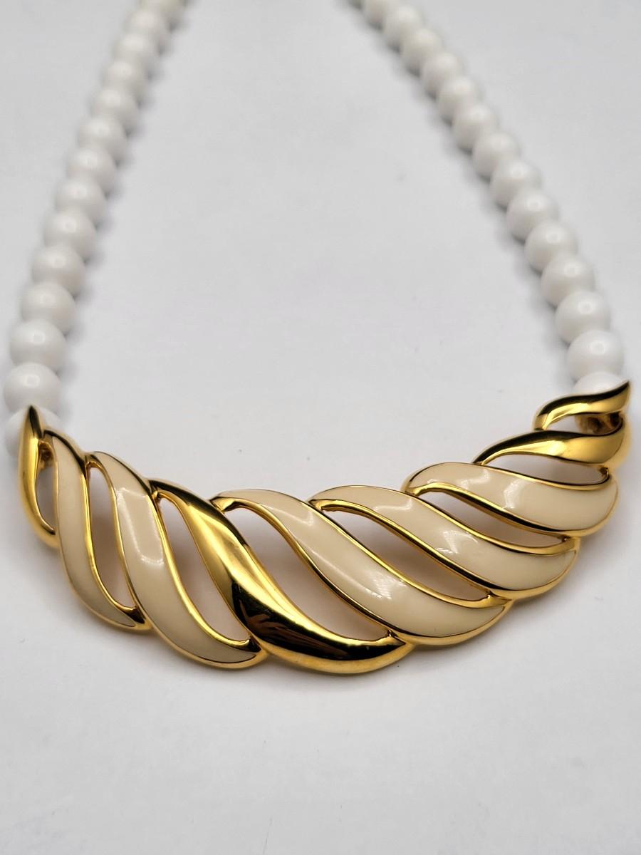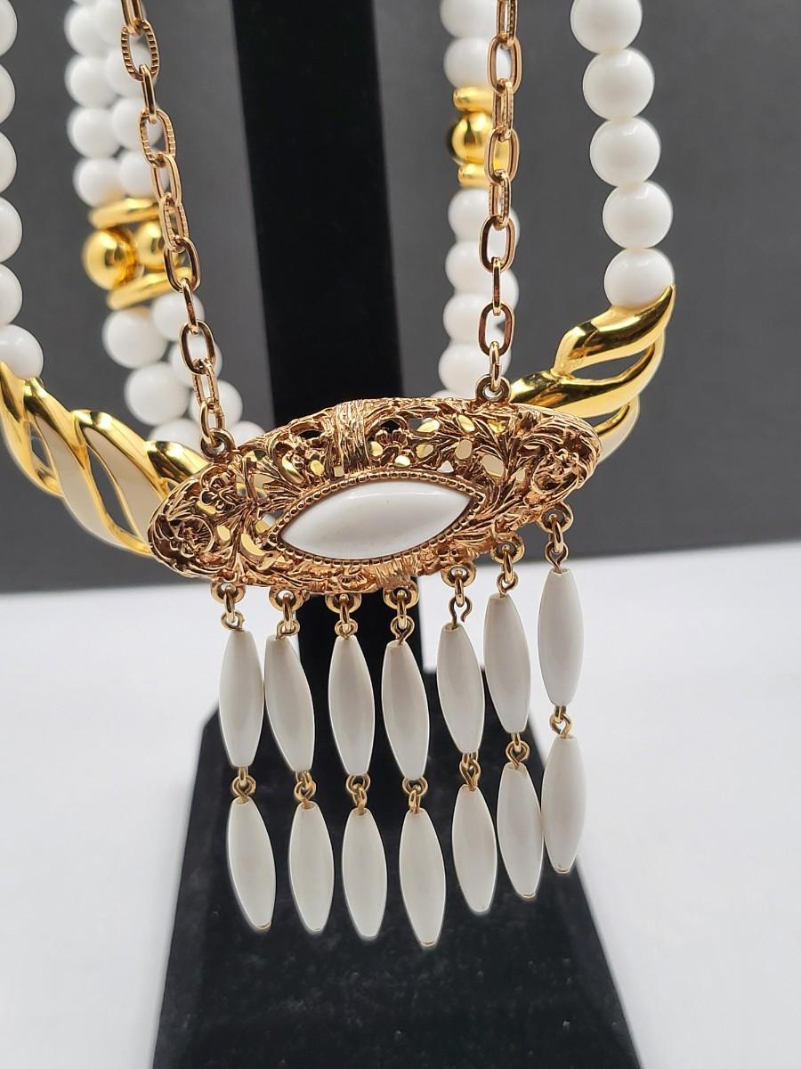 White bead and gold tone necklace trio - all signed - Monet, Napier and Emmons. 15" to 26".
