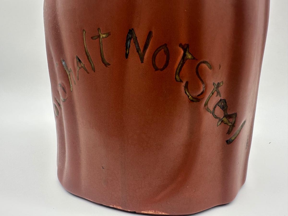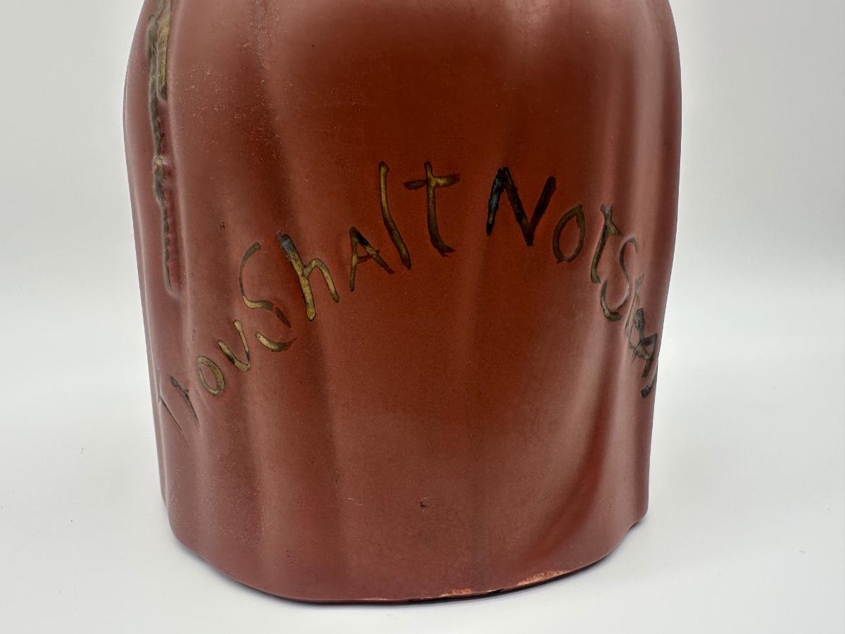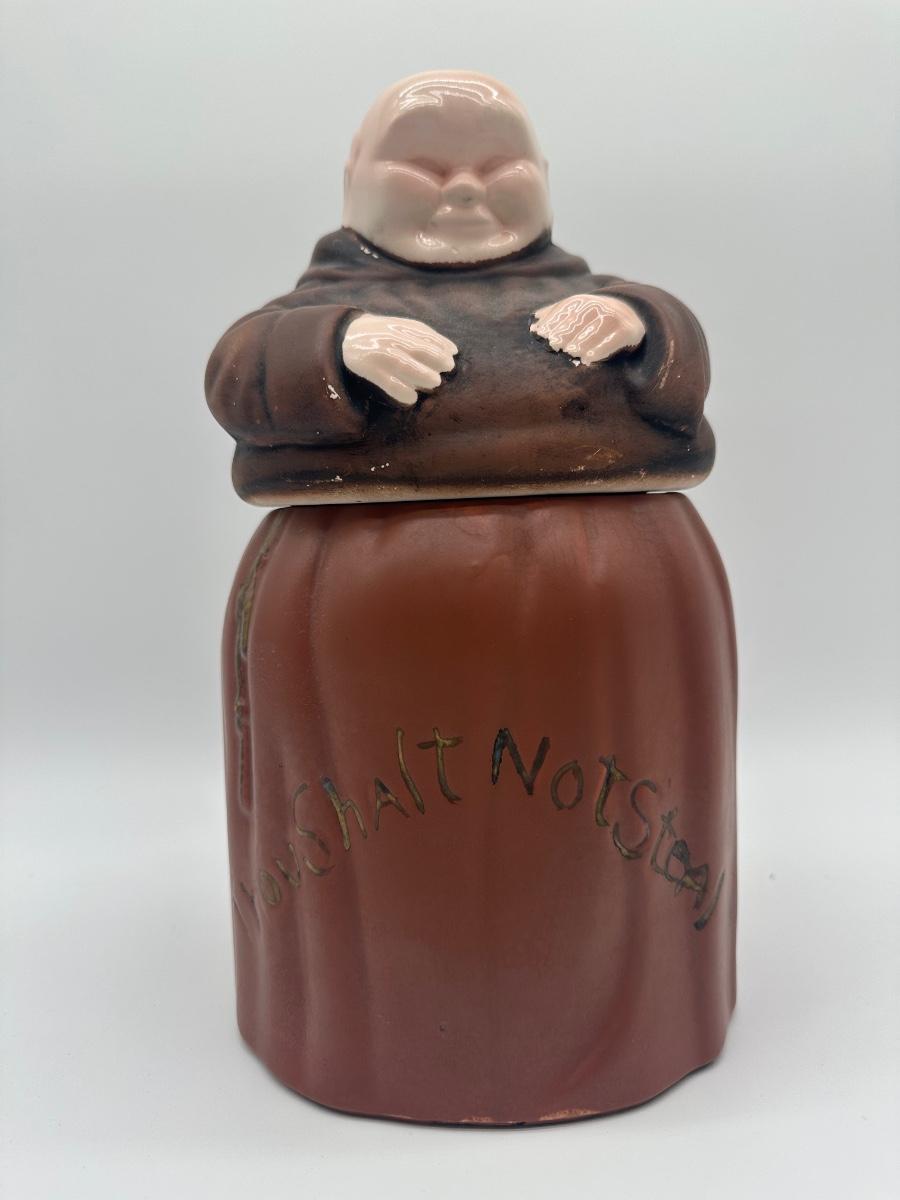 Vintage ceramic cookie jar featuring a smiling monk/friar lid and the phrase “You Shalt Not Steal” on the front. Brown robe glaze with hand-painted lettering.